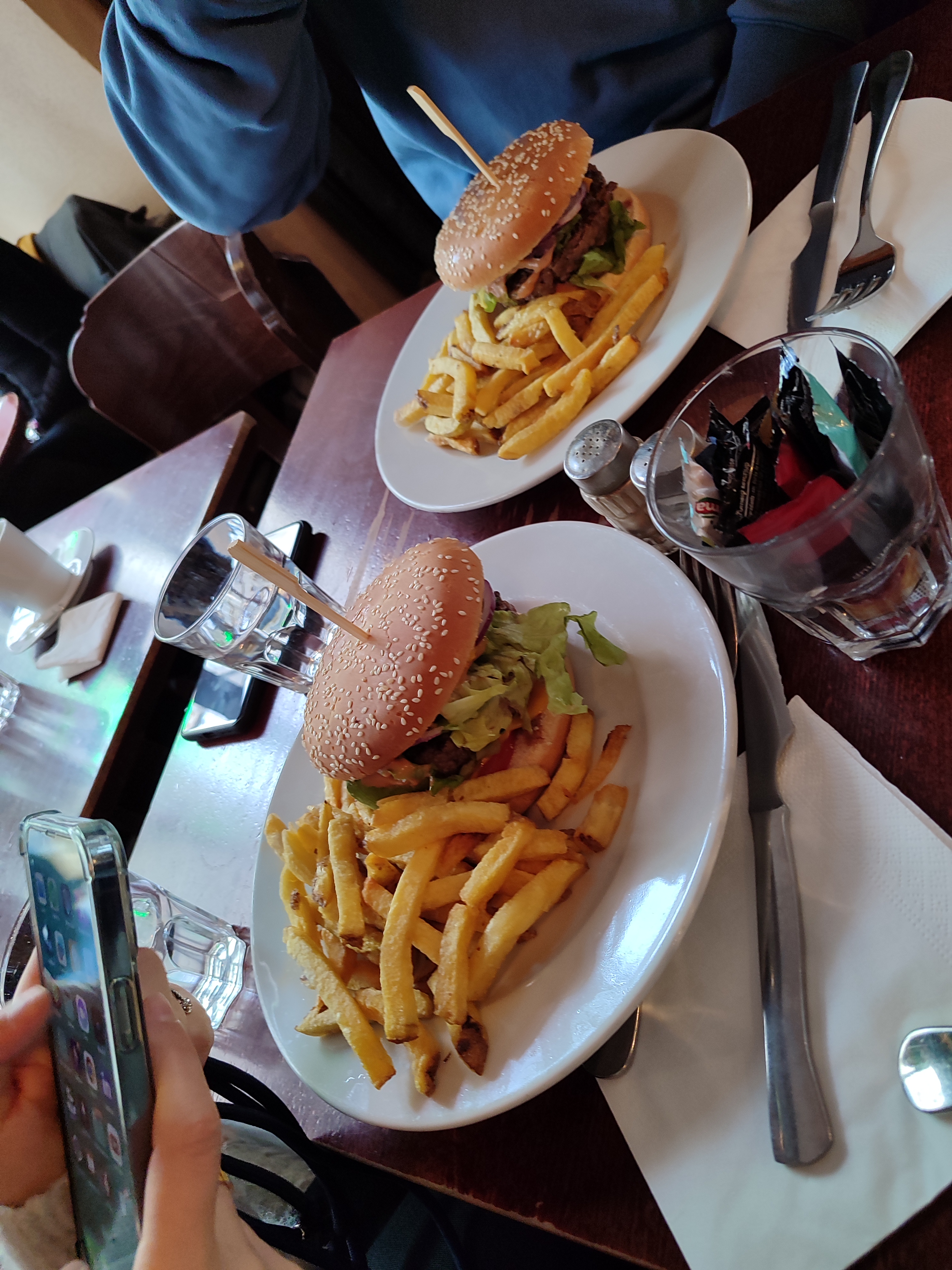 Malheureusement, nous avons été assez déçus, la nourriture était au mieux médiocre. Les pâtes étaient trop cuites, la viande du hamburger était sous-assaisonnée et l'une d'entre elles était encore un peu crue, les frites n'étaient pas bonnes non plus du tout. Le serveur était sympathique mais n'a pas noté la commande et a donc oublié deux de nos boissons.