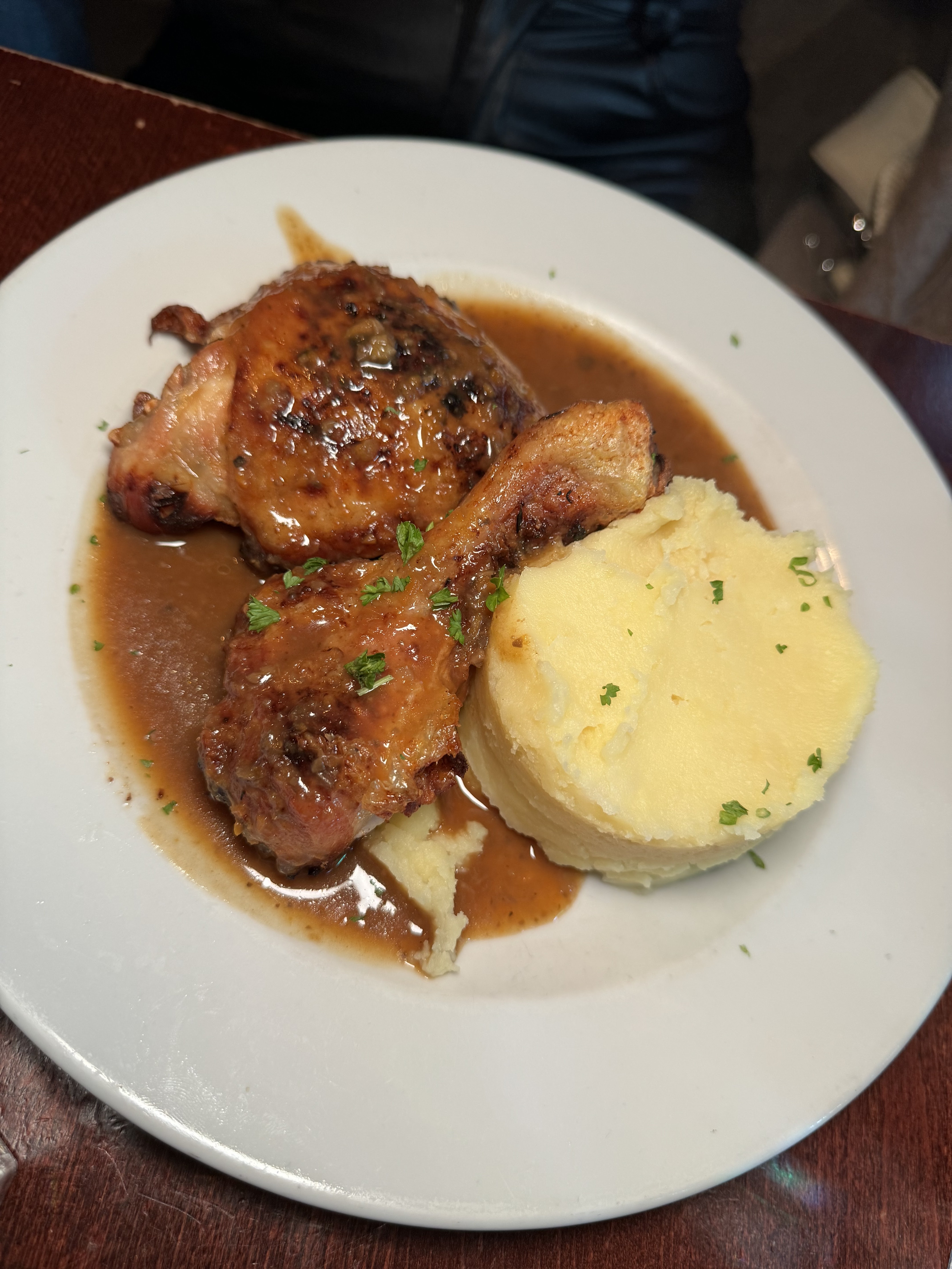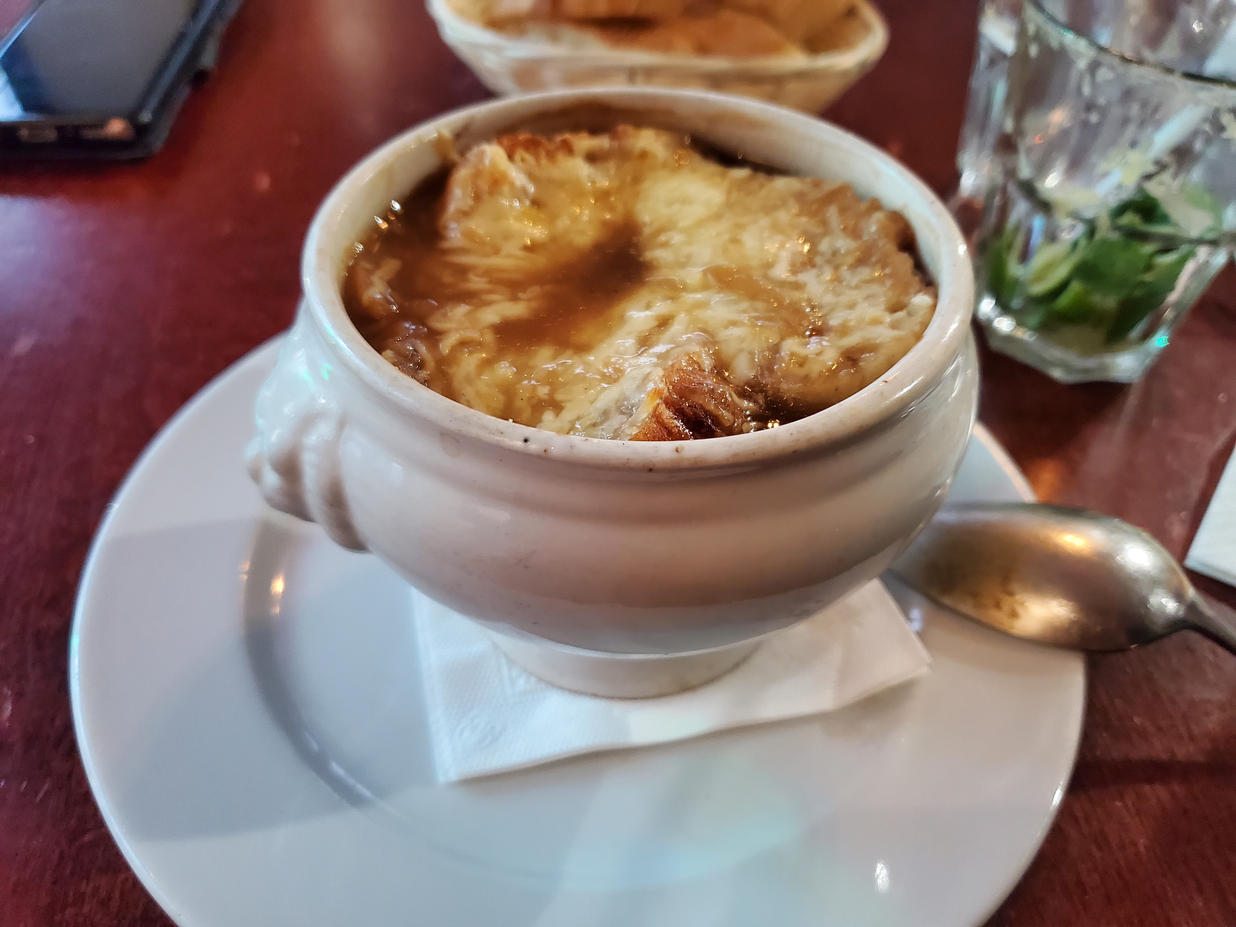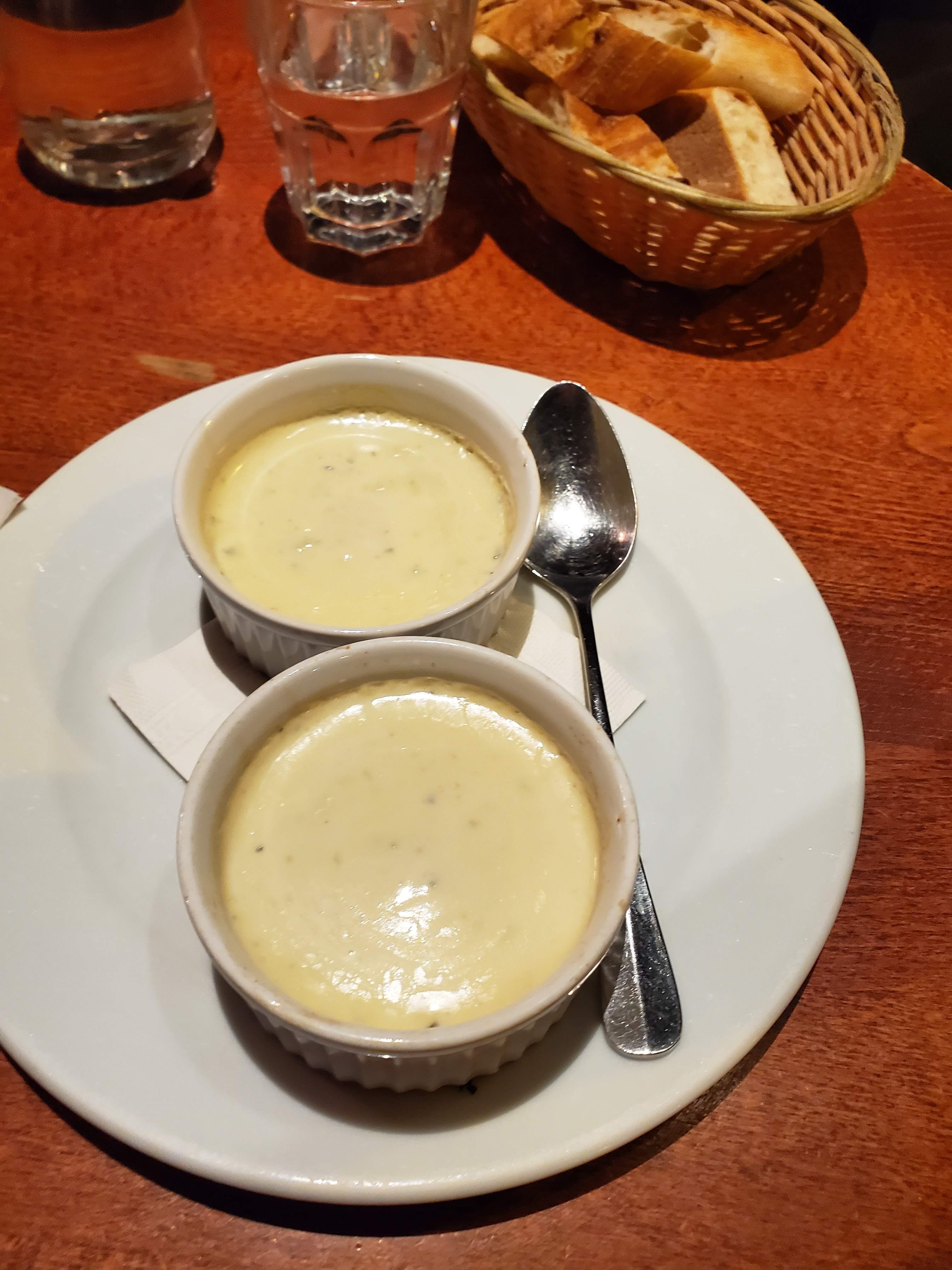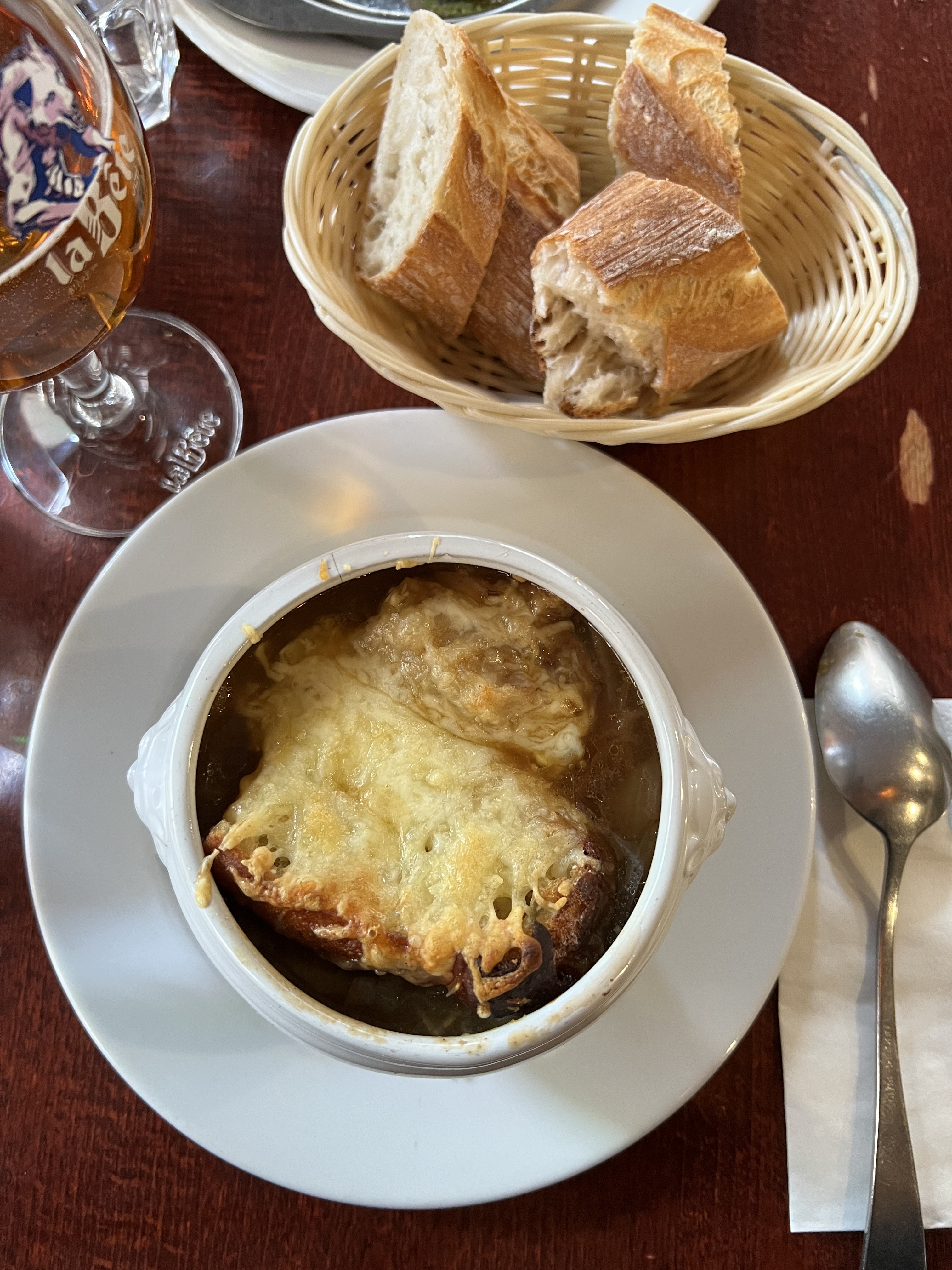 Malheureusement, les entrées comme la soupe à l'oignon et l'escargot ne sont disponibles que pour le dîner. Quoi qu'il en soit, il y avait un bon poulet rôti et une atmosphère cool.