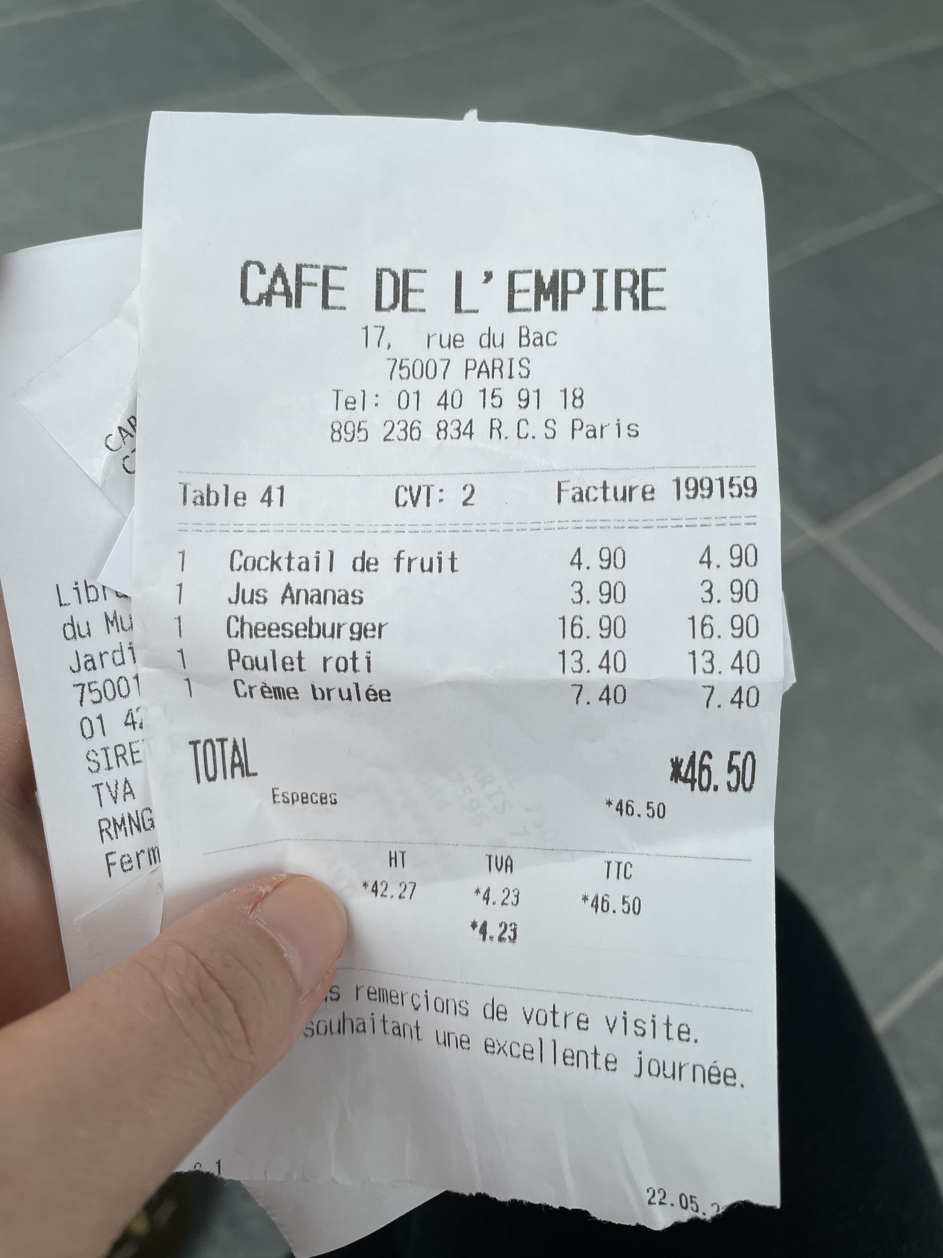 Le meilleur repas de Paris ! Nous avons dîné notre dernière nuit en ville au Café de l’Empire et c’était vraiment la meilleure cuisine française de notre voyage. L'escargot était exceptionnel et parfaitement cuit. La soupe à l'oignon était délicieuse. Nous avons eu le canard, la bavette, les pâtes et le poisson du jour. Ce sera un repas dont nous nous souviendrons toujours ! Pour le dessert, nous avons eu de la crème brûlée et du fondant au chocolat avec de la glace à la vanille. Il y avait aussi quelques verres de vin qui accompagnaient nos repas. Cet endroit est un joyau et je dînerais certainement ici lors de notre prochaine visite. Nos serveurs étaient super sympas et serviables. C'est un endroit fantastique à un prix extrêmement raisonnable.