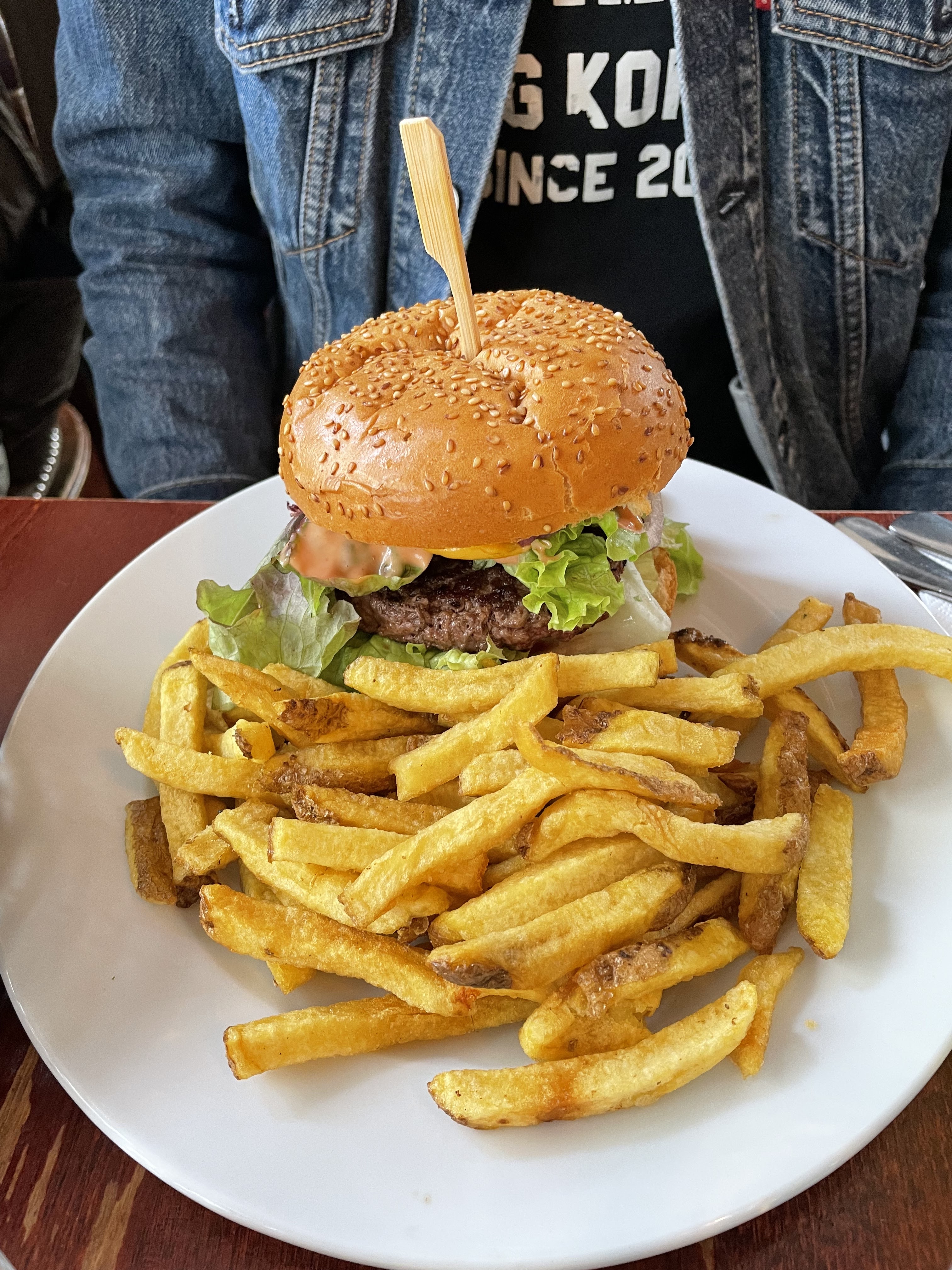 Le café était bondé avec une file d'attente, mais après un court moment, j'ai obtenu une table confortable pour deux, juste à côté de la cuisine. L'ambiance était cool et la nourriture était fraîchement préparée. Mon cheeseburger avec des frites était excellent, la viande parfaitement cuite. Je recommande vivement ce restaurant typiquement parisien, surtout pour un délicieux déjeuner !