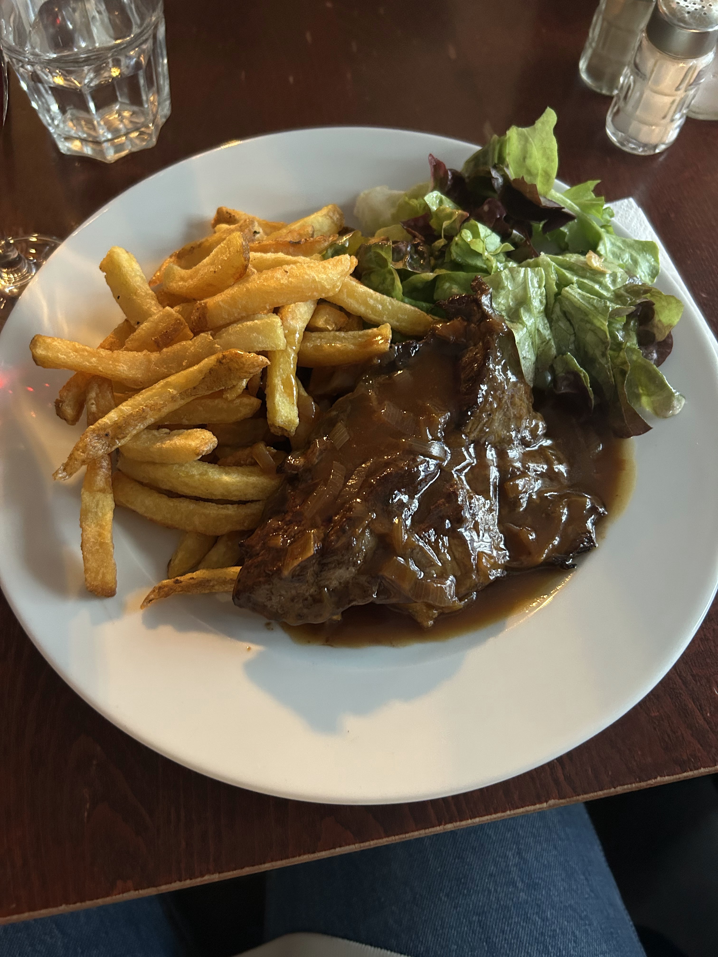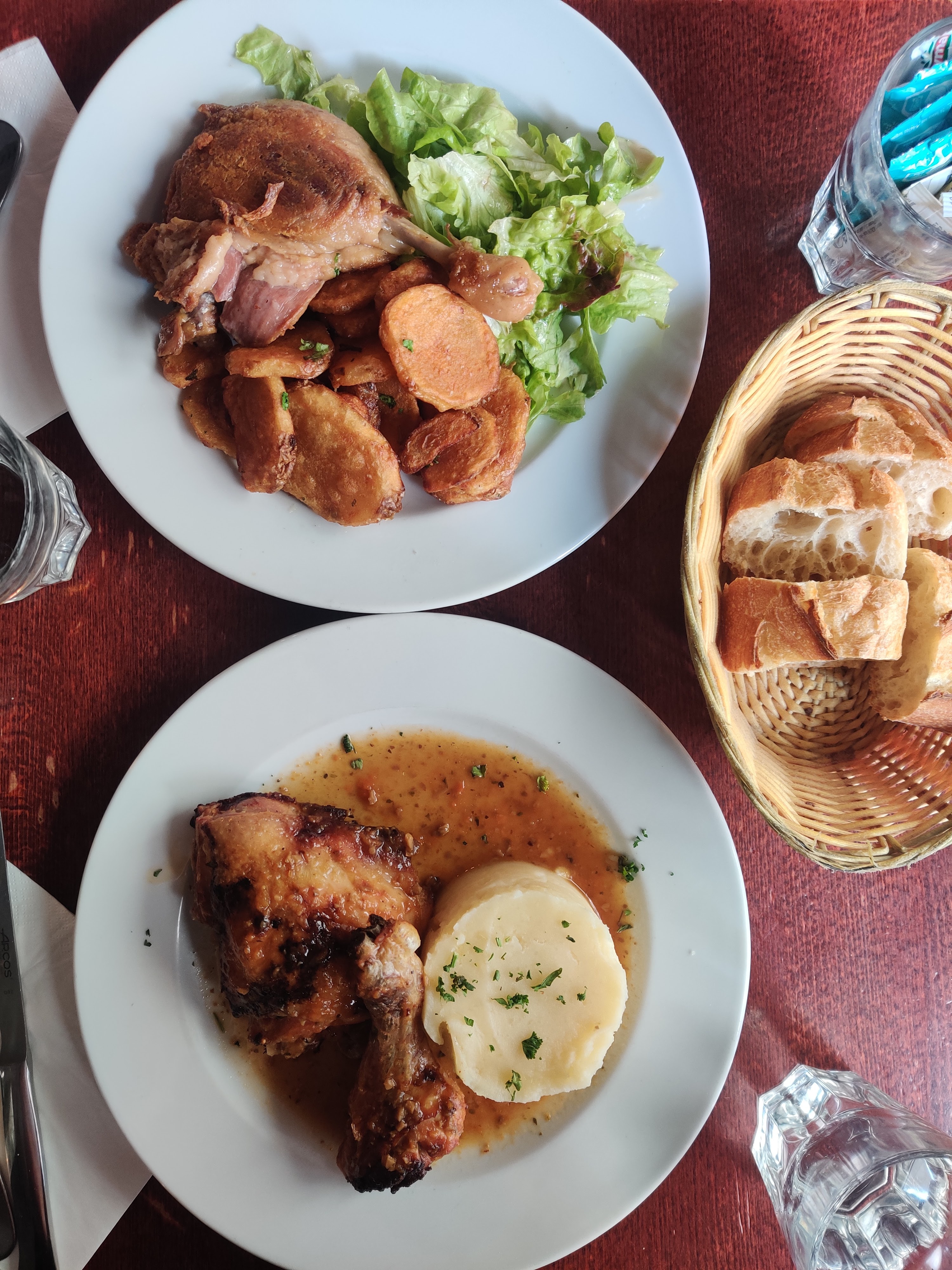 Le confit de canard était vraiment bon, accompagné de pommes de terre poêlées et d'une salade très fraîche. Mon fils a pris le steak frit et il a dit que c'était bien aussi. Nous avons commandé la crème brûlée en dessert et c'était très bon. Dans l'ensemble, la nourriture était vraiment bonne et le service était également très bon. Je vais lui donner un coup de pouce. Nous devons faire la queue pendant 20 minutes et l'espace était restreint. Nous étions assis sous un escalier, à part ça, tout allait vraiment bien.