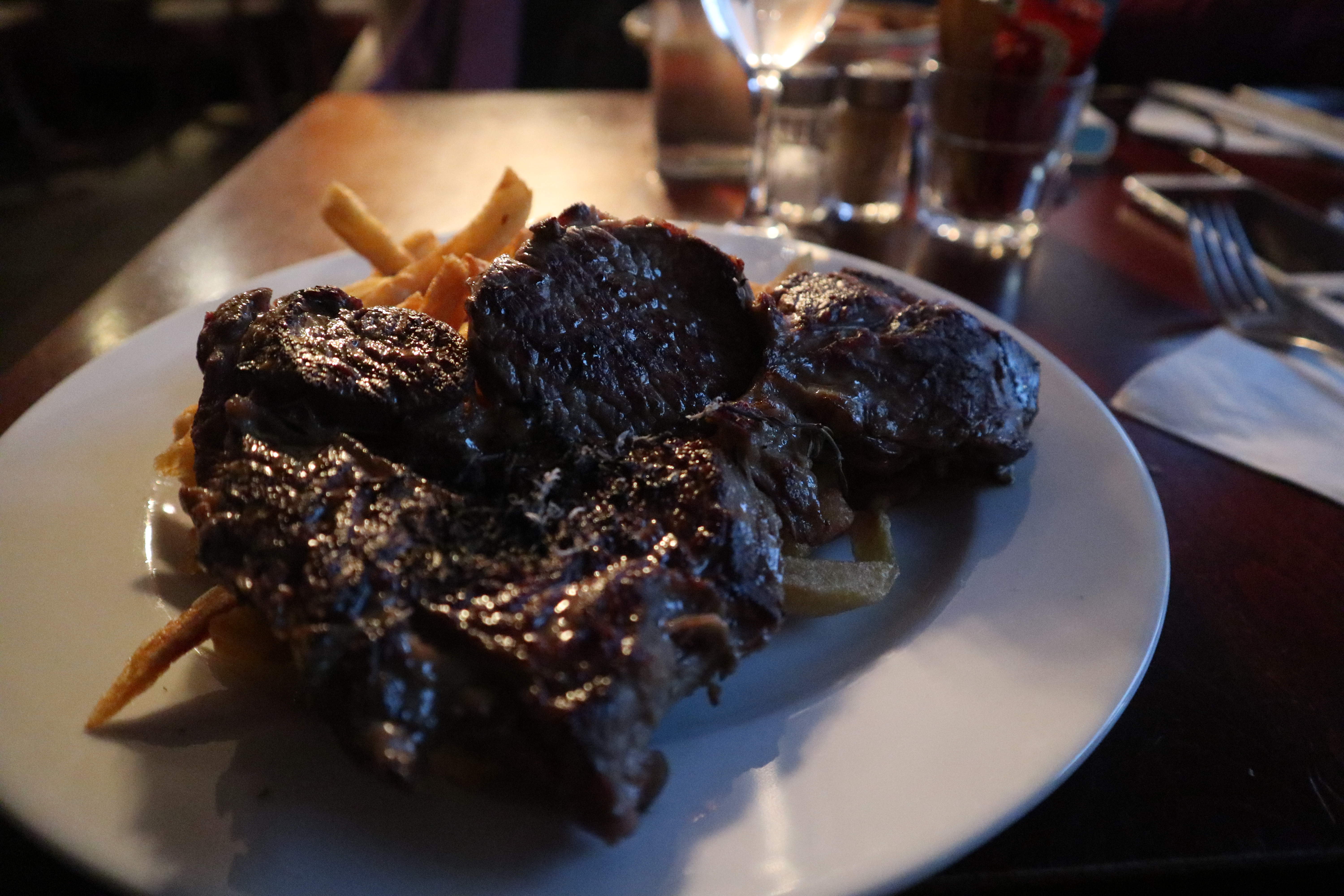 Le restaurant offre un prix très abordable, mais mon expérience avec le steak et les frites a été décevante. Le steak mi-saignant était pratiquement immangeable; c'était si dur que j'avais du mal à le couper même avec un couteau émoussé, ce qui me faisait racler l'assiette à plusieurs reprises. De plus, étant donné l’atmosphère chargée, attirer l’attention d’un serveur peut être difficile. Malgré son prix abordable, je ne choisirais pas de retourner dans cet établissement.