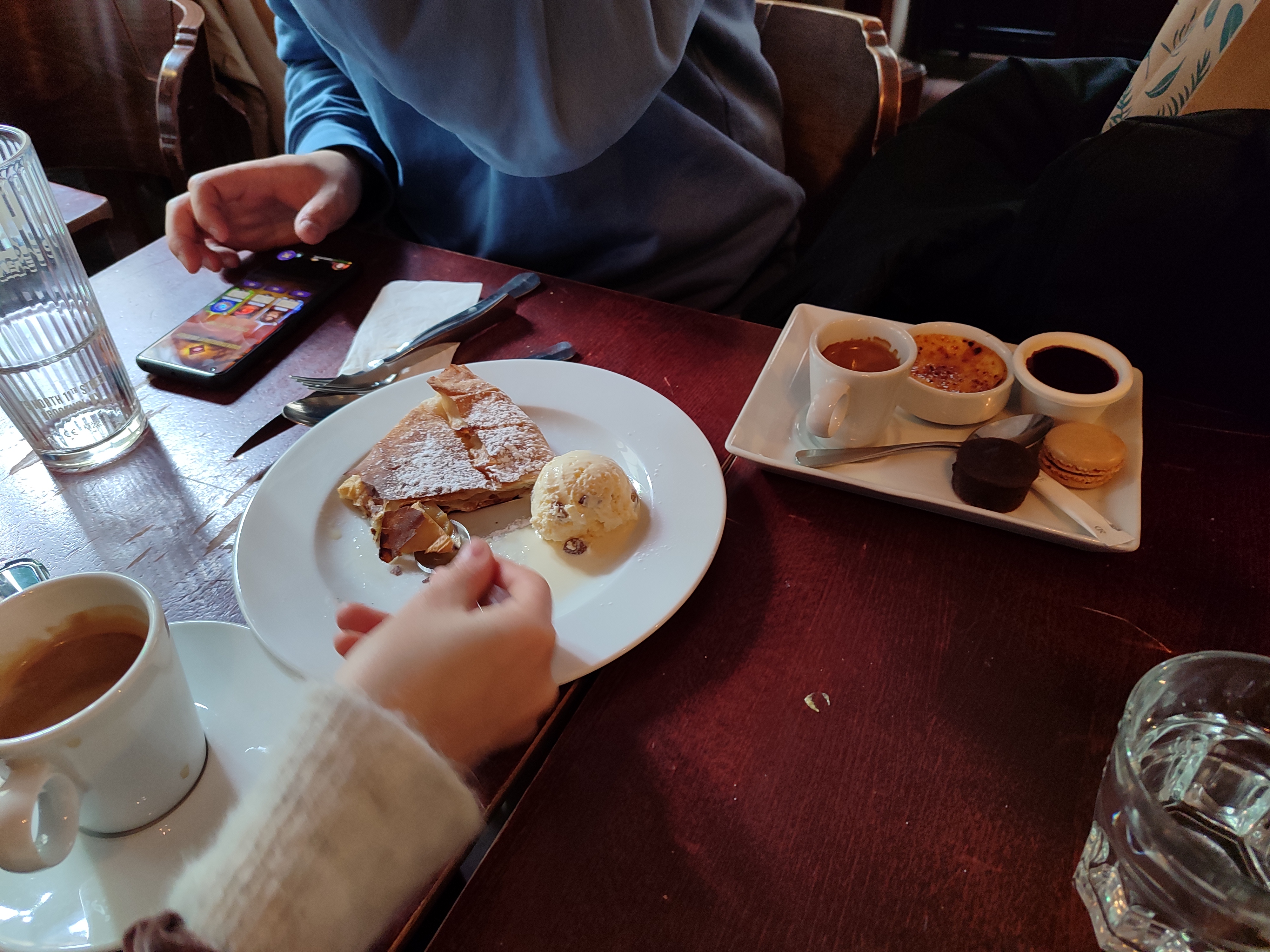 Nous avons trouvé ce petit bijou en nous promenant dans Paris. Excellente nourriture et desserts à un prix si abordable. Nous avons commandé trois plats principaux, confit de canard, pièce du boucher (steak) et viande jour (jarret d'agneau), ainsi que trois café gourmand (mini desserts assortis). Le tout pour un peu plus de 50 euros. Recommande fortement.