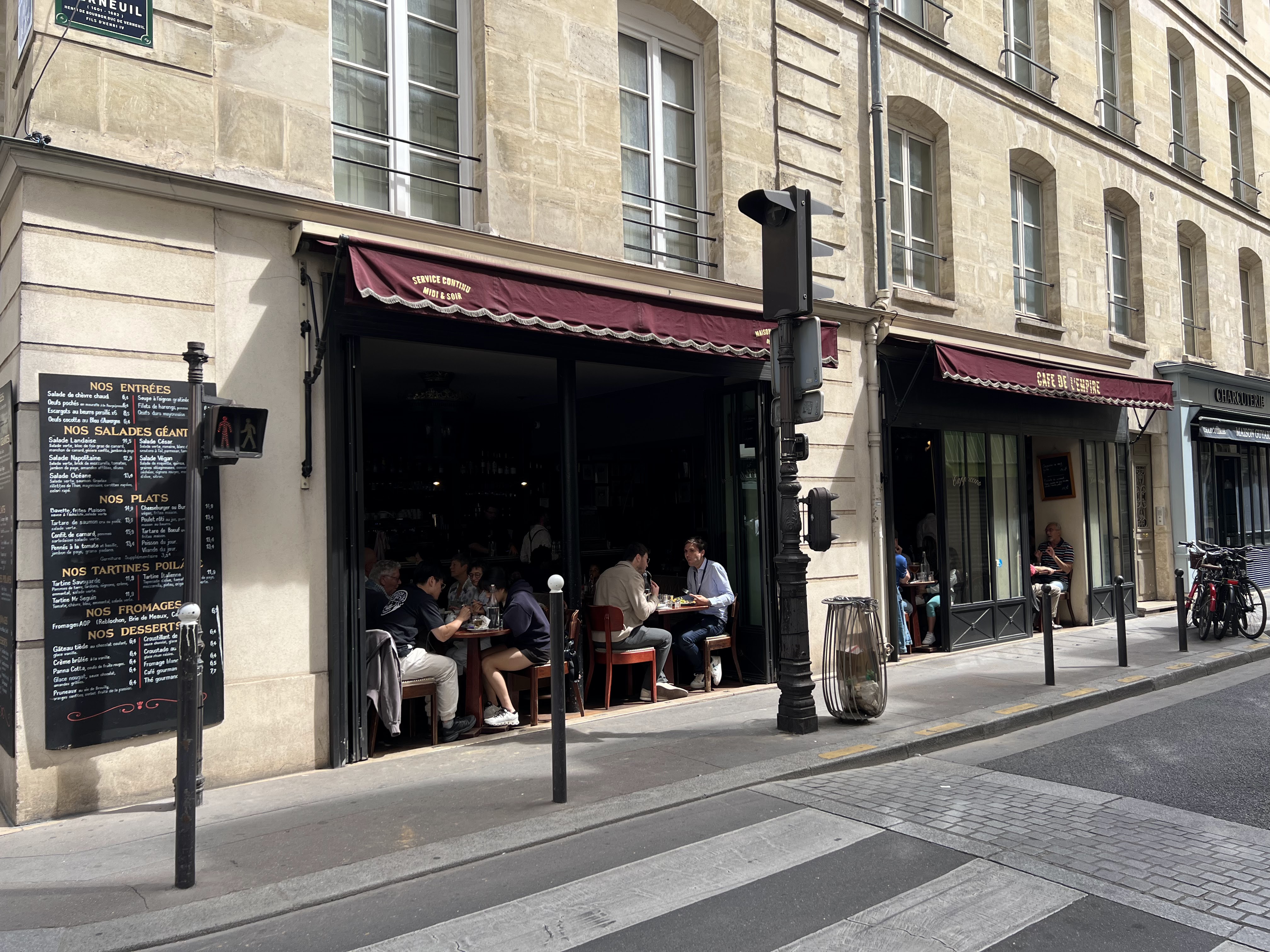 Le Café de l'Empire était un si bon repas que nous y avons mangé deux fois lors d'un récent voyage à Paris. C'est dans un emplacement très pratique si vous faites des activités touristiques le long de la Seine. Je recommande vivement le Confit de Canard. De plus, la crème brûlée accompagnée d'une tasse d'espresso est une excellente façon de terminer un repas ici !