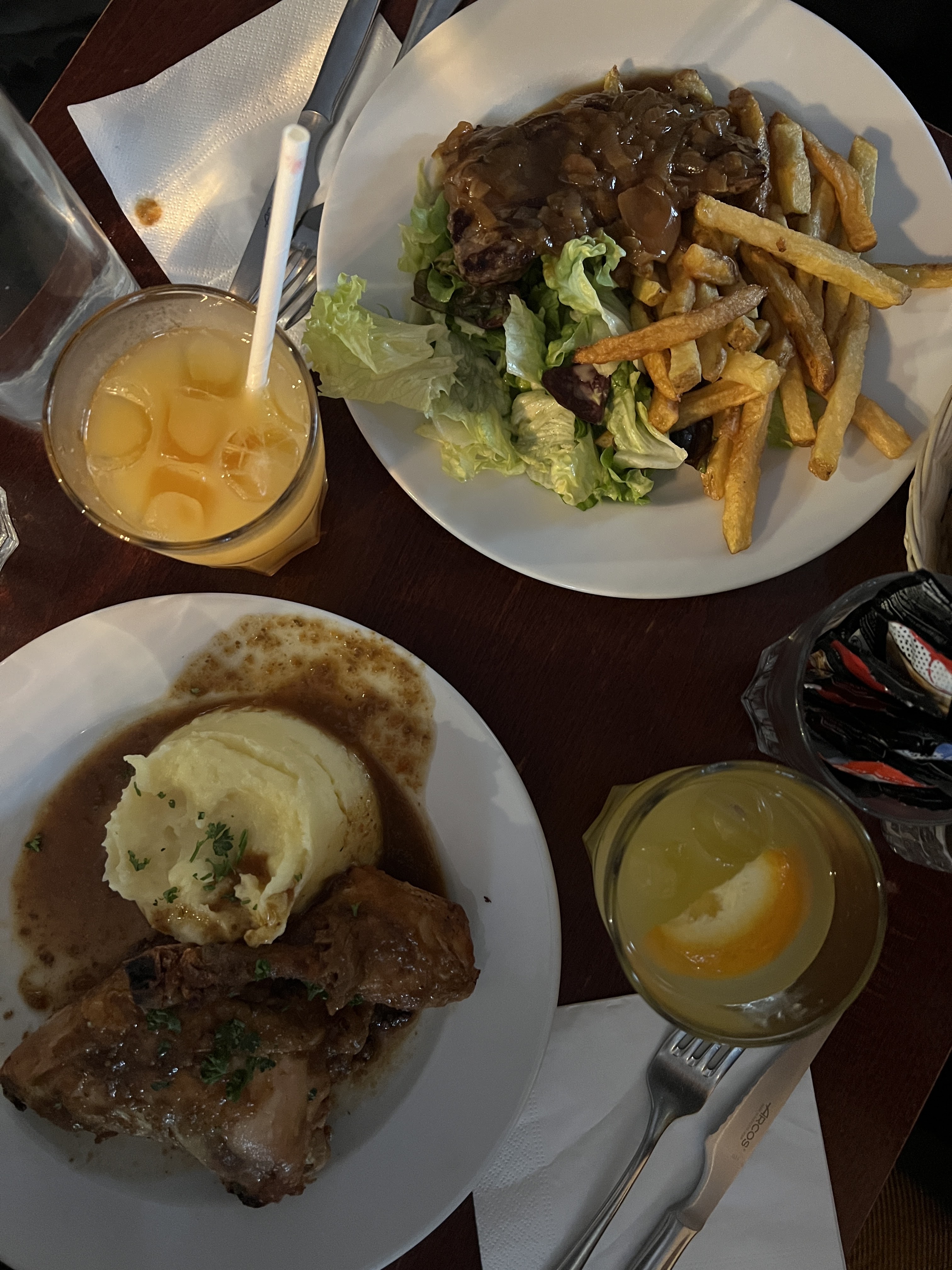 Les plats sont très aléatoires. Le canard et les pommes de terre étaient bons, mais le steak était très moelleux et trempé dans une sauce qui avait le goût d'un ragoût de bœuf en conserve. Les frites étaient sans saveur. Nous avons également eu le plaisir d'être assis directement à côté des poubelles lors du passage du camion poubelle. Je ne sais pas si je reviendrais.
