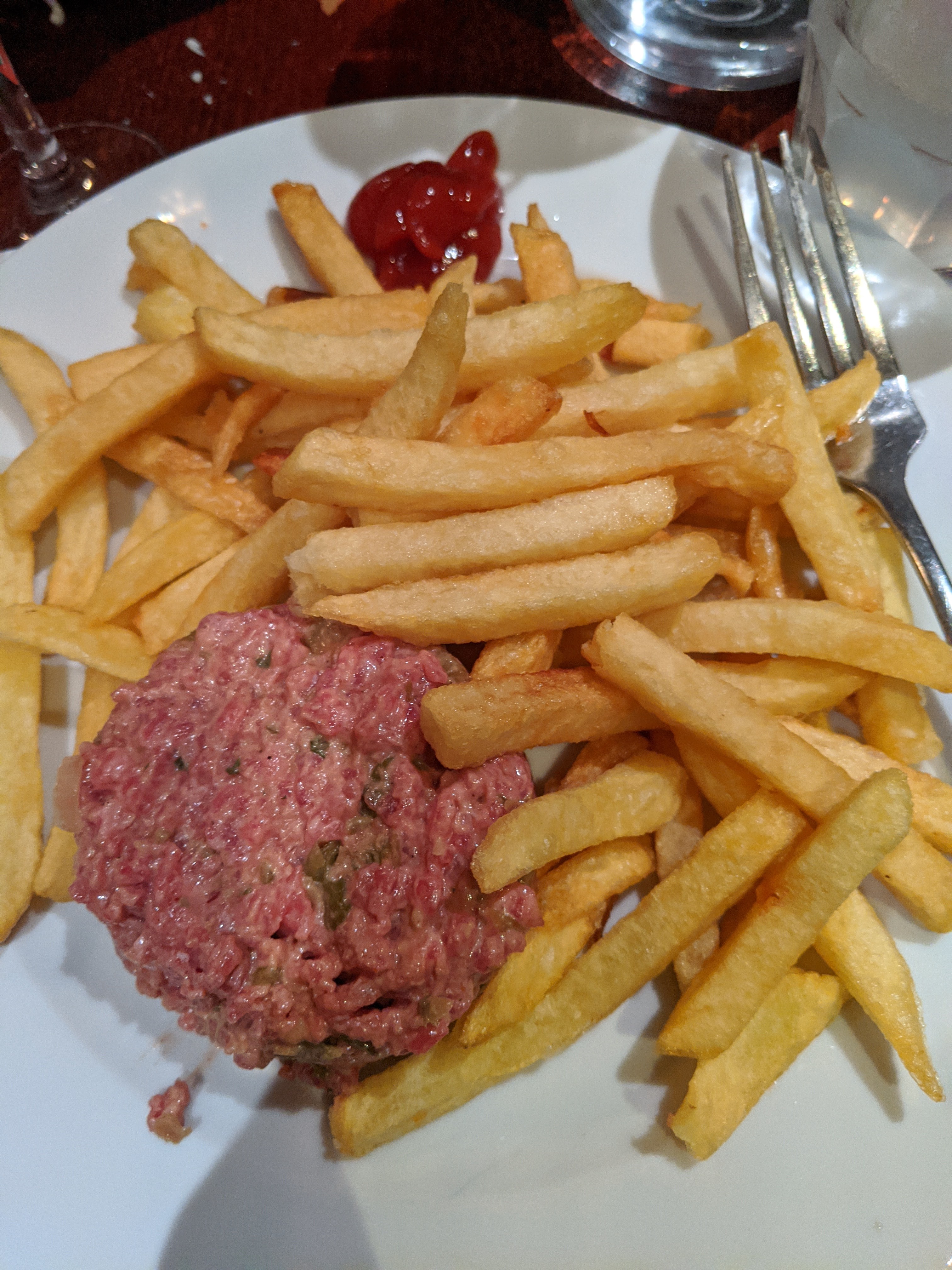 Nourriture de bonne qualité au prix relativement bas du plat principal! Les plats varient de 10 à 14 EUR seulement. j'adore leur carpaccio de bœuf et leur soupe à l'oignon ! Le saumon cru est également excellent avec une portion généreuse. Dommage que les chips soient trop frites. L'escargot est juste Essayez-le si vous recherchez des plats copieux et ne voulez pas vous ruiner. Leur personnel est très occupé mais fait de son mieux pour vous servir. Alors attendez-vous à attendre un peu Nourriture : 4/5 Prix : 5/5 Prestation : 4/5
