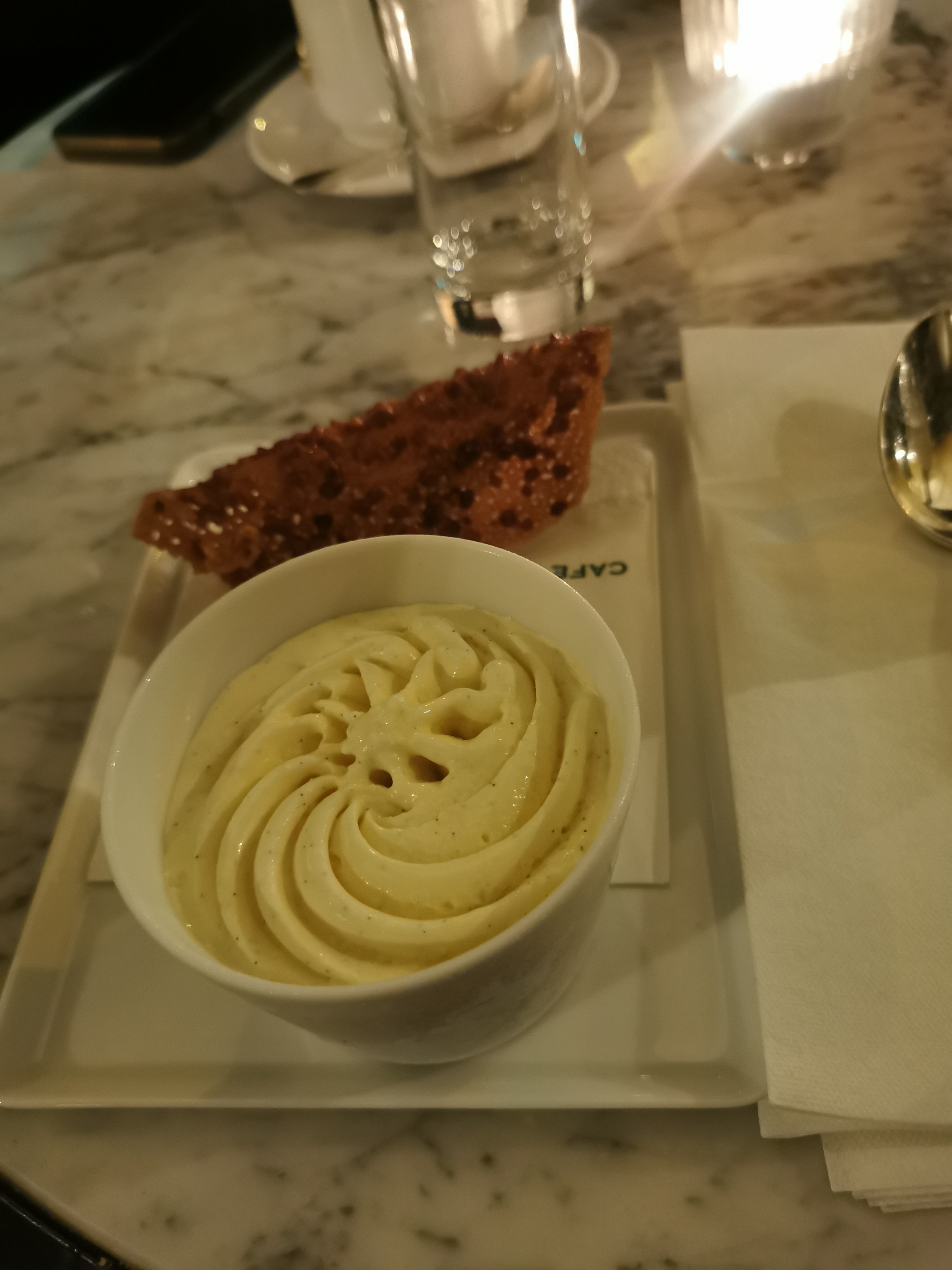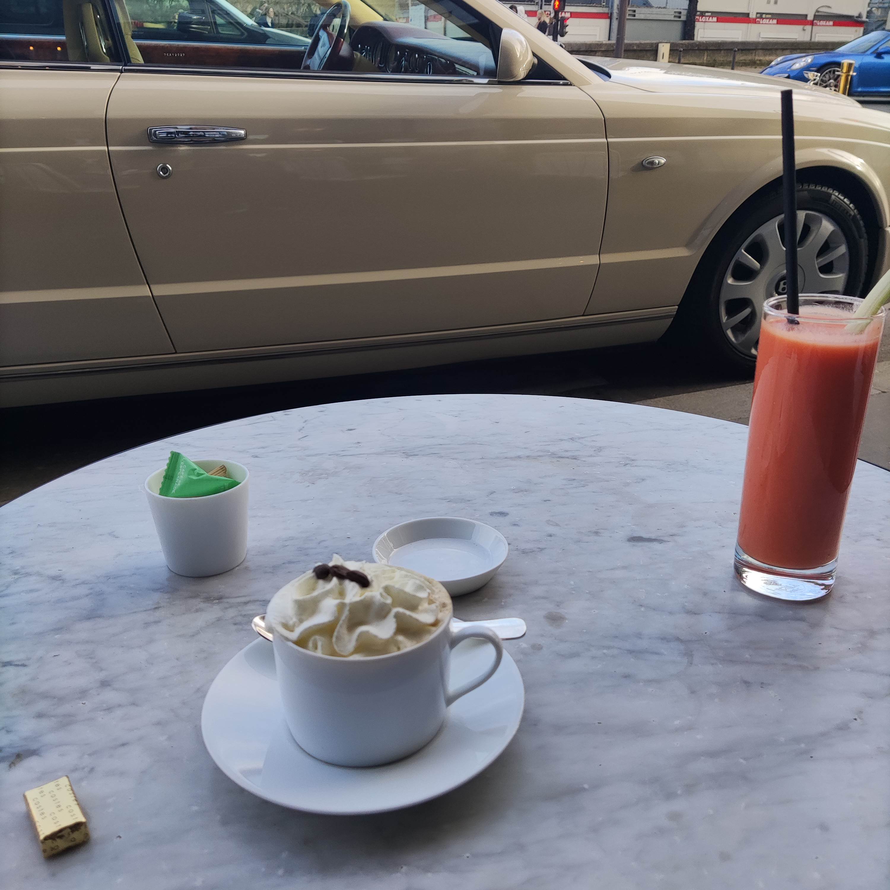 Juste pour prendre un verre, un jus de tomate et un viennois. Première visite avec mon fils, en terrasse un atout la vue sur les Invalides et de son parc. Alors pour le café viennois servi dans une tasse moyenne, café tiède chantilly il me semble vu la texture en bombe ! 10€ j' ai bien compris que nous payons le cadre mais faites au moins un effort avec un contenant verre transparent et de bonne taille c'est un viennois. Le jus de tomate rien a dire. Service un peu long, idem pour le rendu de monnaie.