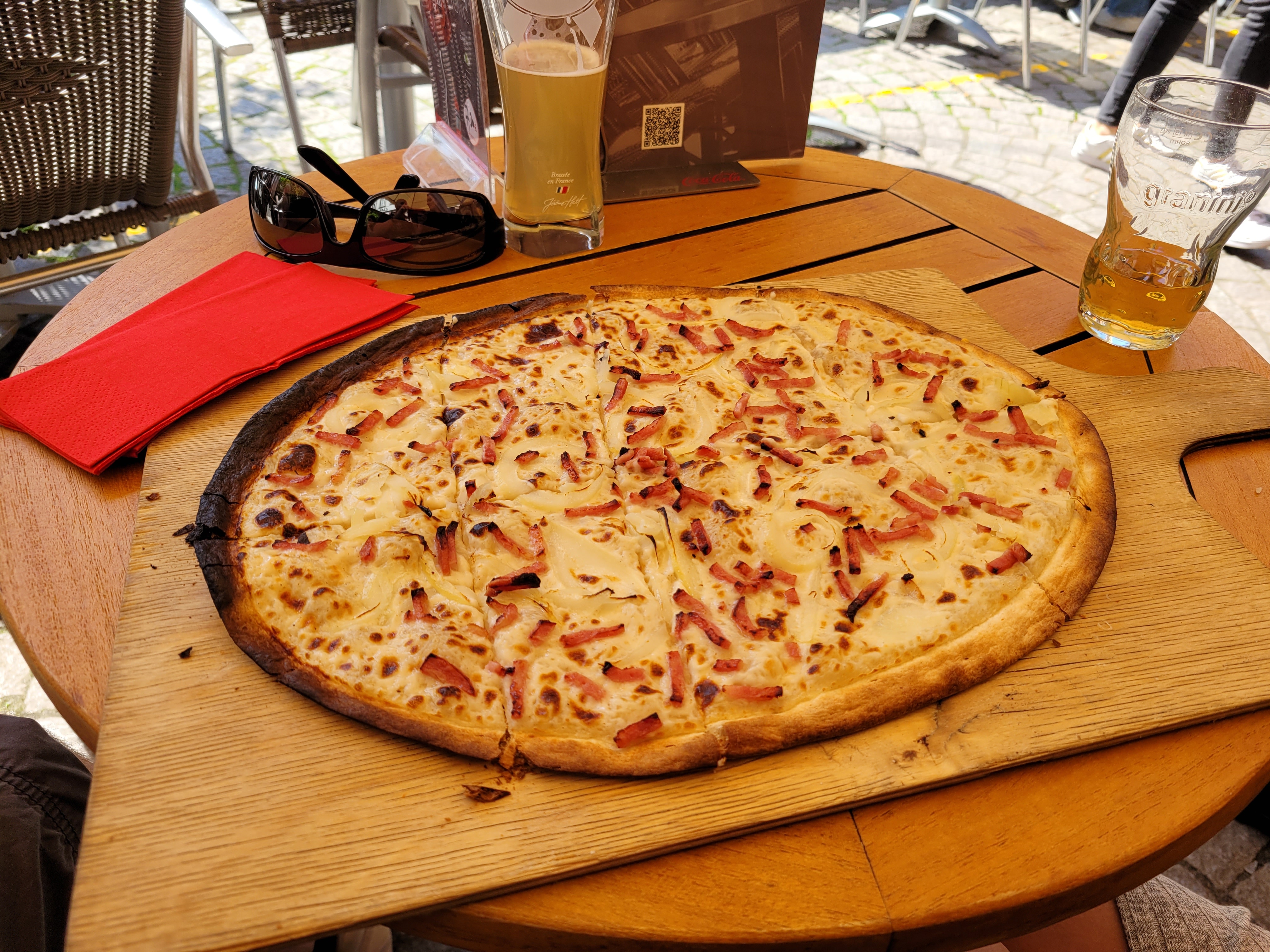 Personne accueillant et souriant, service rapide, un petit quart de soleil, rare sur les terrasse de Strasbourg en fin de journée tarte flambée pas assez cuite.