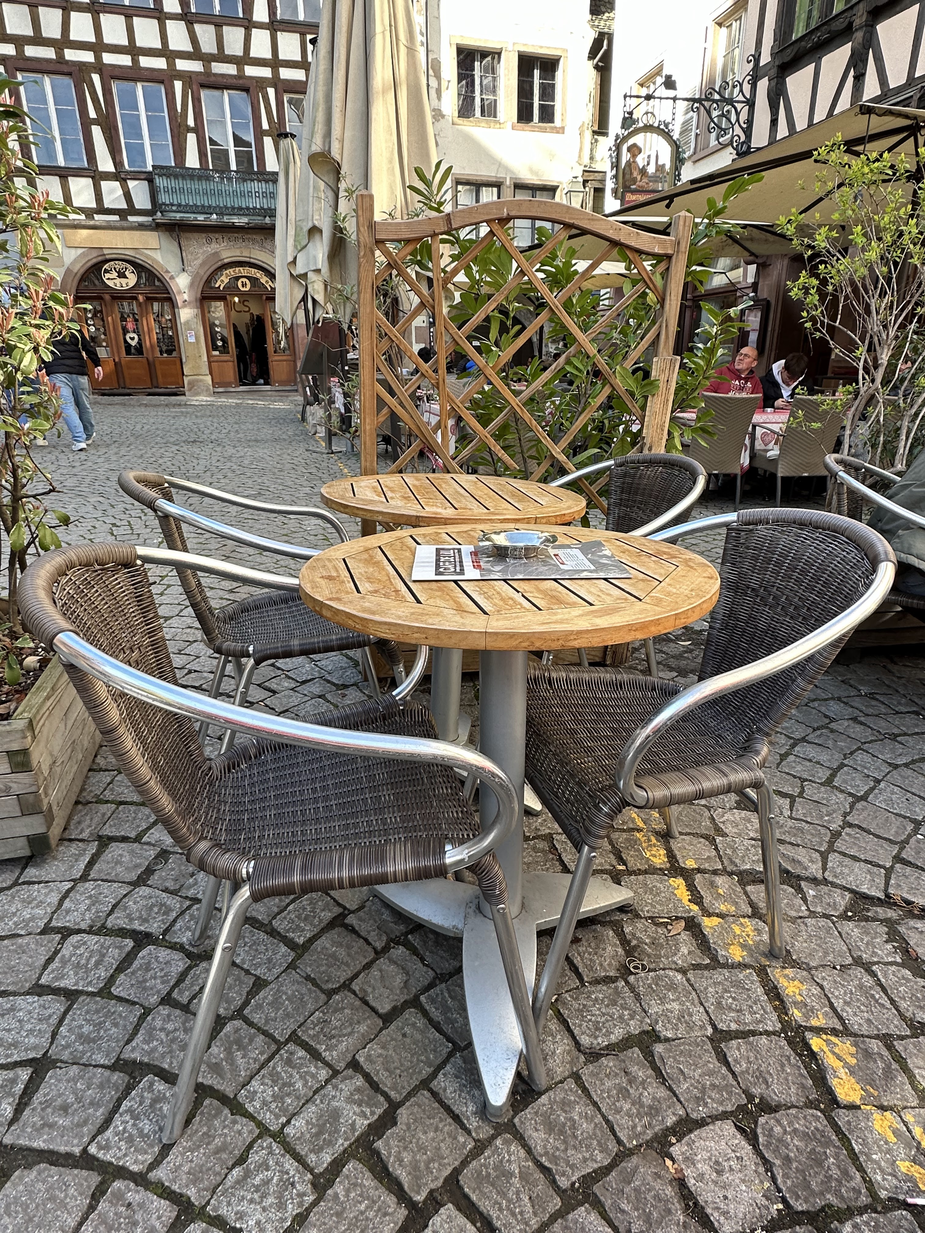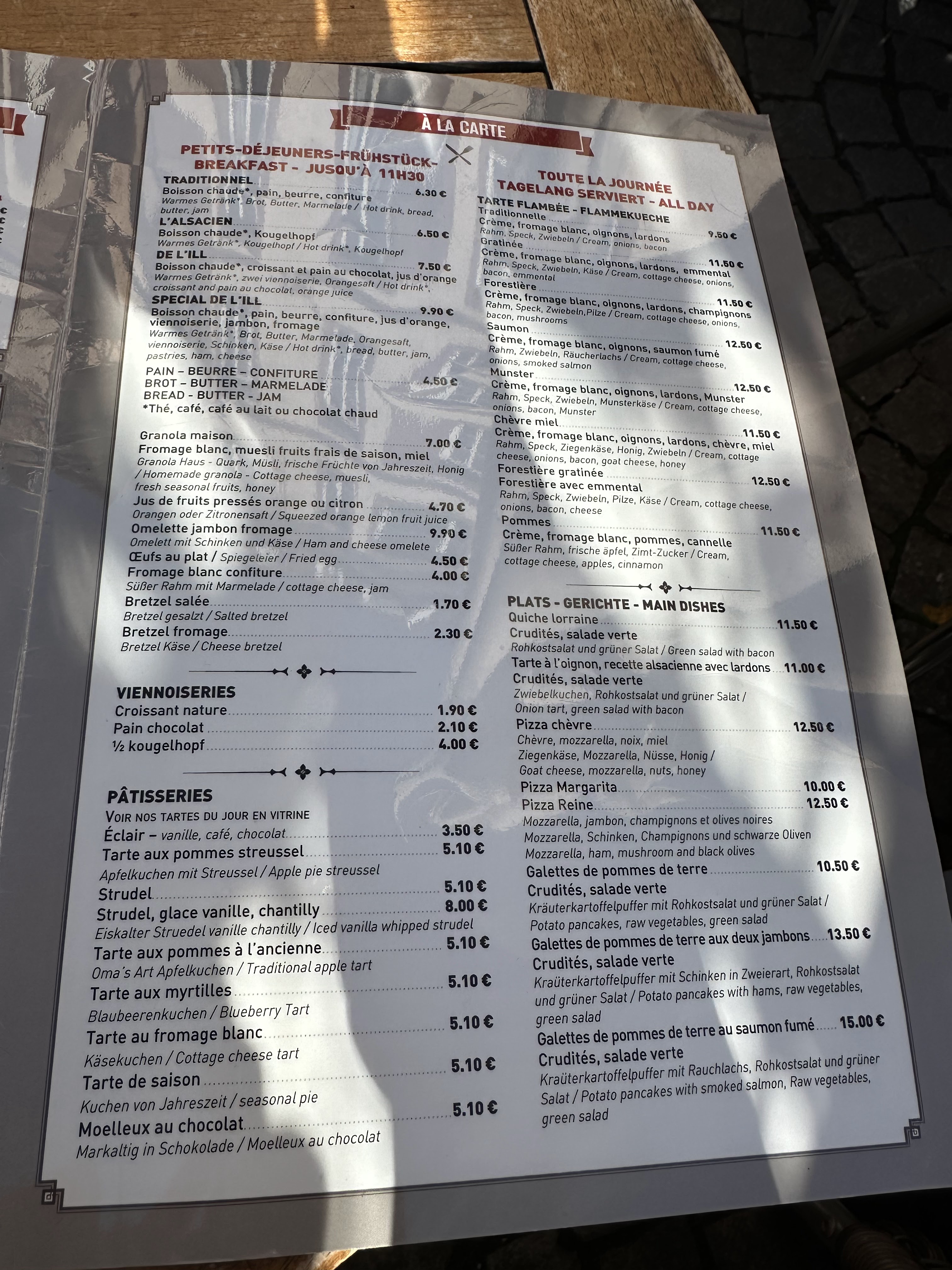Les serveurs sont très sympas donc pas de mot à dire par rapport à leur service. Cependant j'étais déçu avec le petit déjeuner Alsacien - le pâtisserie étant un peu sec et sans goût. Le cappuccino aussi était beaucoup trop de lait pour une trop petite dose d'expresso. J'avais l'impression de boire que du lait chaud. Aussi sachez qu'il y a beaucoup d'abeilles qui ne laisseront pas tranquille et qui vont se poser sur les pâtisseries. Ce n'est pas la faute de l'établissement mais hélas ça rend l'expérience un peu frustrant j'avoue