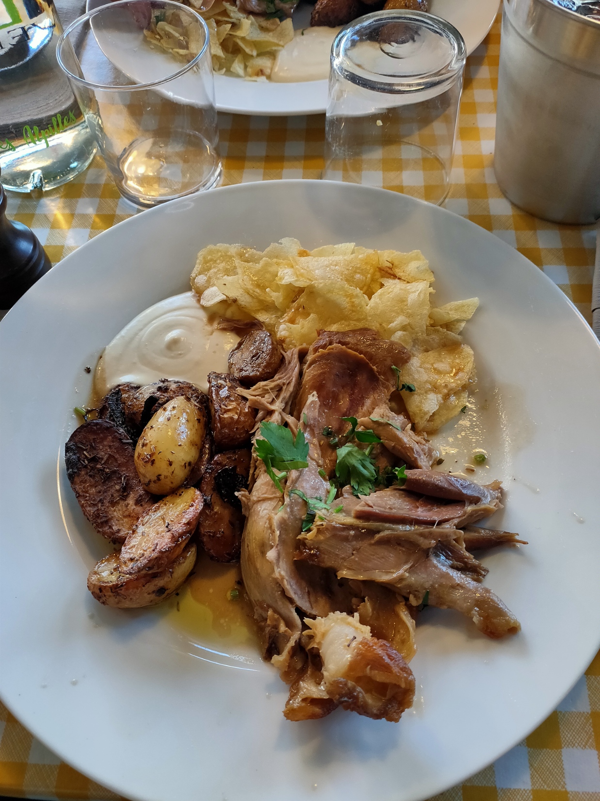 Le dimanche c'est le jour de l'agneau des Alpilles, cuit durant de longues heures à basse température. C'est divin !!! Servit avec des pommes grenaille et... des chips 🥴 A la place des chips, une bonne roquette, serait la bienvenue 😁