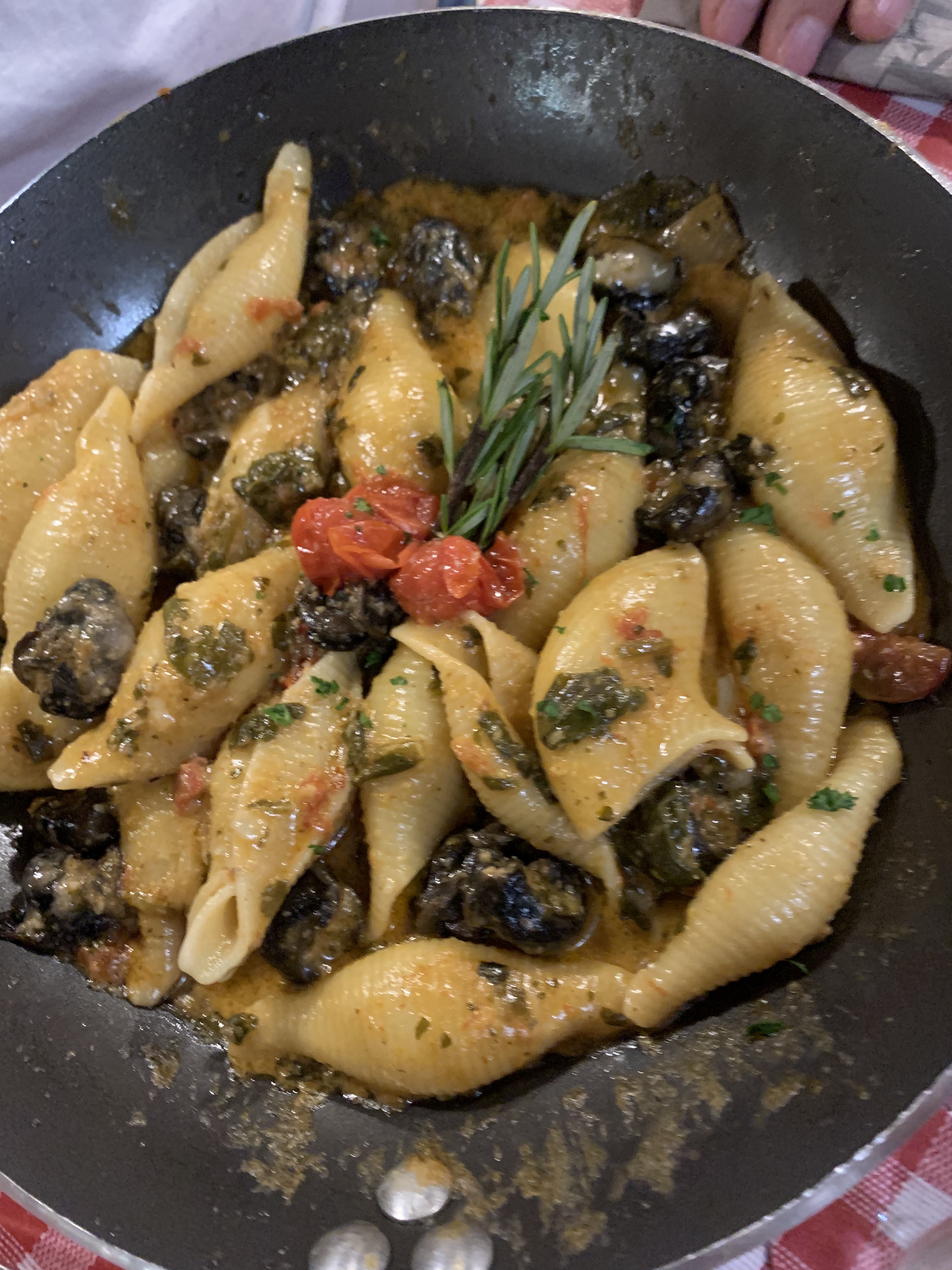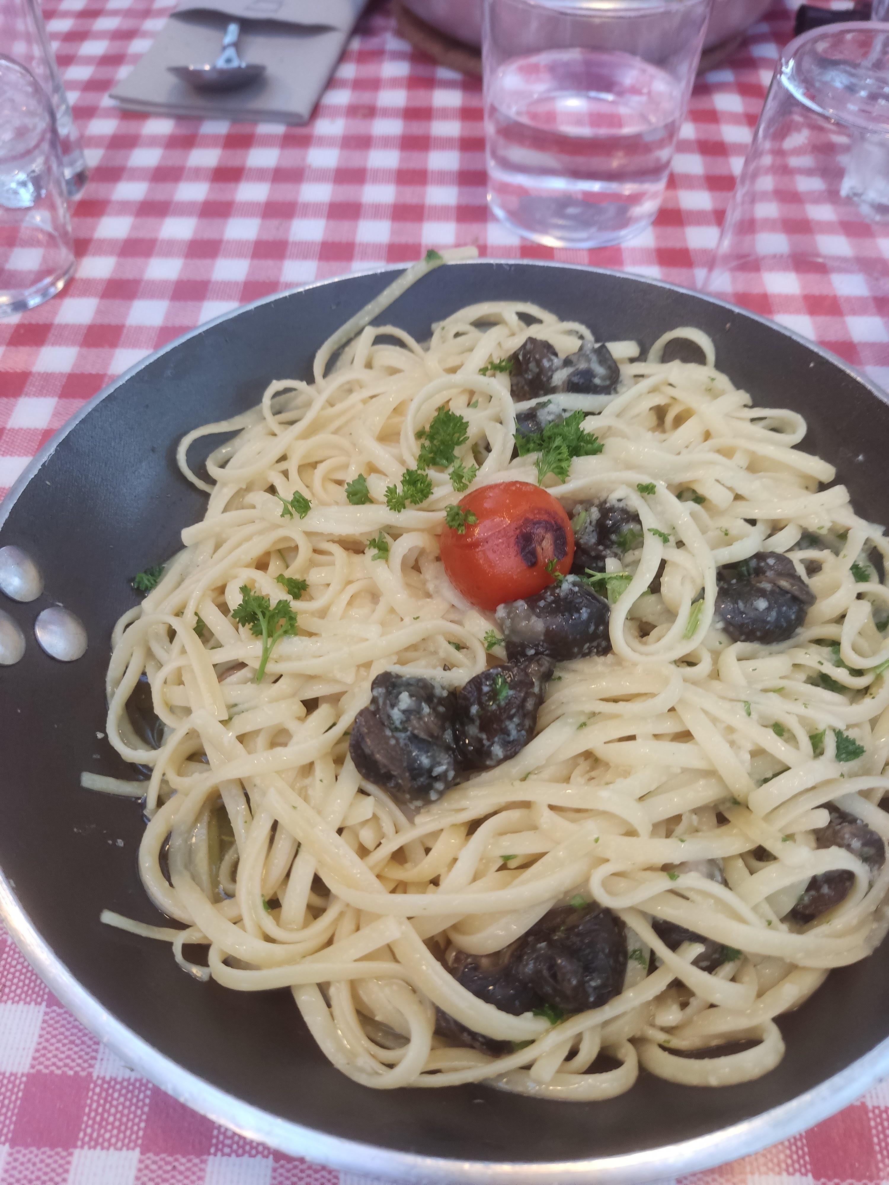 Délicieuse pâte servies dans une poêle .j'ai pris les coques avec encornets farcis un délice .je recommande serveur très sympatique