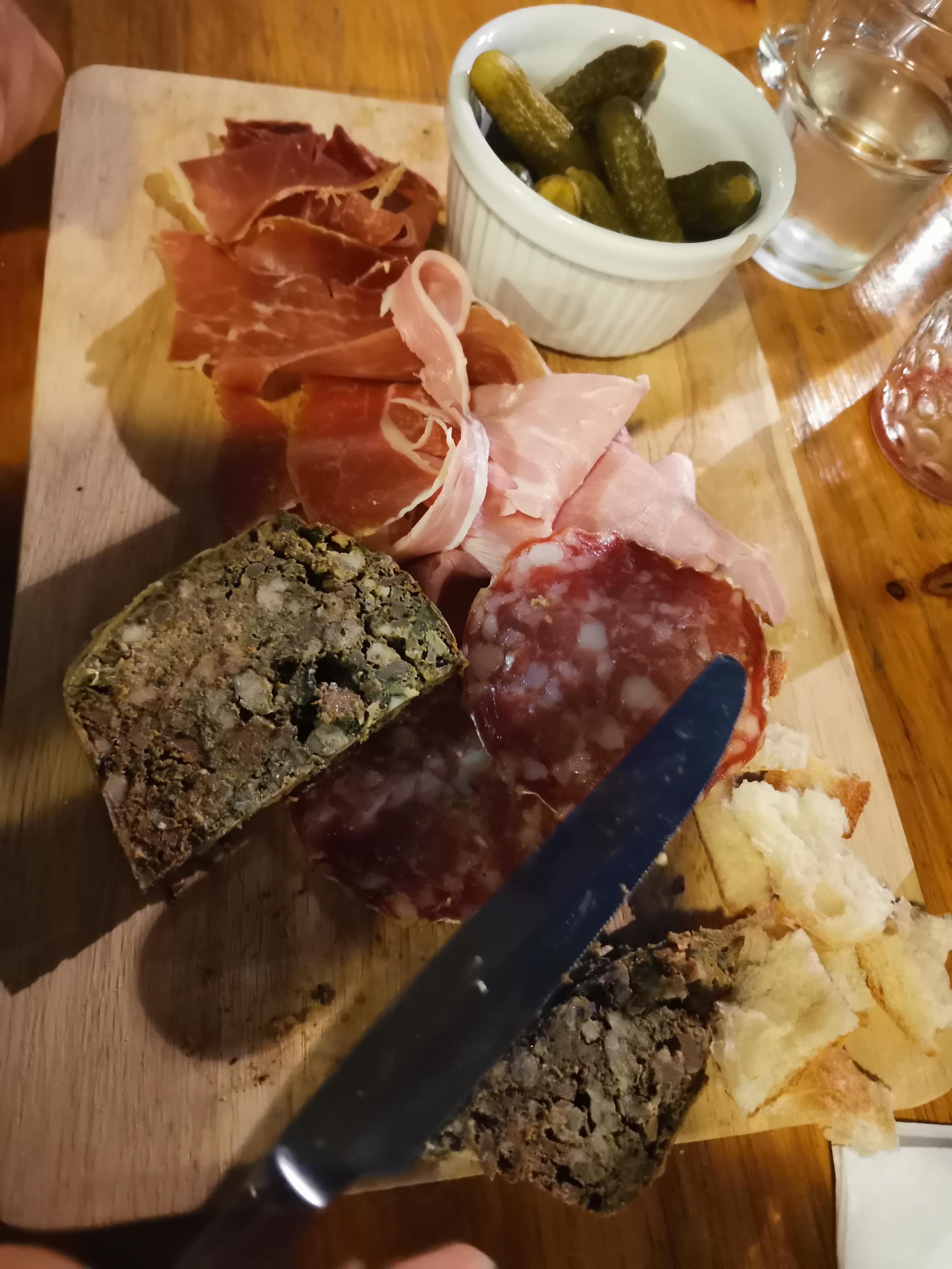 Très bon service! Le serveur parlait un anglais parfait et nous a mis à l'aise, car notre français fait défaut comme nous l'avons trouvé. C'était/est notre première fois en France/Dijon. C'est un petit restaurant étroit et il semblait rempli de locaux. Le plateau de viande et de fromage avec du pain français était délicieux. La vaste sélection de vins était impressionnante.