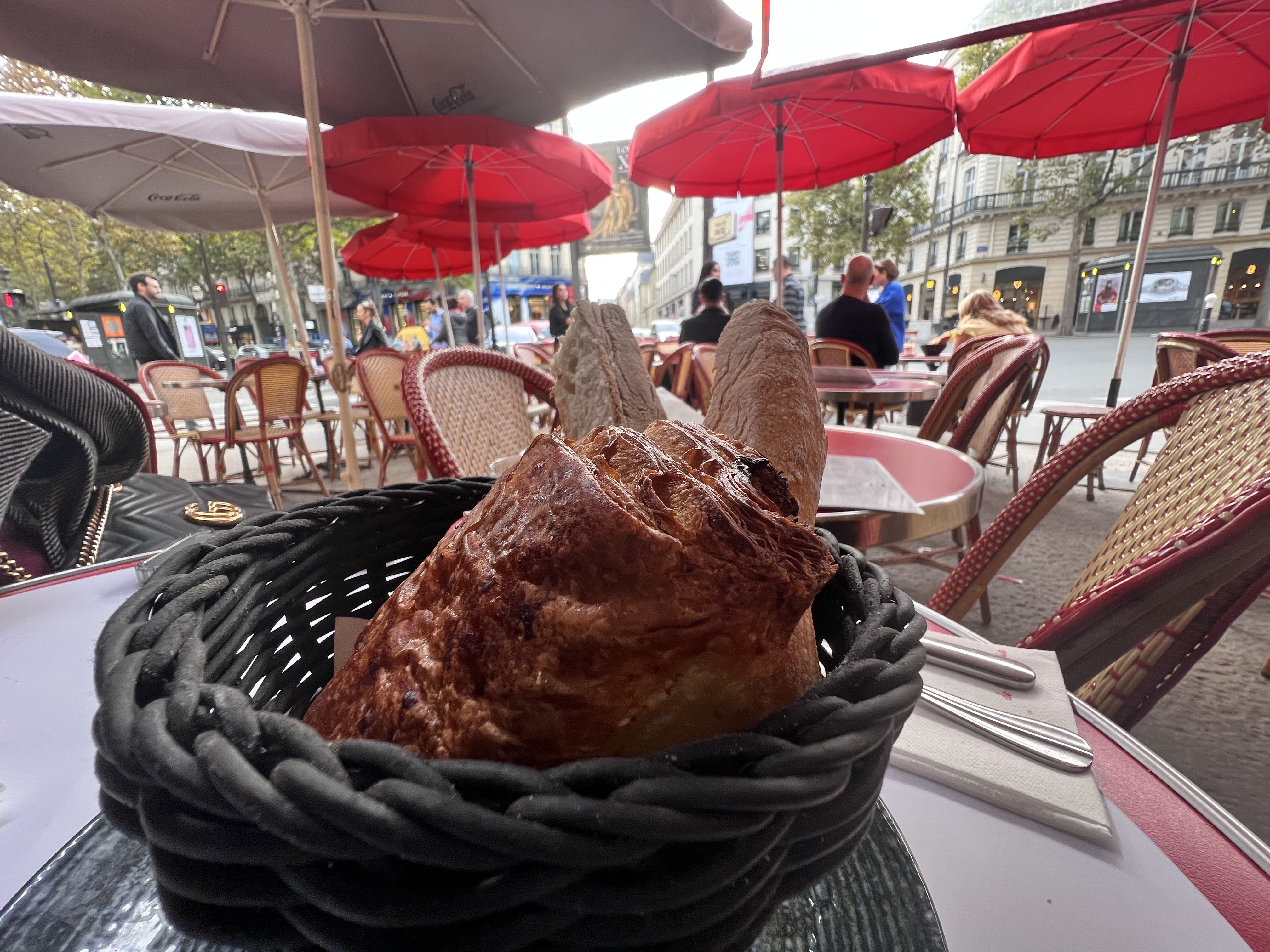 Un vrai café parisien où l’on a passé un excellent moment sur la terrasse ensoleillée. Nous avons choisi le petit-déjeuner à l’anglaise comprenant : un verre de jus d’oranges pressées, une boisson chaude, 2 tartines de pain (extra frais), 1 viennoiserie (croissant, pain au chocolat ou chausson aux pommes), 3 oeufs (au plat ou en omelette) et du bacon. Le pain et les viennoiseries sont extra frais, ils proviennent de la pâtisserie de l’Olympia, la même maison. Nous avons été accueillis par un serveur très sympa et professionnel, ce qui s’avère assez rare dans ce type d’établissements!