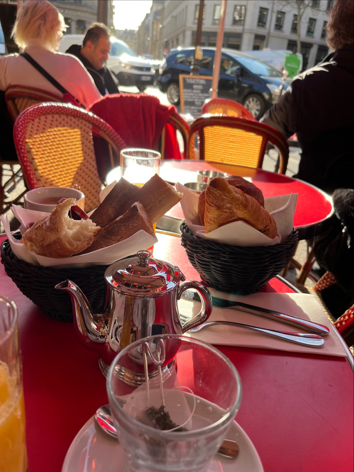 Très bon petit dèj sous le soleil parisien. Oeufs sur le plat et bacon généreux, viennoiseries très bonnes avec un jus fraichement pressé !