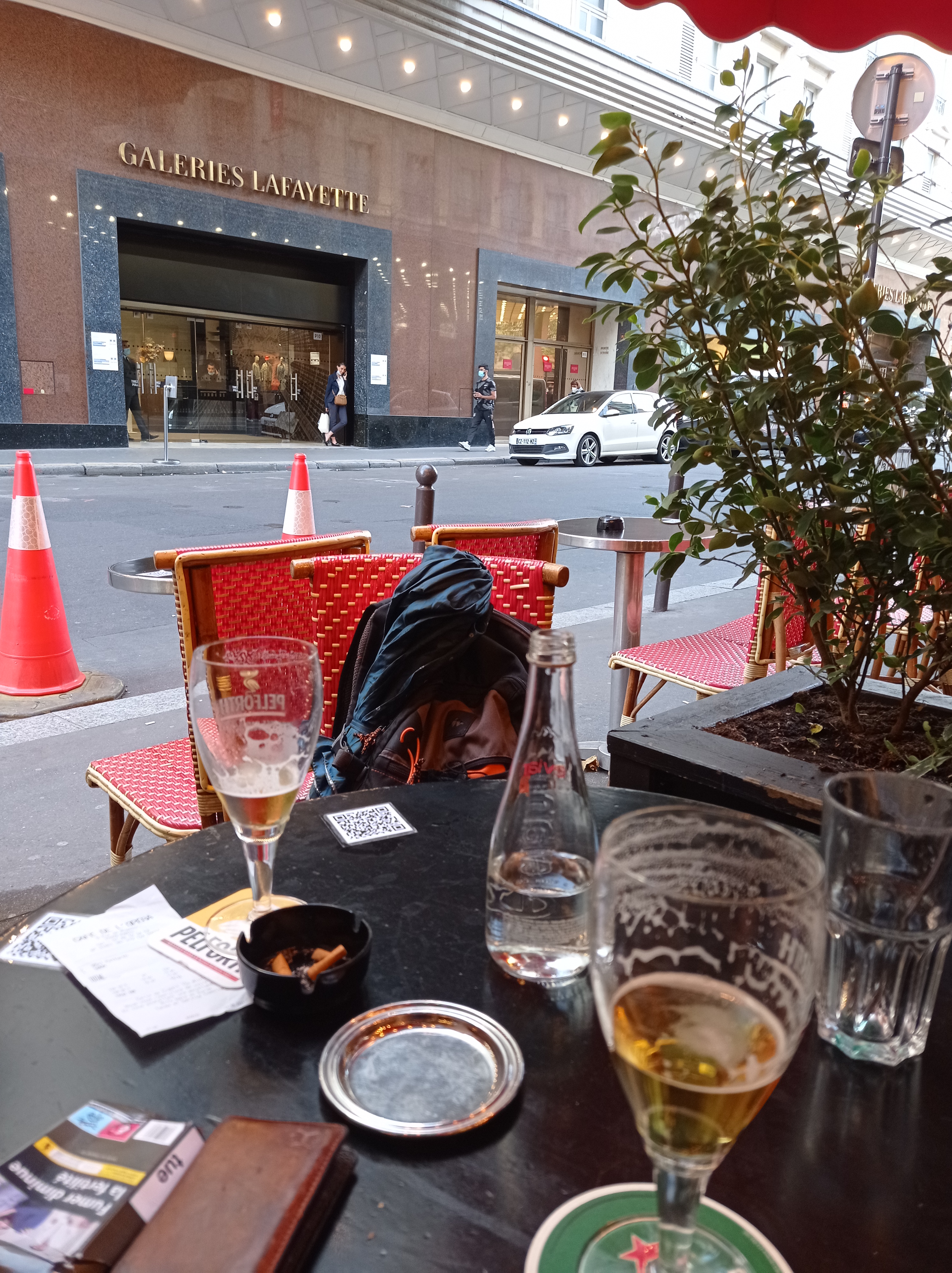 Terrasse ensoleillée sympathique face aux Galeries Lafayette.