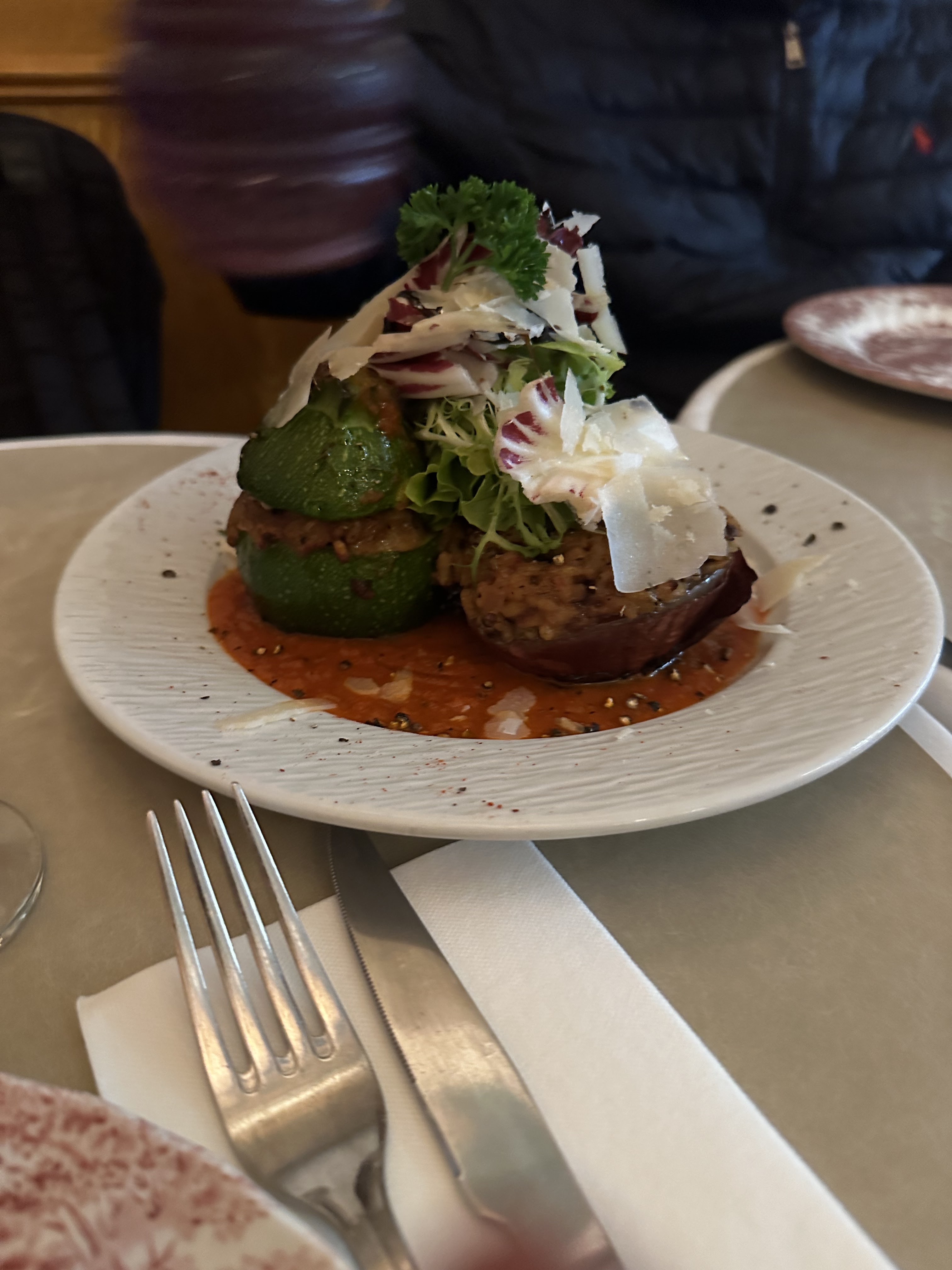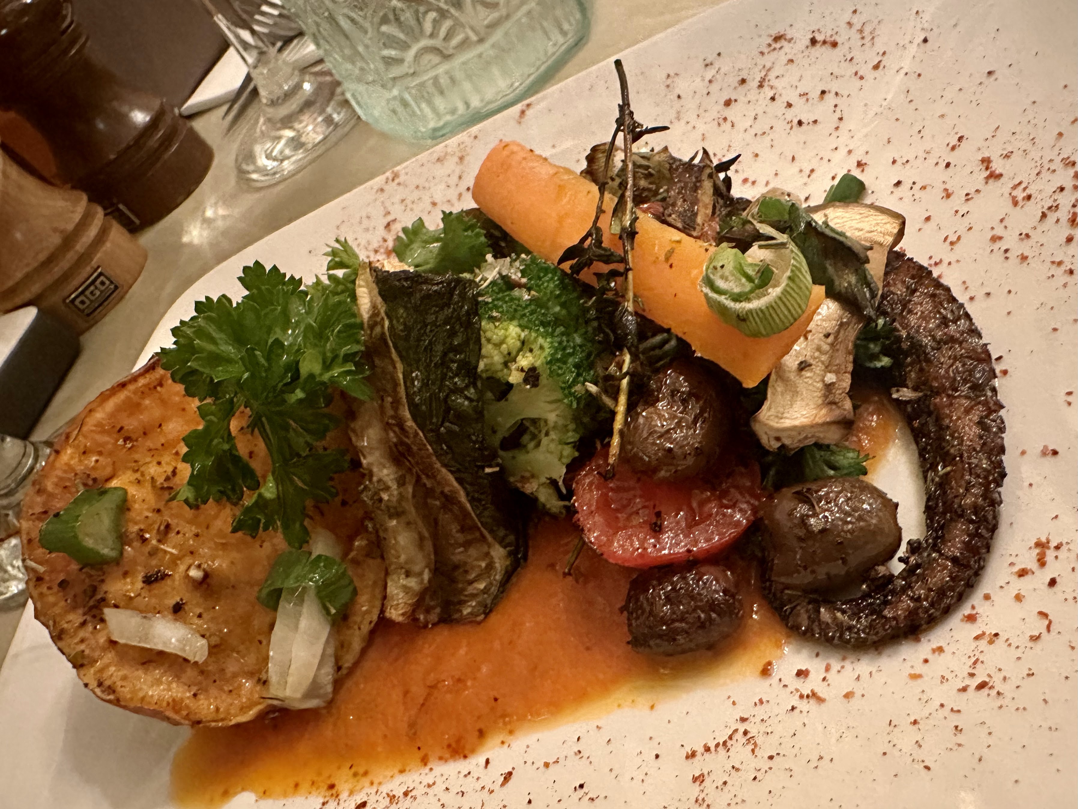 Nous sommes allés chercher quelque chose à manger, nous avons demandé s'il était végétarien et il a répondu que oui et qu'ils avaient un tajine végétarien au menu. Je ne m'attendais pas à ce que j'ai eu. C'était magnifique, le meilleur végétarien que je pense avoir jamais mangé, les saveurs merveilleuses. J'avais hâte d'essayer un dessert et c'était tout aussi bon que la tarte au myrte, je crois qu'on l'appelait. Certainement le standard Michelin et l'ambiance et la décoration charmantes, je reviendrai avant mon départ.
