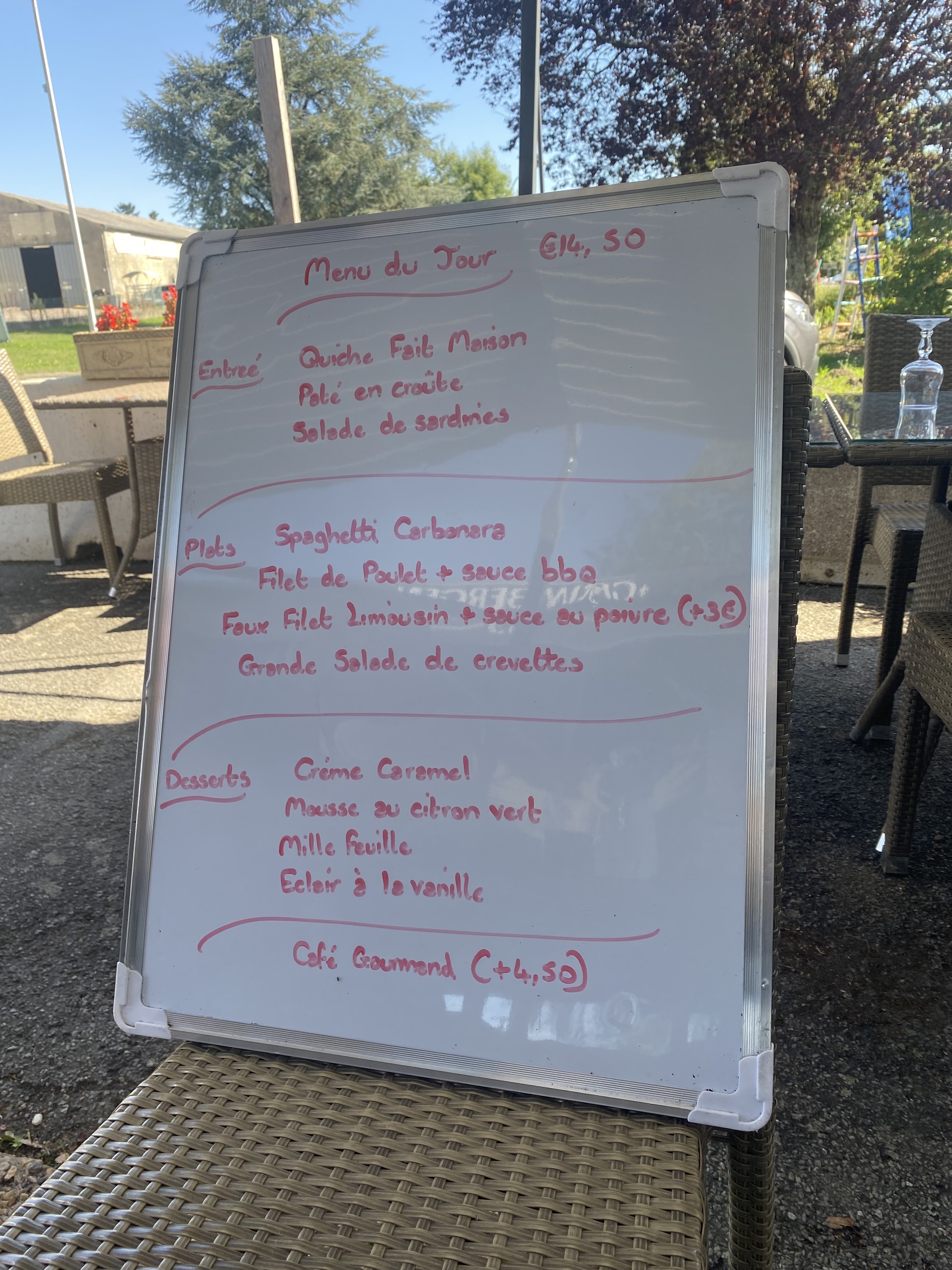 Excellent value for money plat de jour today. Good choice from the buffet for entrées and a well cooked faux-filet. Dessert and wine also all for 13€50. Thank you. Excellent rapport qualité prix plat de jour aujourd'hui. Bon choix au buffet pour les entrées et un faux-filet bien cuit. Dessert et vin également le tout pour 13€50. Merci.