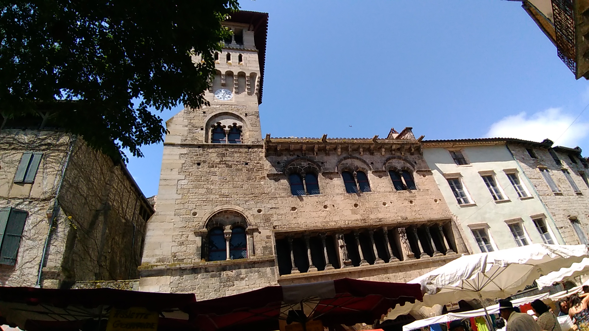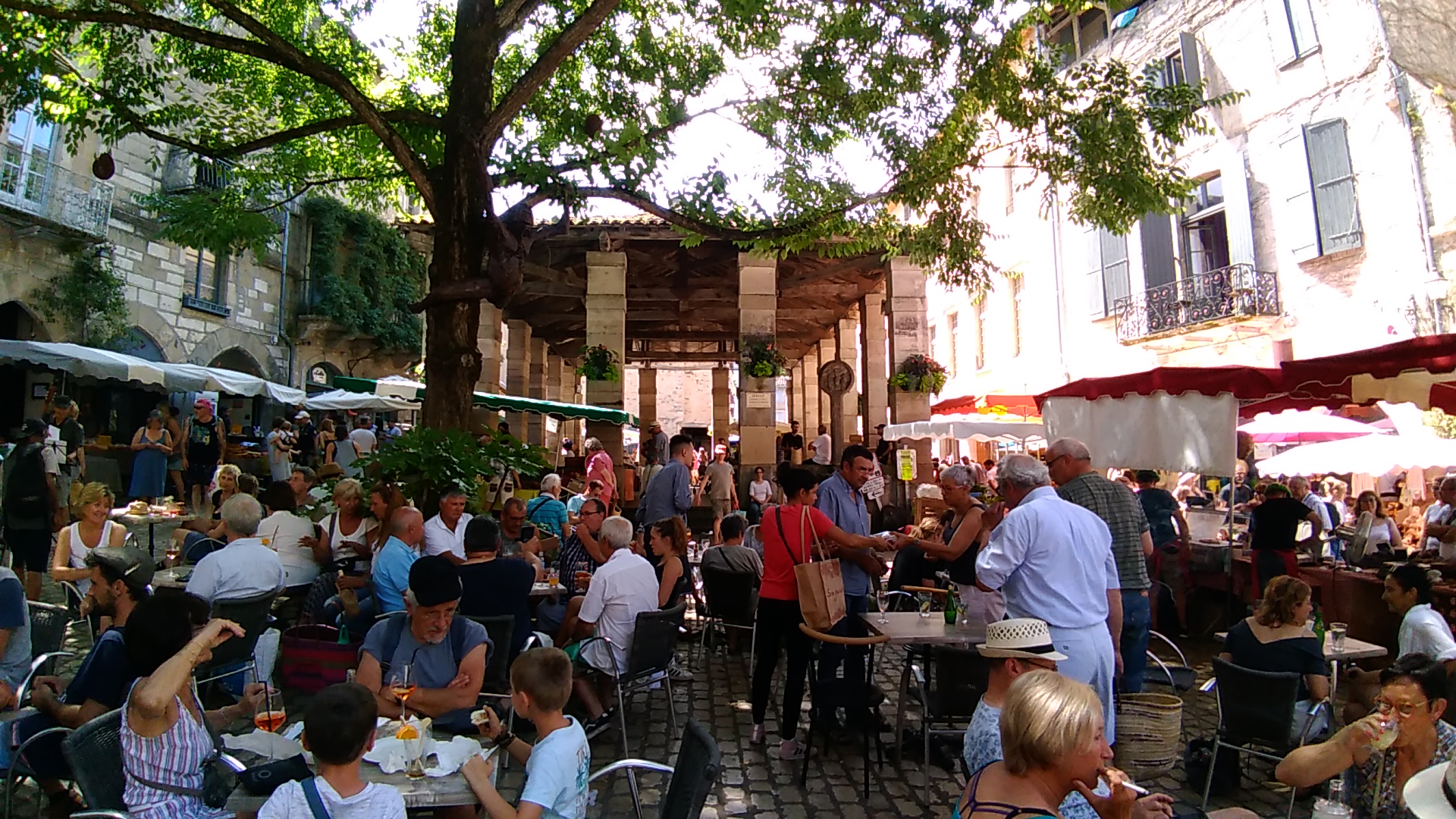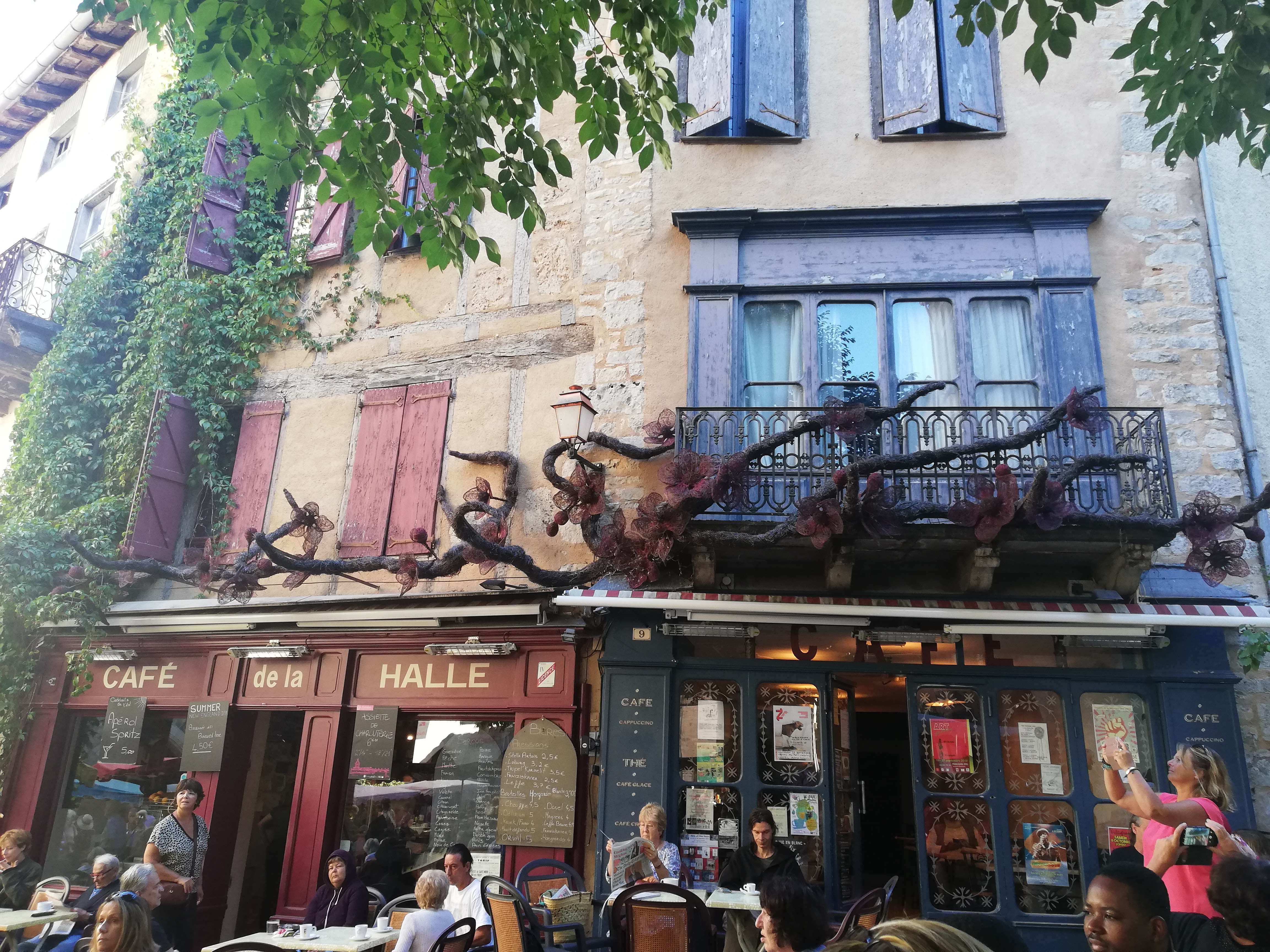 La terrasse de ce café donne directement sur la place de la halle. L'endroit est très pittoresque. J'ai apprécié un demi bien frais après une journée de rando dans le causse avoisinant par 35° à l'ombre. Un groupe de musiciens style médiaval est venu compléter le tableau !