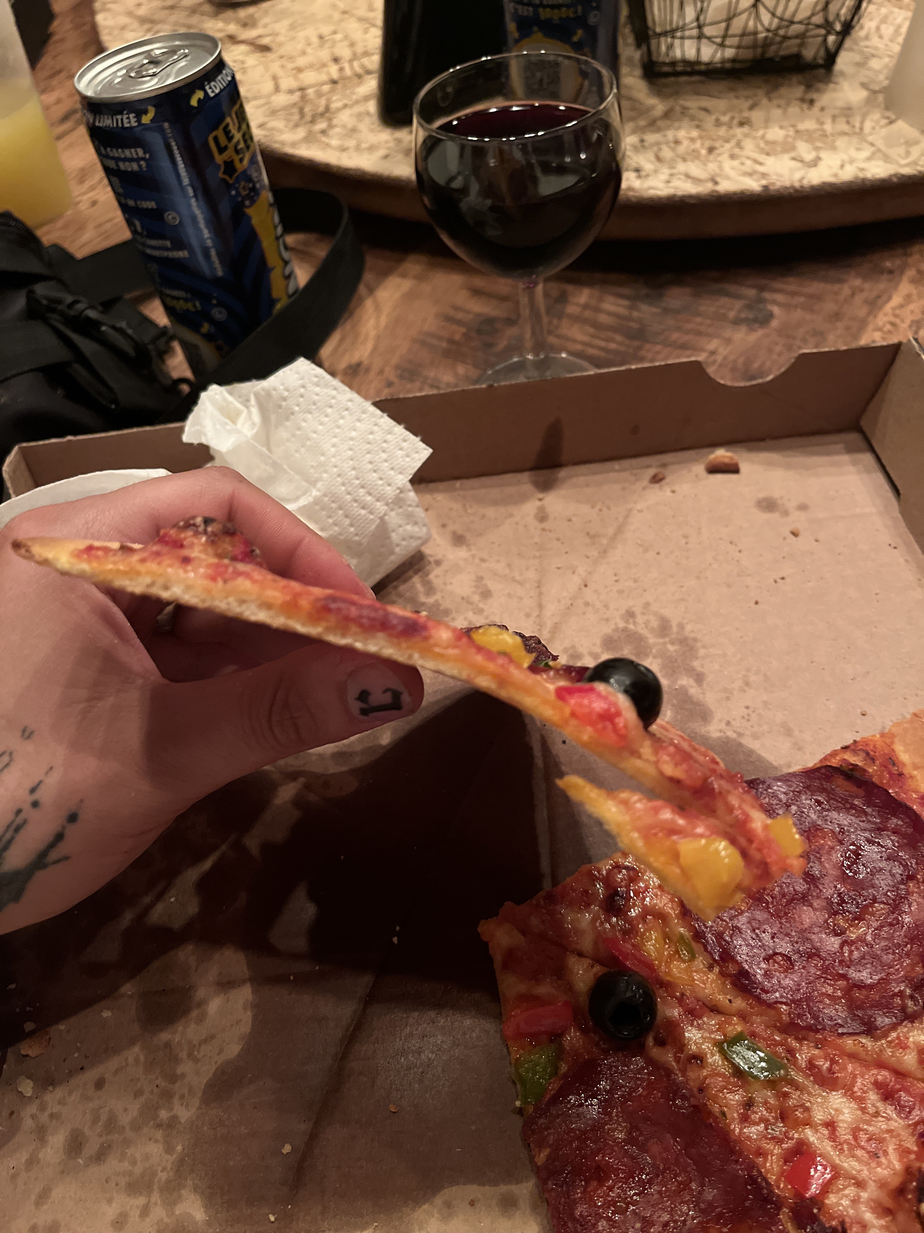 J’ai jamais vu ça les pizzas qu’on a commandé elles sont fine plate et sèche j’ai pas demander une pizza à la tomate séchée