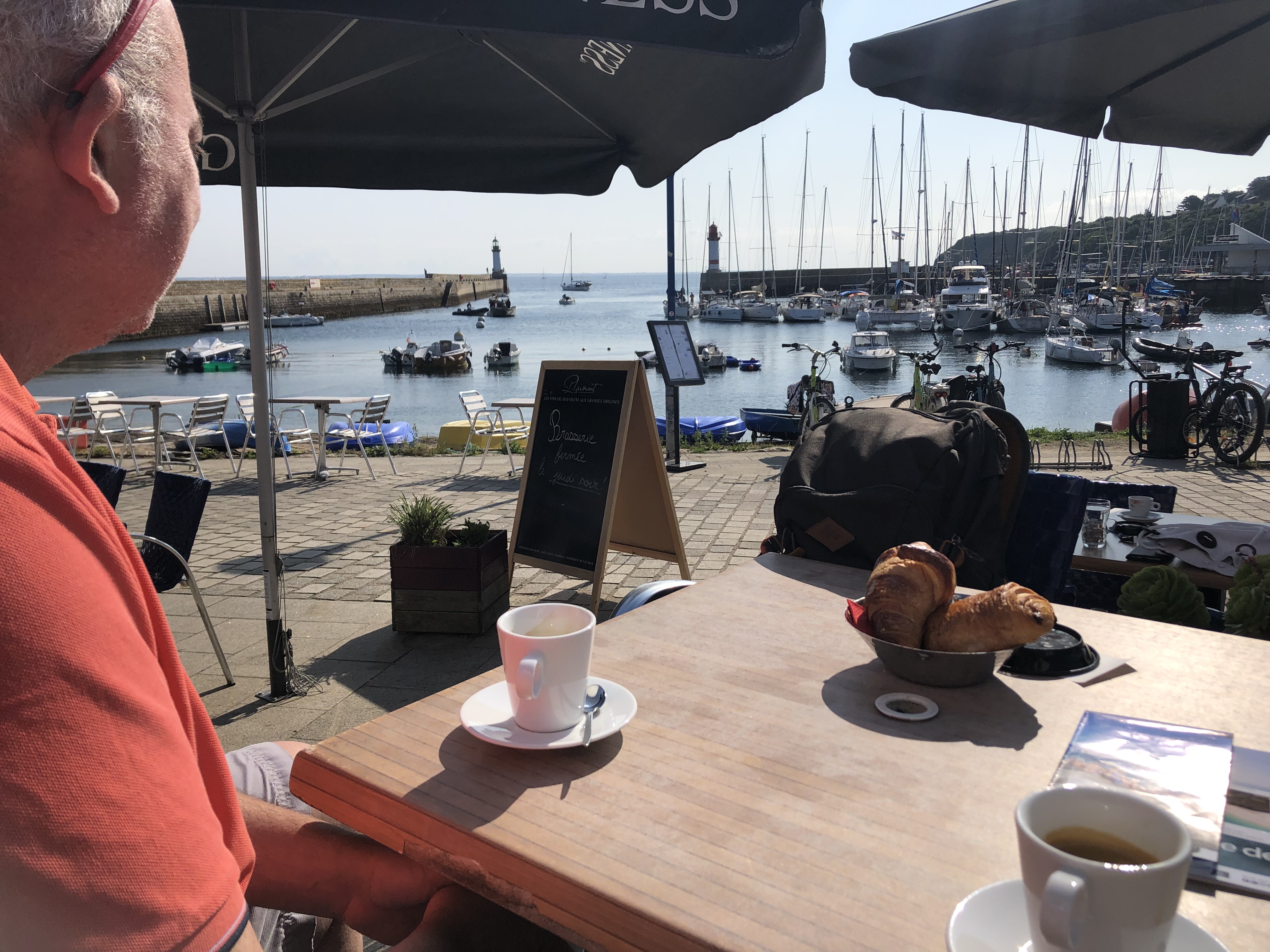 Un bon petit café croissant du matin en arrivant sur Groix. Accueil très aimable. Chien bienvenu 🐶… mais pas à l’hôtel 😢 dommage