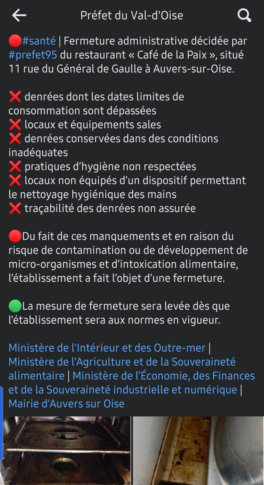 🔴#santé | Fermeture administrative décidée par #prefet95 du restaurant « Café de la Paix », situé 11 rue du Général de Gaulle à Auvers-sur-Oise. ❌ denrées dont les dates limites de consommation sont dépassées ❌ locaux et équipements sales ❌ denrées conservées dans des conditions inadéquates ❌ pratiques d’hygiène non respectées ❌ locaux non équipés d’un dispositif permettant le nettoyage hygiénique des mains ❌ traçabilité des denrées non assurée 🔴Du fait de ces manquements et en raison du risque de contamination ou de développement de micro-organismes et d’intoxication alimentaire, l’établissement a fait l’objet d’une fermeture. 🟢La mesure de fermeture sera levée dès que l’établissement sera aux normes en vigueur. Ministère de l'Intérieur et des Outre-mer | Ministère de l'Agriculture et de la Souveraineté alimentaire | Ministère de l’Économie, des Finances et de la Souveraineté industrielle et numérique | Mairie d'Auvers sur Oise