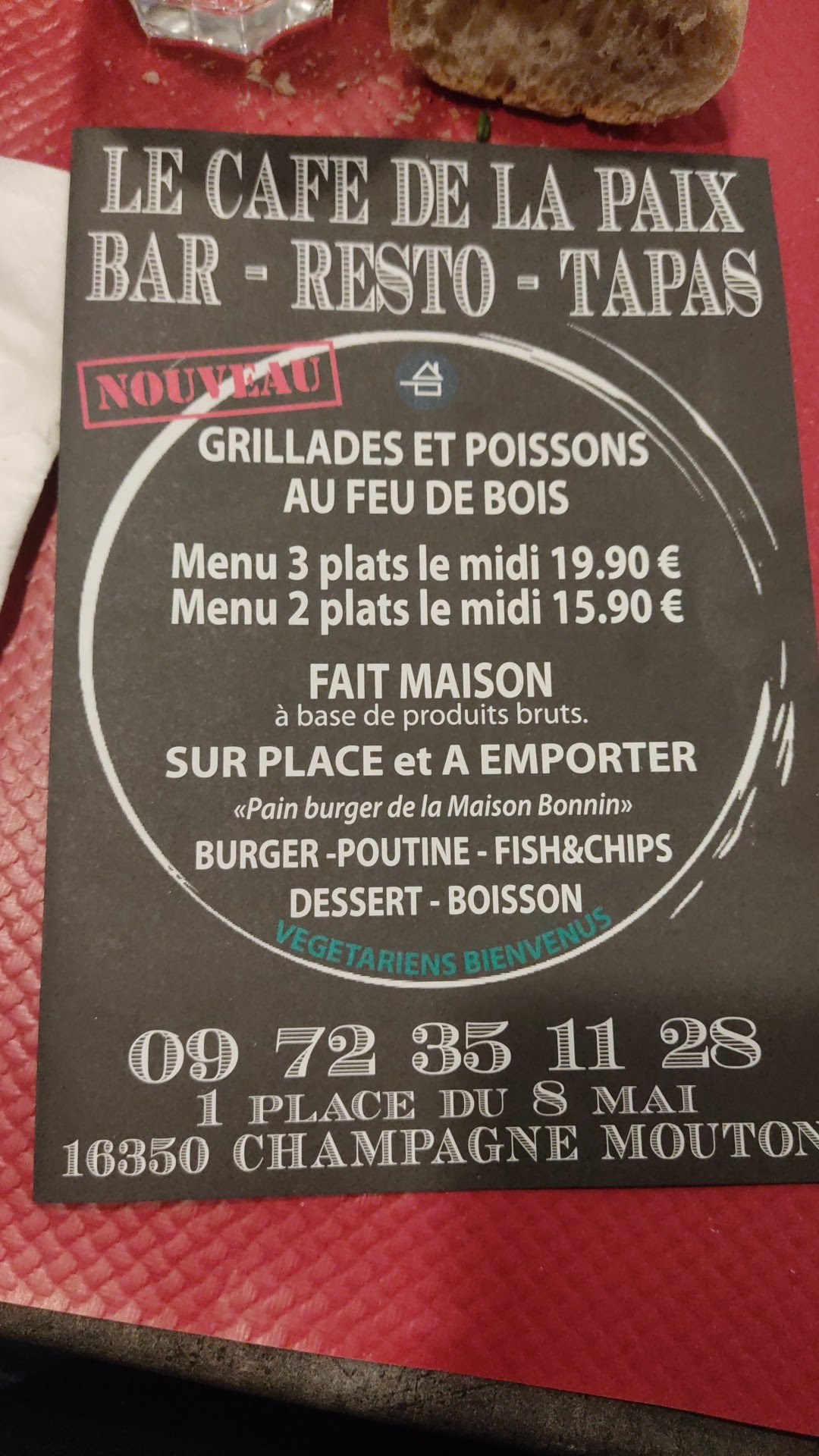 Vous aimez la bonne viande (en qualité et en quantité) ainsi que les bons petits plats faits maison N'hésitez surtout pas à faire une halte repas au café de la paix à Champagne mouton ! Une équipe pro et sympathique est là pour vous servir des plats de qualités Je recommande vivement ! ! Et encore Merci à toute l'équipe