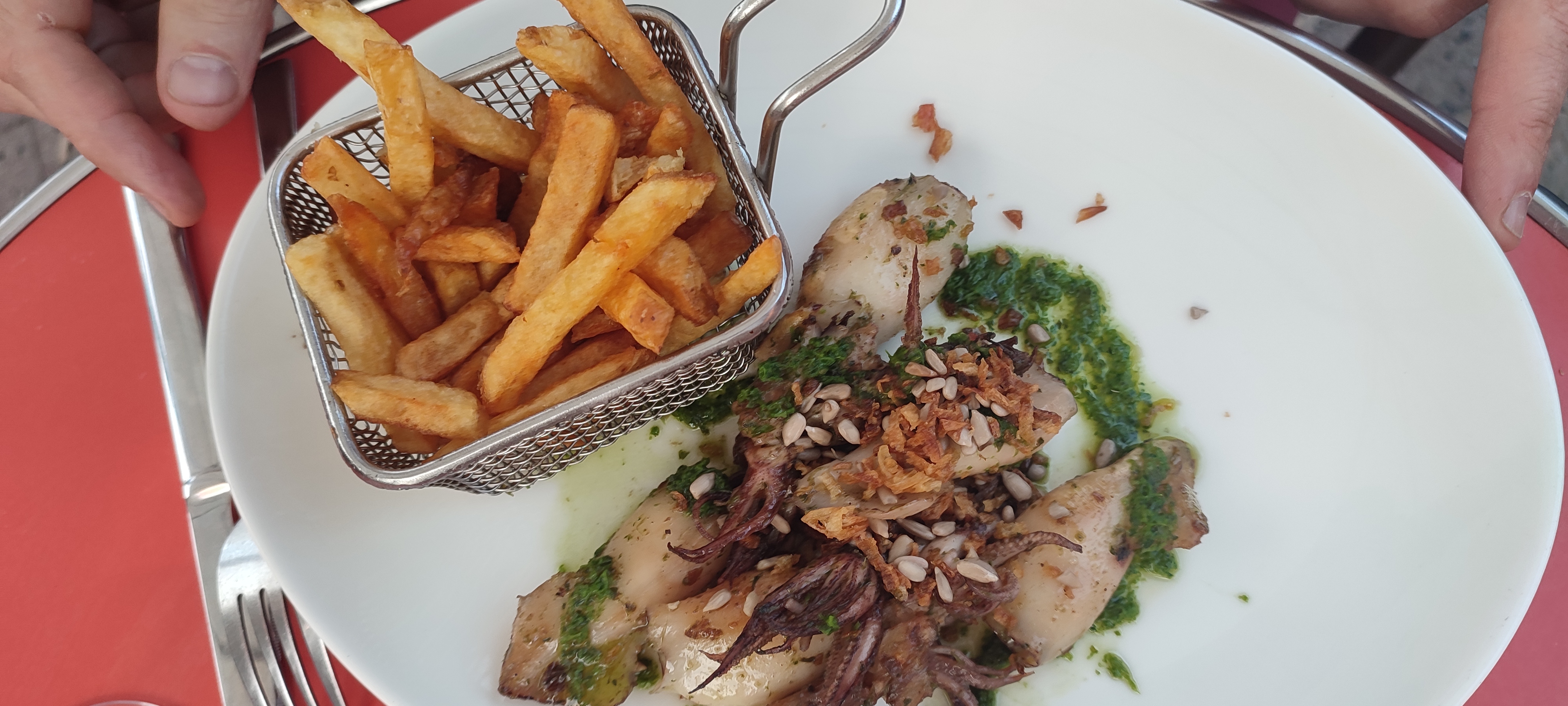 Malgré l emplacement bien situé et l accueil très agréable les plats restent très minimalistes. Niveau quantité dans l assiette nous avons commandé deux plats de chipirons à la plancha 5 chipirons 2 pommes grenailles et deux cuillères de piperade dans une assiette et la deuxième assiette au nombre de dix chipirons comptés et frites ! Et de surcroît caoutchouteux!!! Et nous parlons des moules qui étaient pas très gouteuses ! Pour le prix de 19€ le plat c un peu un attrape touriste ! Et cerise sur le gâteau la carte tickets restaurant est plafonnée à 19€ ??? Pour 3 personnes !!! Bizarre ???