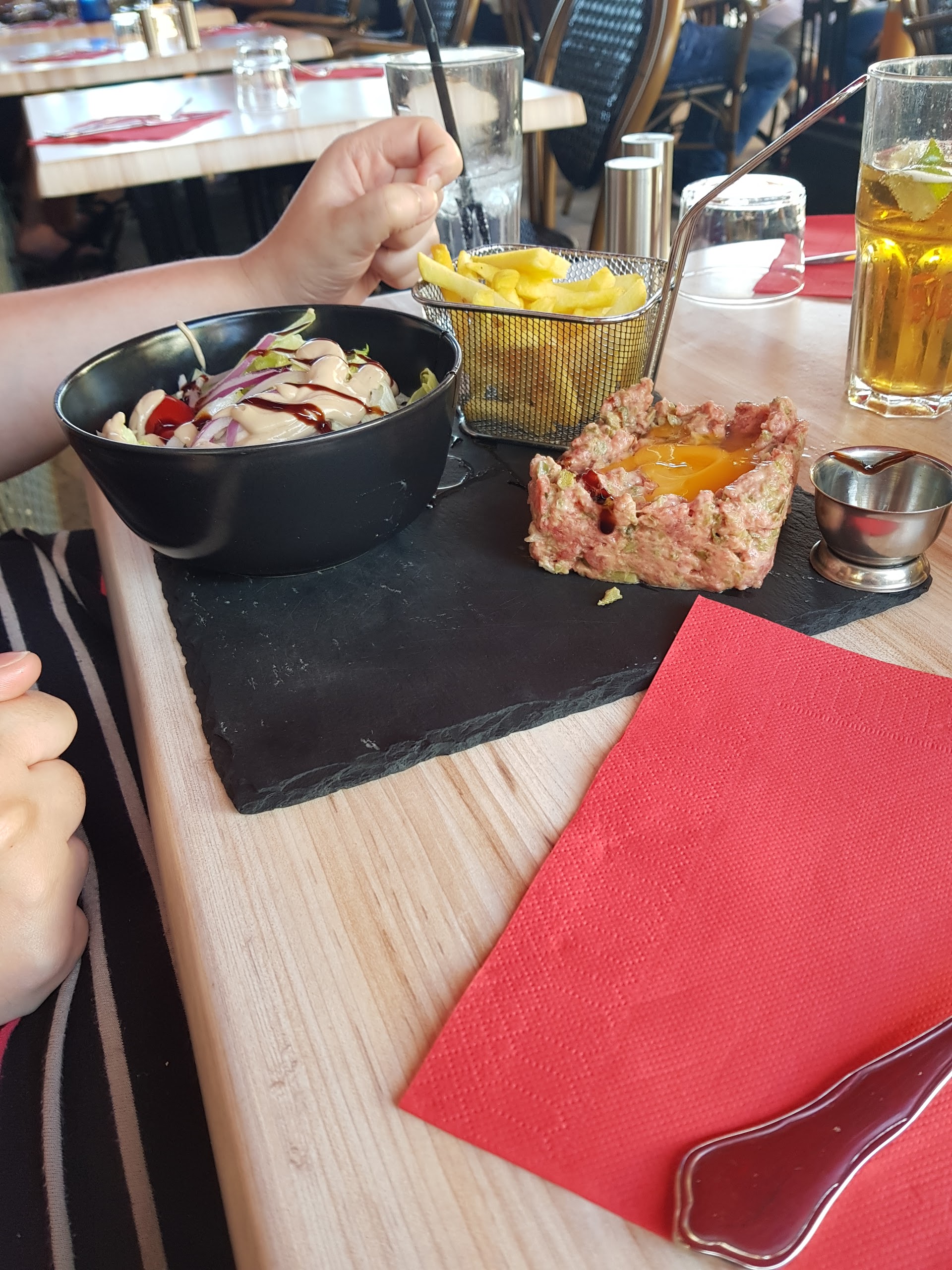 Bon Tartare de bœuf assez bien goutu, Les frites étaient aussi bonnes Mais le plat du jour plus disponible alors qu’il était 12h30, très décevant et en plus ils gardent l’affiche devant alors qu’ils en ont plus !!! Permet d’attirer du monde…