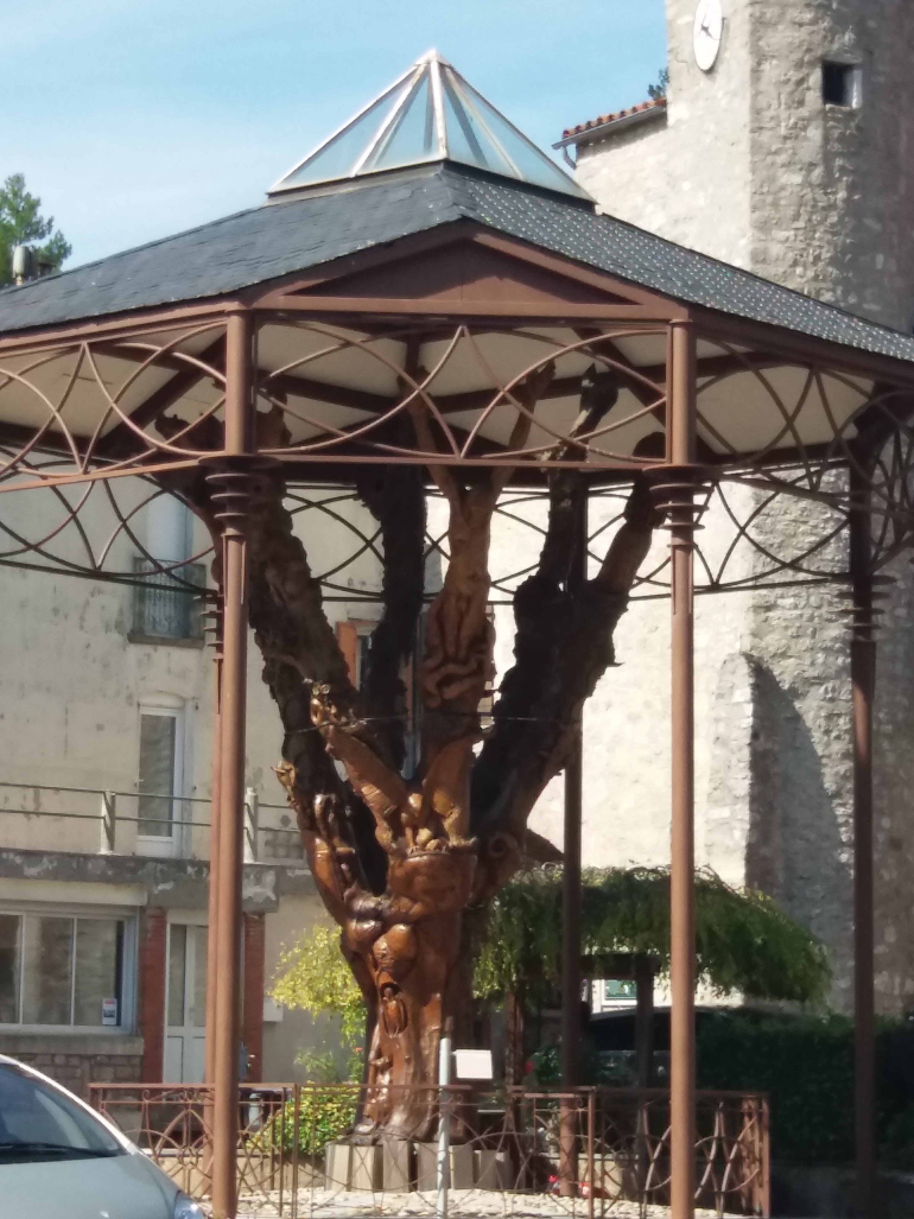 Il y a sur cette place une arbre qui a été sauver de l'abattage... Le sculpteur a mis 10 années à le sculpté pour que celui ci trône la place. Magnifique découverte a la suite d'une sortie moto.
