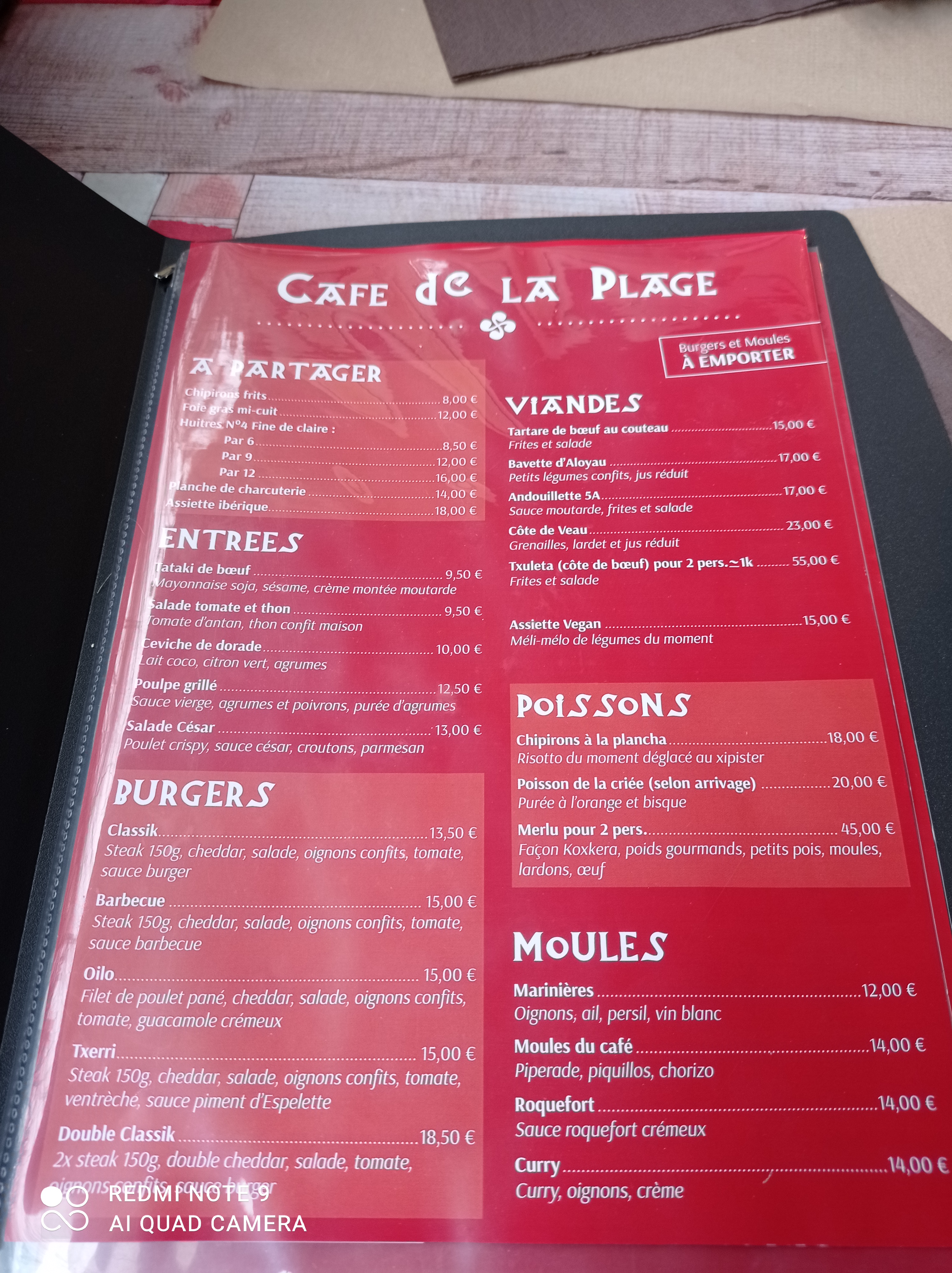 Toujours au top ! Merci à toute l'équipe du Café de la Plage, menu du midi excellent,copieux et soigné pour un tarif très raisonnable (18€). La carte est courte et concise avec des plats pour tous les goûts. Je reviendrais avec toujours un grand plaisir !