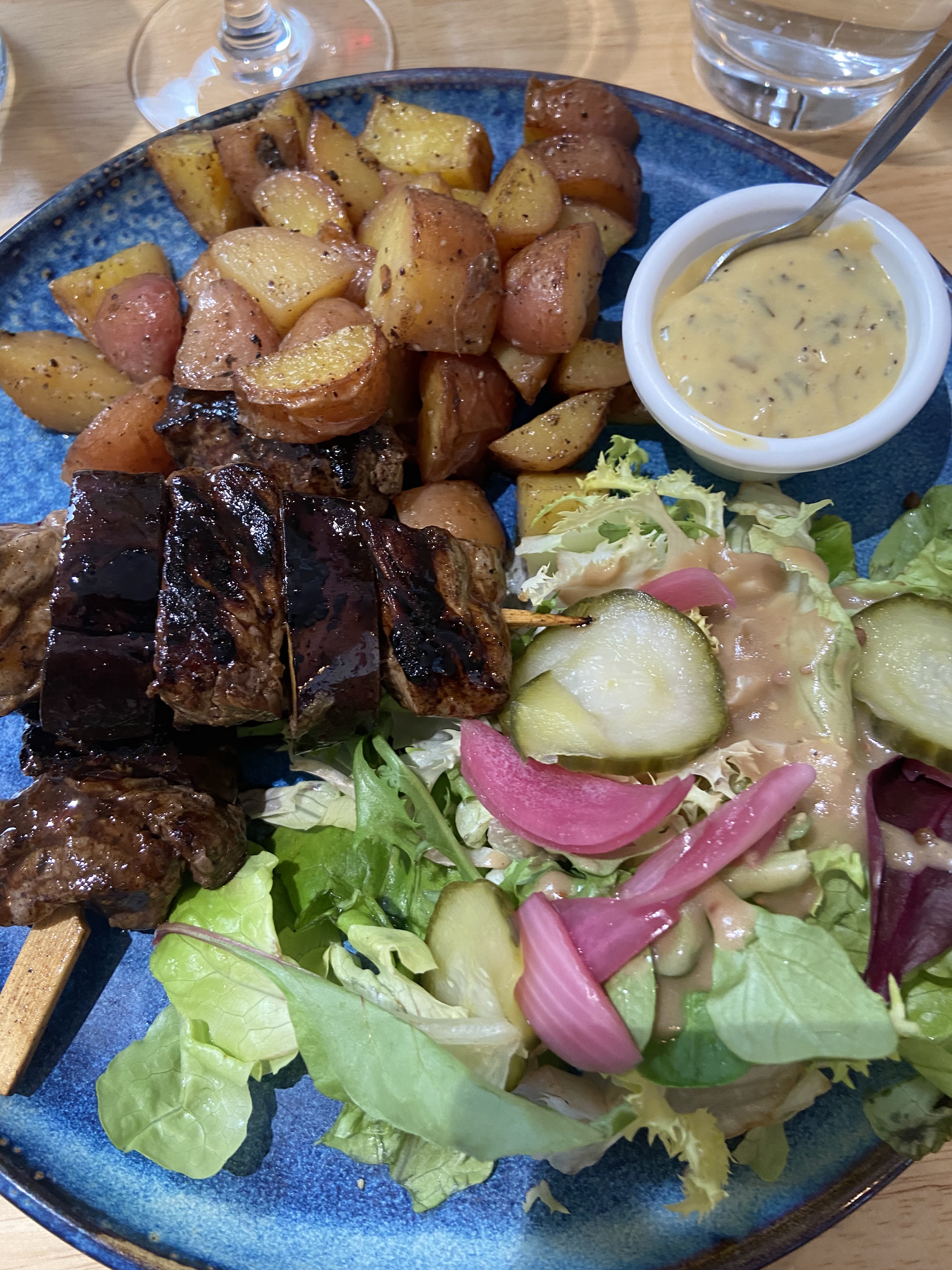Accueil moyen, nous avions réservé, et il manquait une fourchette et une chaise. Repas moyen. Assiettes de tapas déçus avec les encornets(trop, trop aillé) Filet mignon de veau au jus de romarin (on cherche encore le romarin) Filet de lieu (trop fort, la bouche en feu) Obligé de réclamer la bouteille de vin et les carafe d'eau (2 à 3 fois). Sinon, le cadre est sympa.