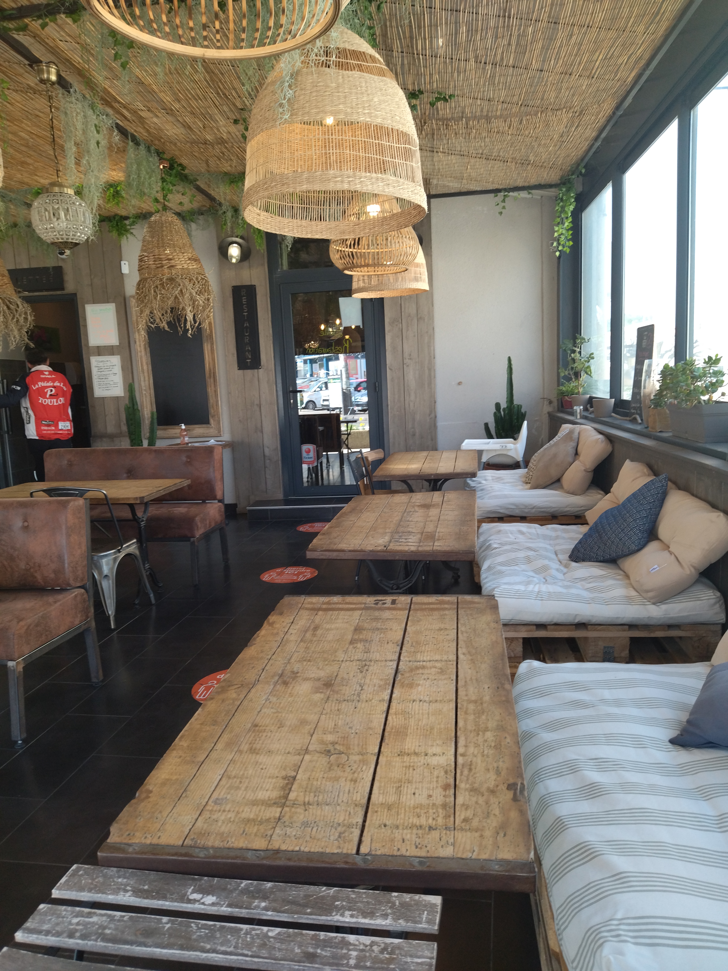 Super déco pour cet endroit qui, sans cela, manquerait d'attrait. Nous avons déjeuné en famille dans ce café, tout à fait par hasard : suite à une panne sur l'autoroute, notre voiture a été remorquée non loin de là. Bien que donnant sur la grand rue, ce café offre une terrasse assez sympa, dont une partie est réservé à la restauration. Nous avons pourtant choisi de déjeuner à l'intérieur, car beaucoup de table étaient occupées (c'était le seul lieu où déjeuner ce lundi de mi-août). Déco sympa, service très agréable, mais nourriture médiocre. J'ai choisi le menu du jour : pauvres crudités insipides, suivies d'un blanc de poulet pas sec, mais sans fioritures (ni goût non plus). Les frites sont servies dans un élégant panier, mais bof quand même. La crème brûlée (pas maison) rattrape le tout. Le burger vegan a l'air plutôt pas mal, je regrette e ne pas l'avoir choisi. Au final, un endroit sympa, mais j'y traînerais plus pour boire des coups que pour manger...