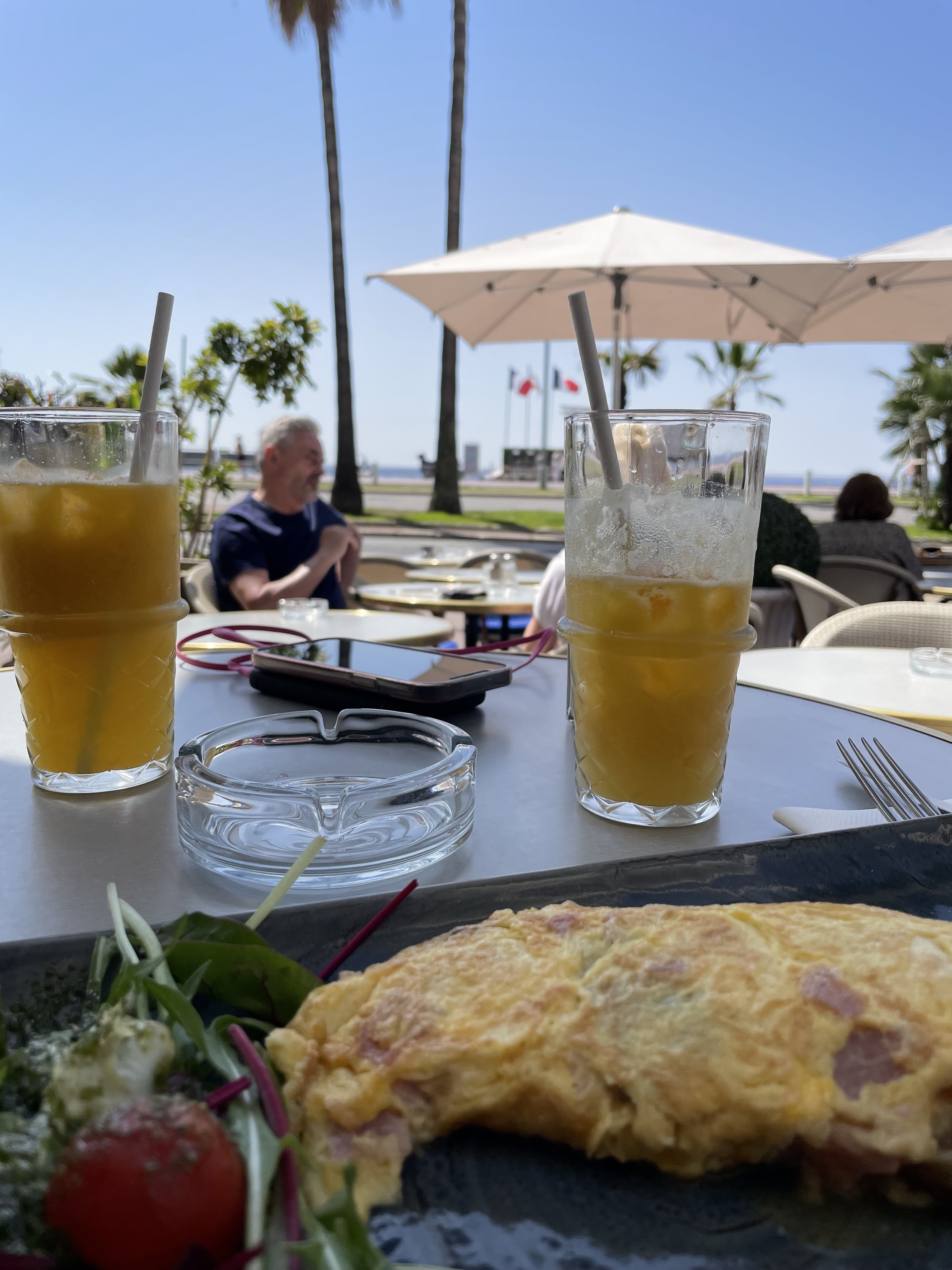 J'ai pris le petit déjeuner ici deux matins de suite avec une omelette et du jus d'orange. J'ai passé un très bon moment et la nourriture était délicieuse. La vue sur le front de mer niçois encadrait parfaitement le tout, recommandé !