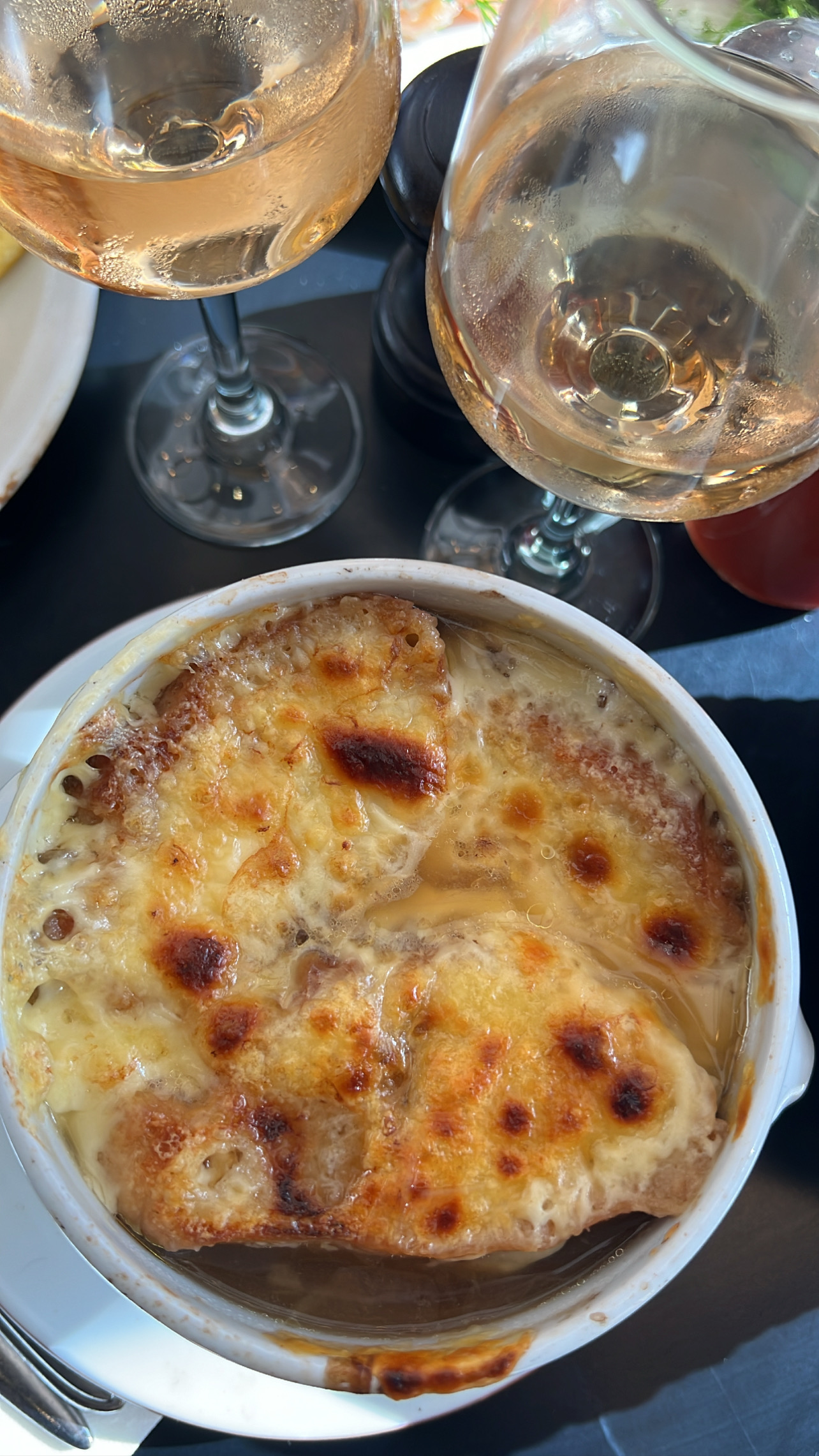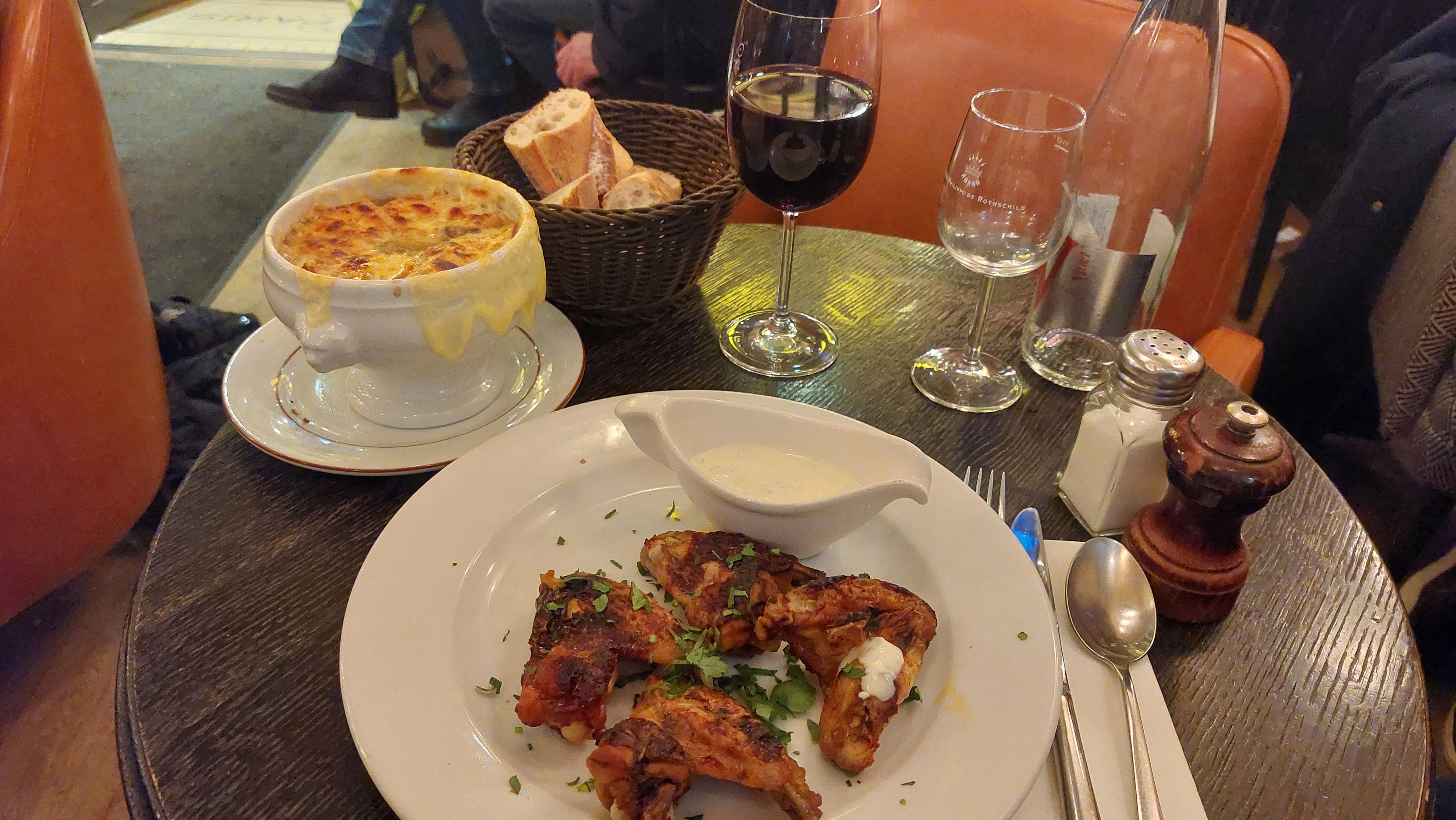 Après une visite au Musée du Louvre, je me suis arrêté ici pour manger. Même s'il y avait pas mal de restaurants dans le coin, ce restaurant m'a attiré pour la décoration extérieure (ces tables noires offrent une élégance en phase avec l'ambiance française). La nourriture commandée était bonne, le personnel était très gentil, comme je ne parle pas couramment le français, nous nous sommes bien compris, ils parlaient même en anglais. J'ai également commandé un plateau de fromages que je n'ai pas eu le temps de prendre en photo. La crème d'oignons n'est pas servie pendant la saison chaude, c'est ce que j'ai compris. Lors de prochaines vacances, je reviendrais ici.