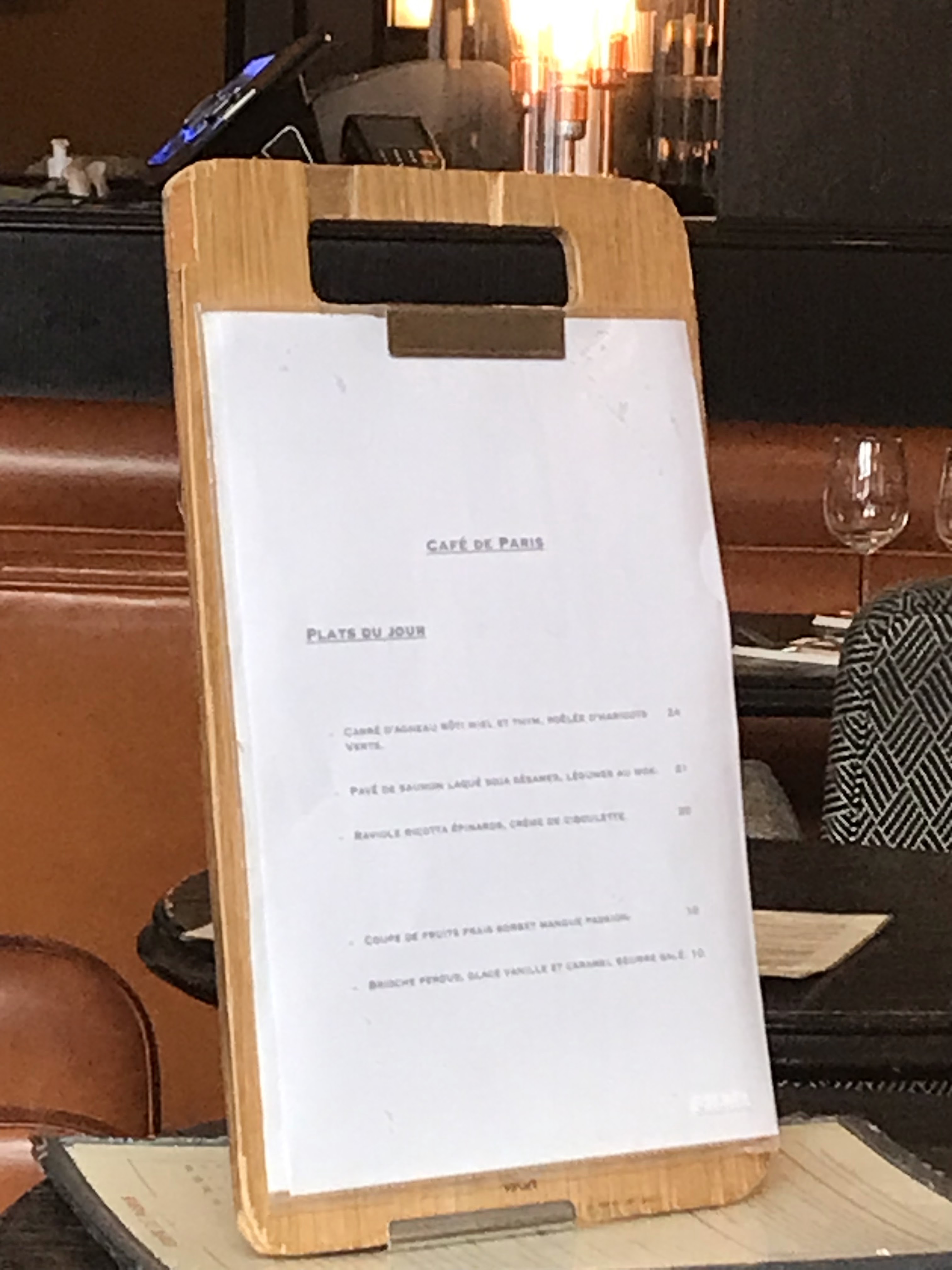 arrivés sans vraiment d'illusions dans cette Brasserie typiquement parisienne , nous voici accueillis par un serveur aussi antillais que sympathique et rieur,qui nous propose un magret de canard sauce Tao ( une tuerie), accompagné de patates douces en frites caramélisées (un délice!), accompagnés d'un excellent merlot. Déjà régalés par la qualité du repas, nous voici enchantés par l'ambiance joyeuse et surtout la musique de fond : QUE Des chanteurs FRANÇAIS (MAIS oui Madame!)Dassin, Dutronc, Montand, etc etc, un vrai bonheur pour nos oreilles fatiguées d'entendre en permanence les bredouillis et éructations anglos-saxonnes qui sévissent en général dans les lieux publics. Merci à toute l'équipe de ce Café de Paris pour le moment de plaisir et de détente qu'ils nous ont offerts…