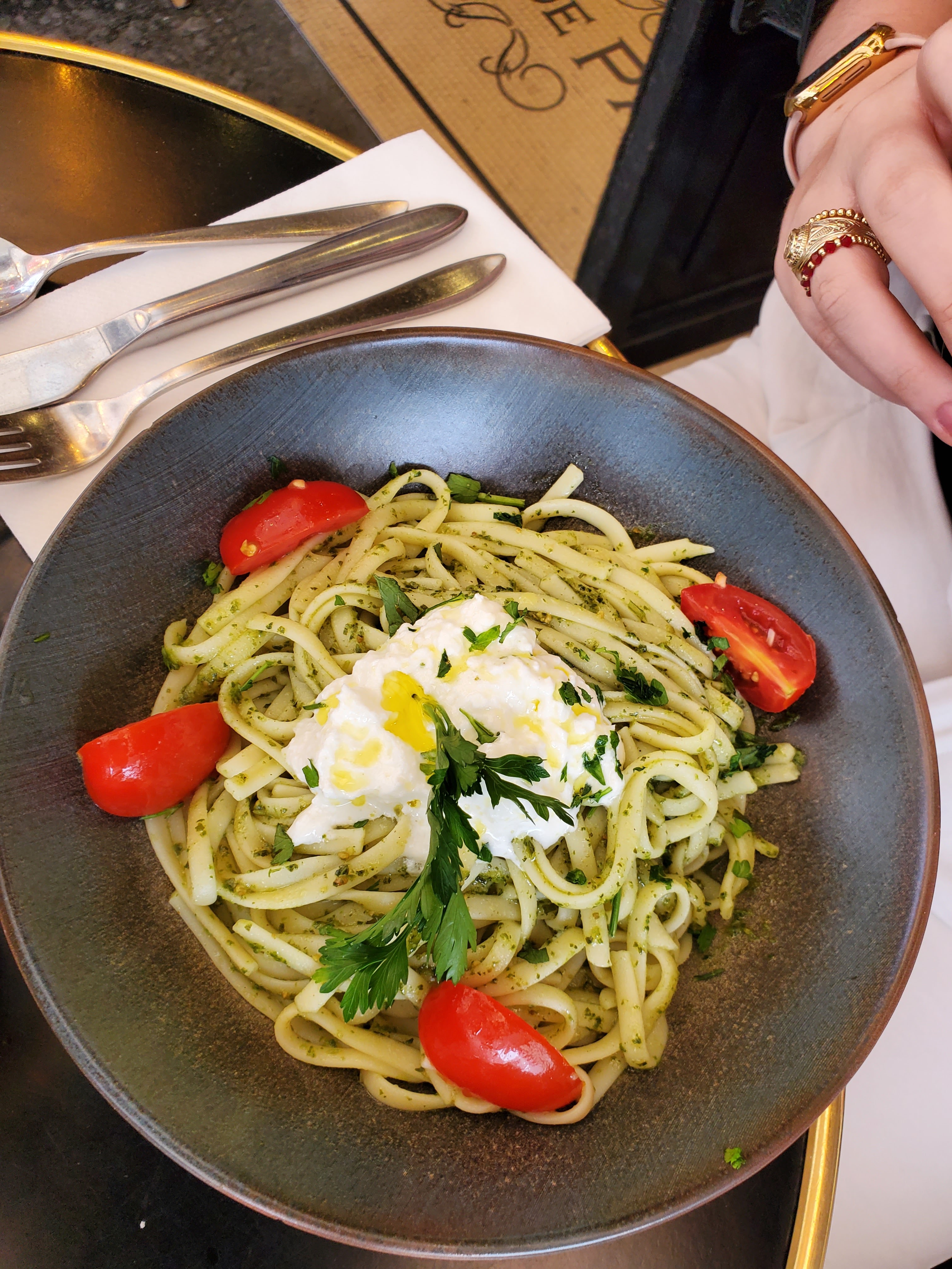 Là-bas, pendant la PARIS FASHION WEEK, même si le paquet était bondé, nous nous sommes assis immédiatement, les serveurs sont venus et notre serveur a pris nos commandes… la nourriture est arrivée assez rapidement et était incroyable. Ambiance soignée et propre, service de qualité, excellent menu, large carte des vins et goûts merveilleux. HAUTS 🎉