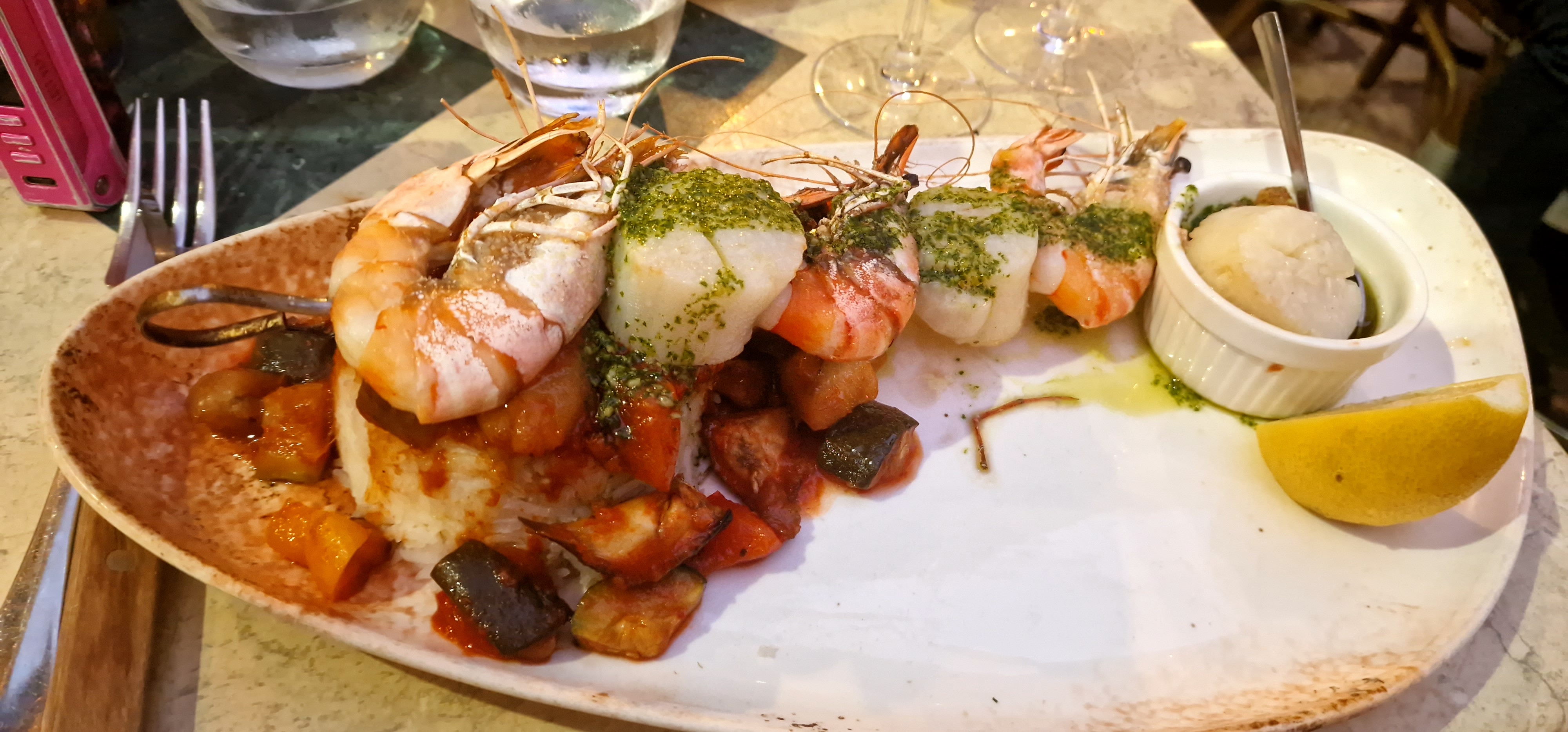 28.50 euros pour une « spécialité « de pâtes … qui en vaut 12…Dans l assiette : une sauce rouille sans intérêt et plutôt écoeurante avec 3 noix de saint Jacques crues et 3 gambas type cantine et surtout beaucoup beaucoup de linguines… Plat à éviter ! Pour le reste : service et emplacement c est un très bon endroit.