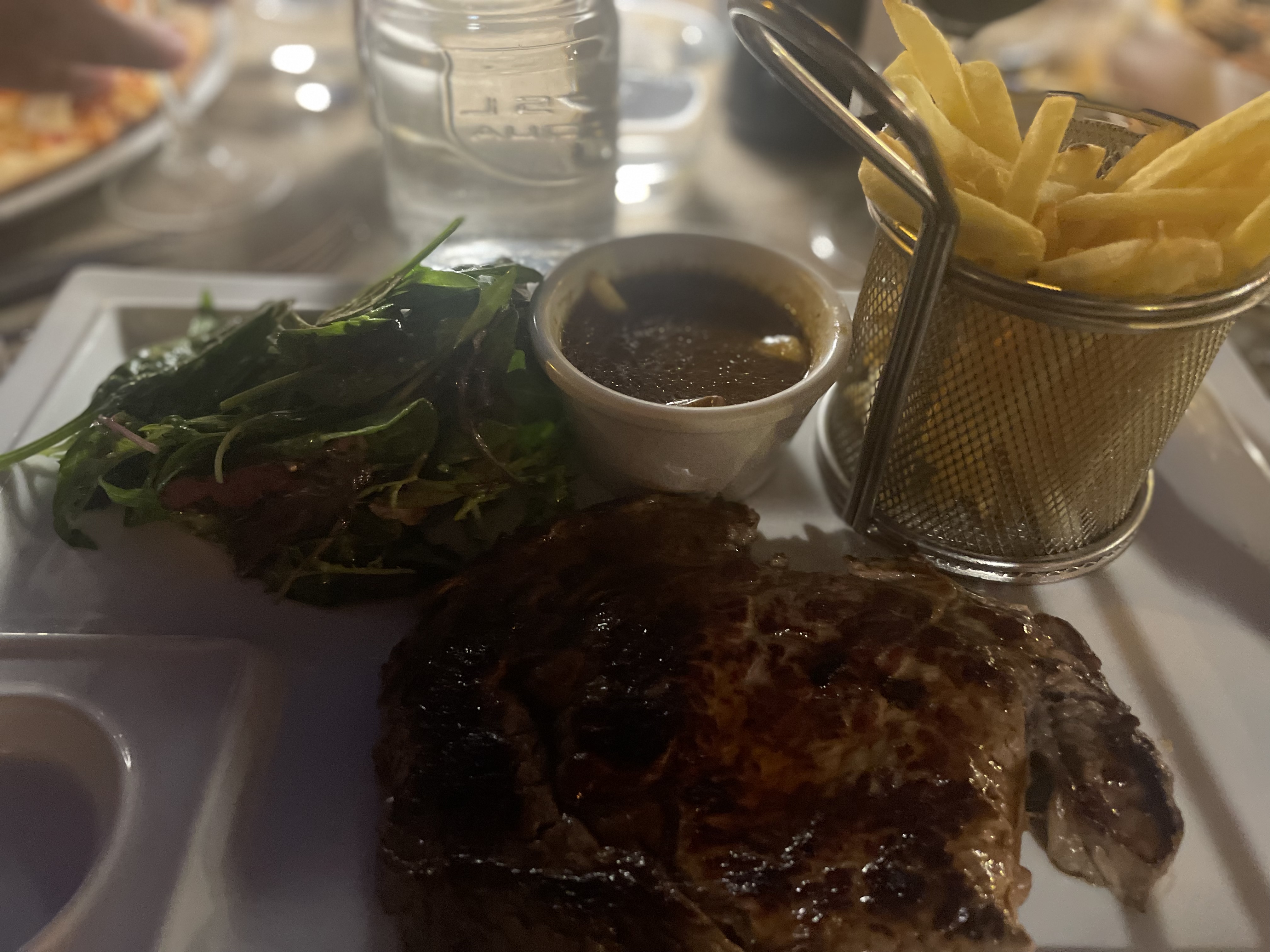 J'ai dîné dans ce restaurant plus tôt cette année. Quand nous sommes arrivés, l'endroit était déjà plein, mais le serveur n'a pas mis trop de temps à nous trouver nos places. Différents serveurs gérant différentes sections des sièges extérieurs, c'était plutôt organisé. Nous avons commandé un steak standard avec des frites et des pâtes aux fruits de mer, qui n'ont pas non plus mis trop de temps à être servis, même si la salle était pleine ce jour-là. Nous avions l’impression que le prix des plats était légèrement élevé et que nos tables étaient placées trop près de celle de nos voisins. Je suppose que c'est pour l'optimisation de l'espace extérieur.