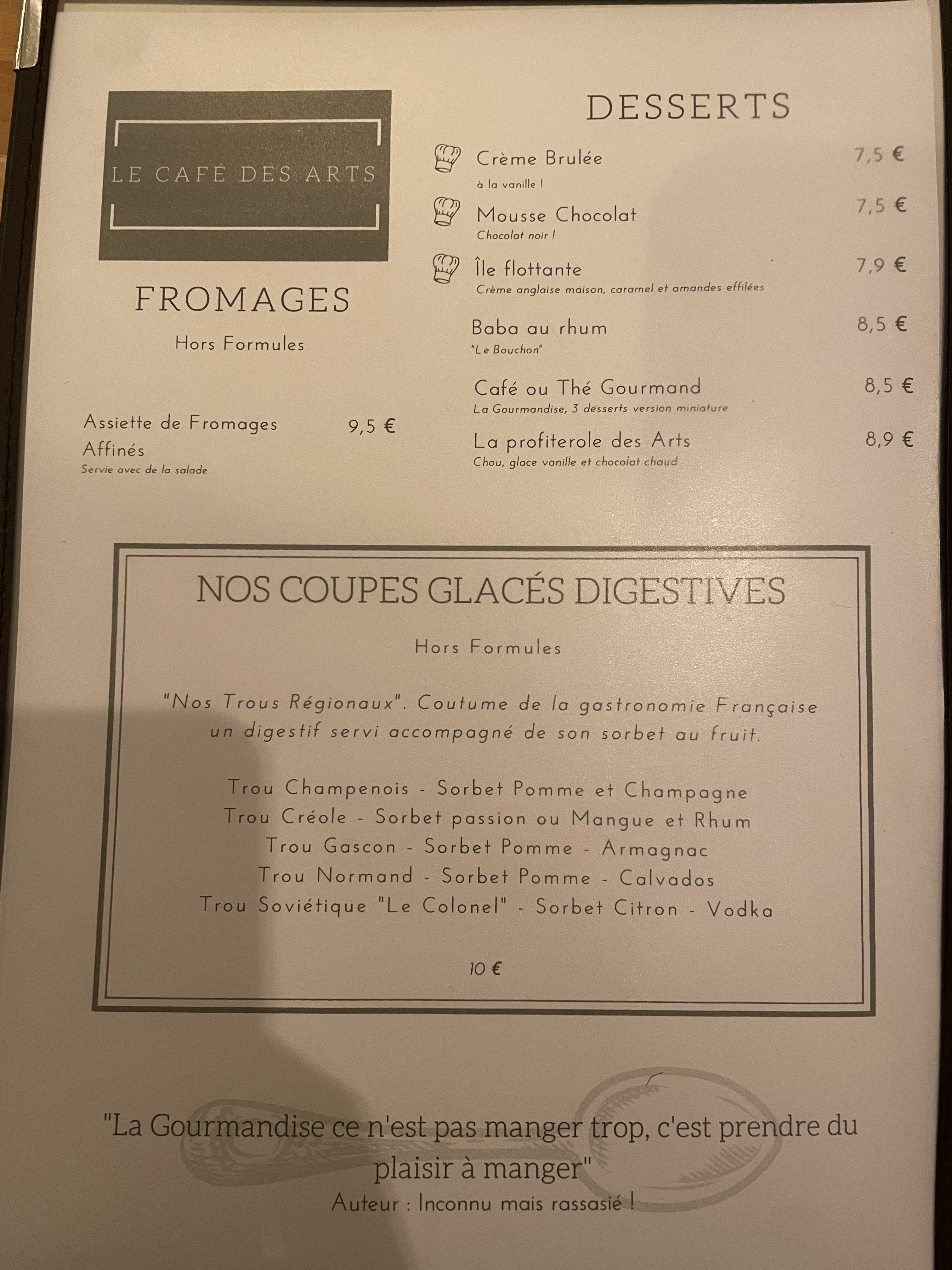 Un énorme merci au Café des Arts pour son accueil exceptionnel ! 🌟 Une réservation de dernière minute pour 16 personnes (48h avant), et nous avons tous été enchantés par cette belle découverte. Un petit établissement cosy où l'on se sent comme à la maison. Le menu était délicieux, un vrai régal, et les îles flottantes étaient énormes et délicieuses. Bravo aux chefs !!! 👨🍳👩🍳 Et un grand merci à Owen & Fadel pour leur service impeccable et leur gentillesse exceptionnelle ! 🌈 Tout était parfait. Merci infiniment pour cette merveilleuse soirée. On espère avoir un prochain événement professionnel ou revenir visiter Versailles bientôt pour retrouver ce petit coin de bonheur chez vous. Au plaisir ! 🥂✨Le patron peut être fier de son équipe.