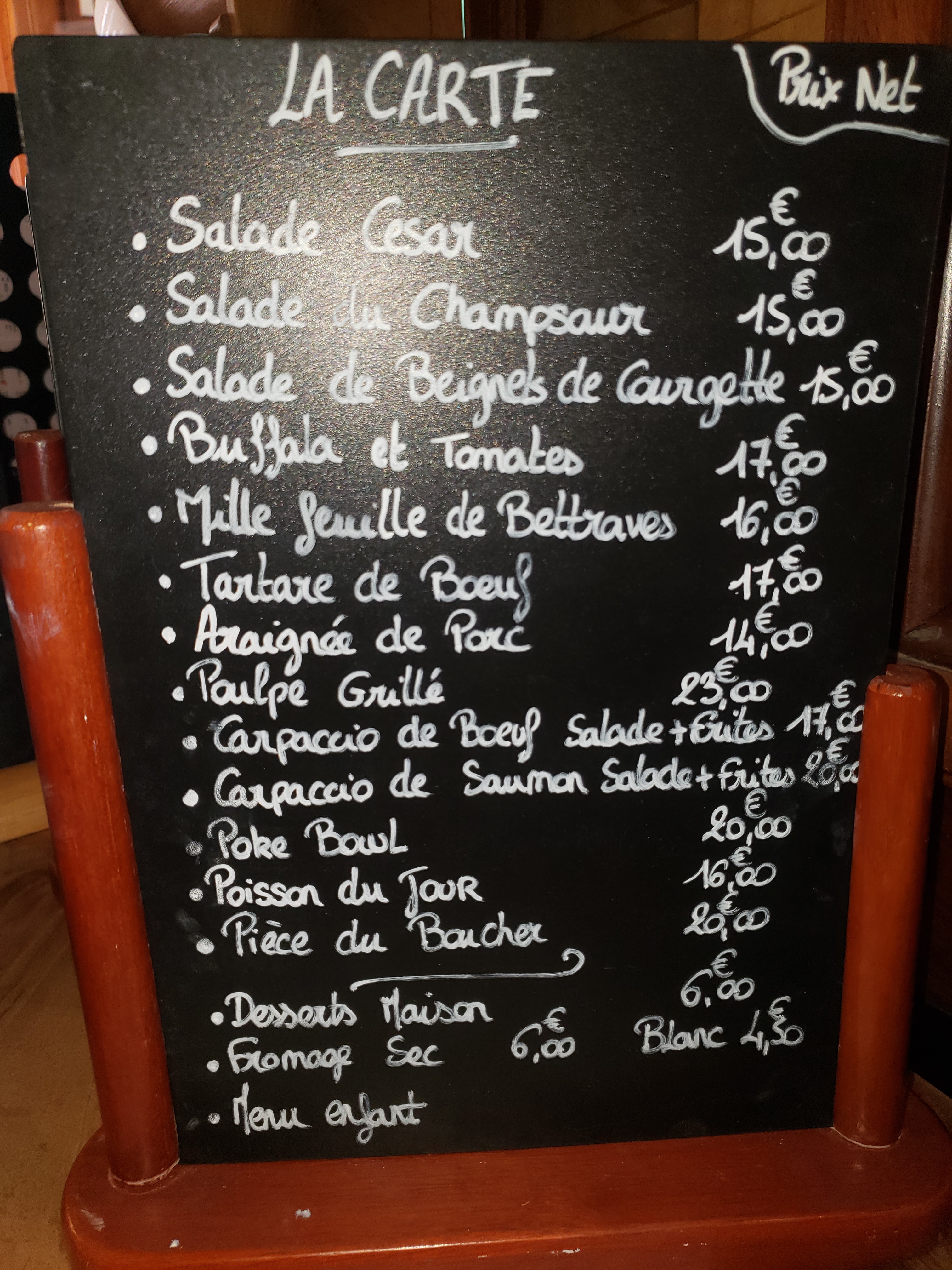 Repas du midi ( entrée + plat + dessert ). Excellent produit frais et savoureux, une cuisine simple avec goût. Tarif très raisonnable. Le cadre est parfait magnifique.