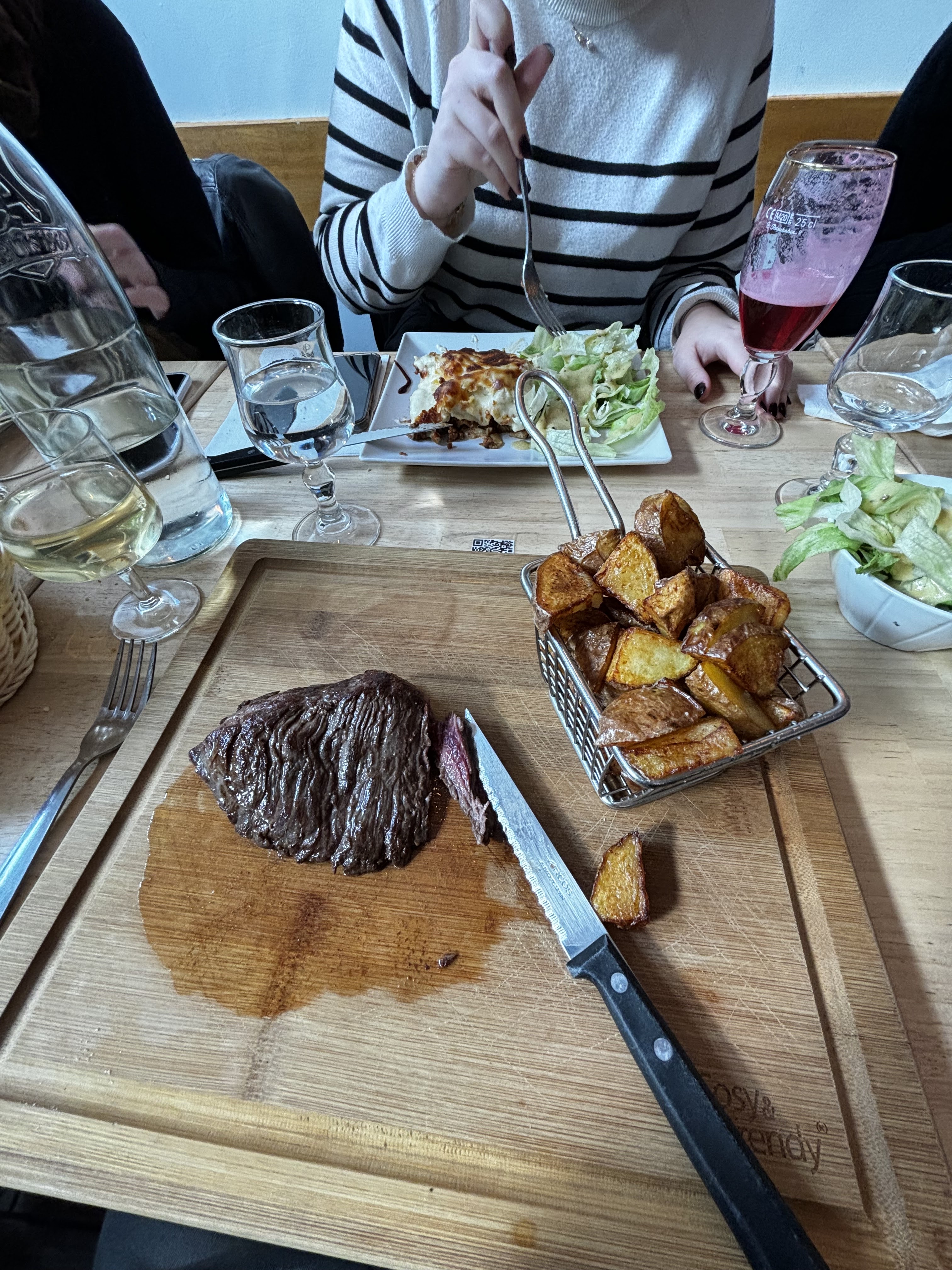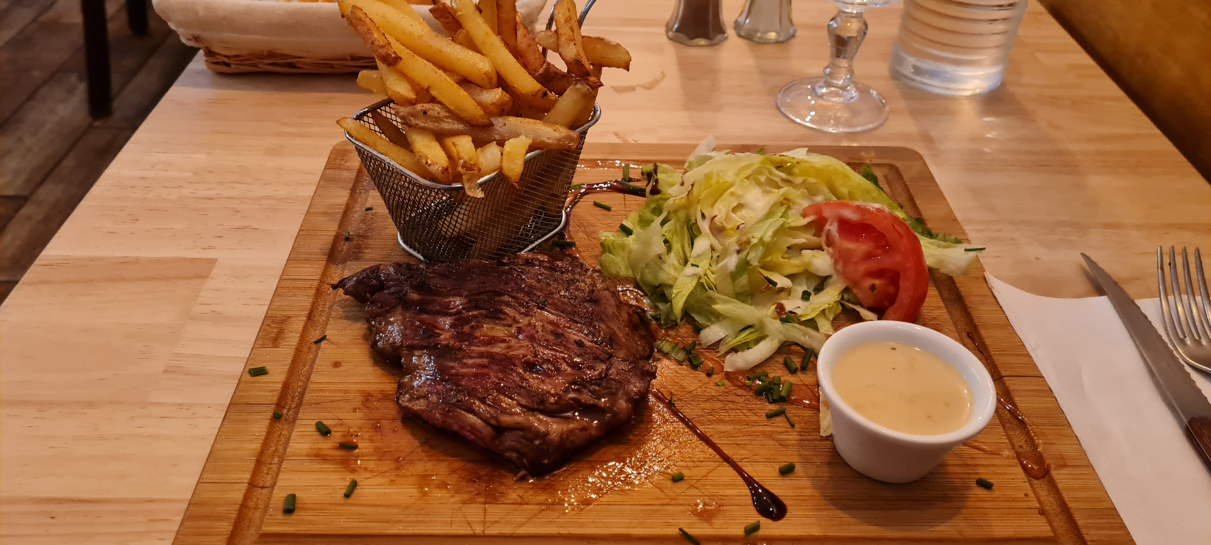 Nous avons pris une pièce du boucher. La bavette était succulente ! Tendre et tres goûteuse, frites maison délicieuses. Très bon rapport qualité prix. Je recommande En réponse à votre commentaire, j'ai bien mis 5 étoiles pour la cuisine 😉
