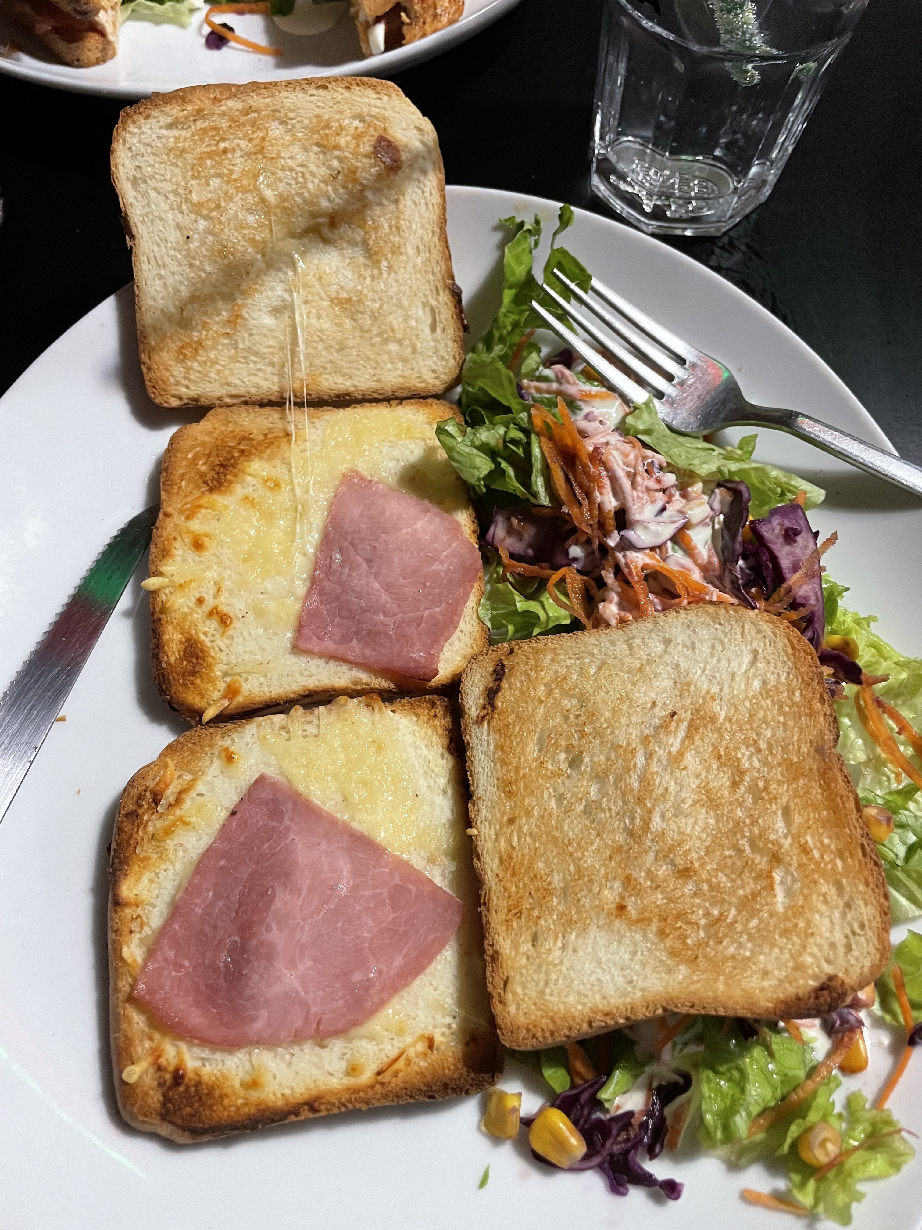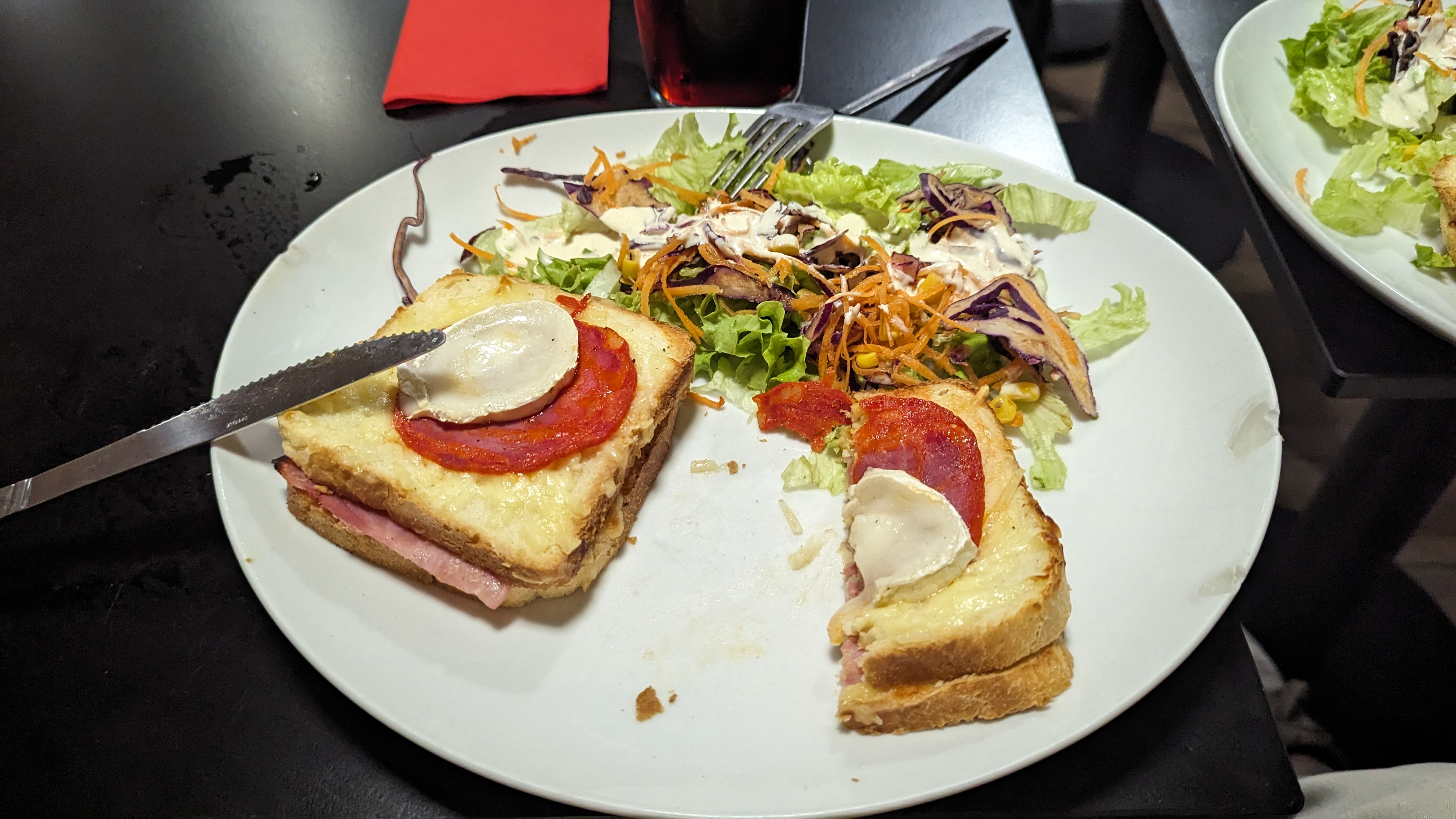 Venez savourer ce super croque-monsieur chèvre chorizo qui n'est bien évidemment pas garni de chorizo et de fromage de chèvre, mais donc plutôt un croque-monsieur jambon emmental recouvert de sa tranche de chorizo et de chèvre Servi avec une petite salade garnie de choux rouges préalablement coupés quelques jours auparavant vus sa couleur, tout cela présenté sur une superbe assiette brisée à 3 endroits. Heureusement que les serveurs sont cools.