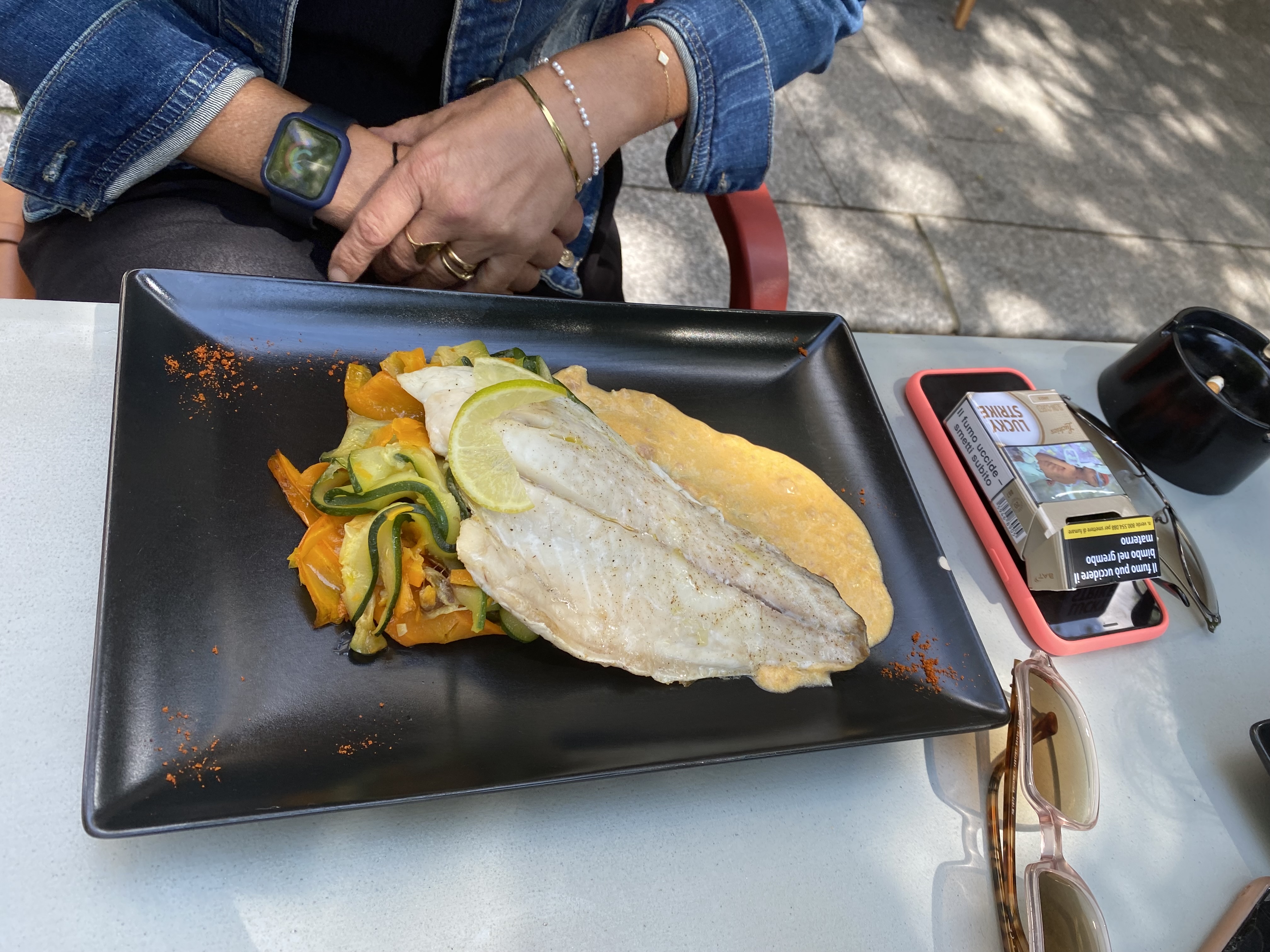 Pris ce midi filet de daurade sauce chorizo légumes façon woks.....dans mon assiette filet de daurade sauce aux lardons....tagliatelle de courgettes et carottes cuites à l'eau super pour un régime ; je suis sortie de table j'avais encore faim donc direction une boulangerie.....