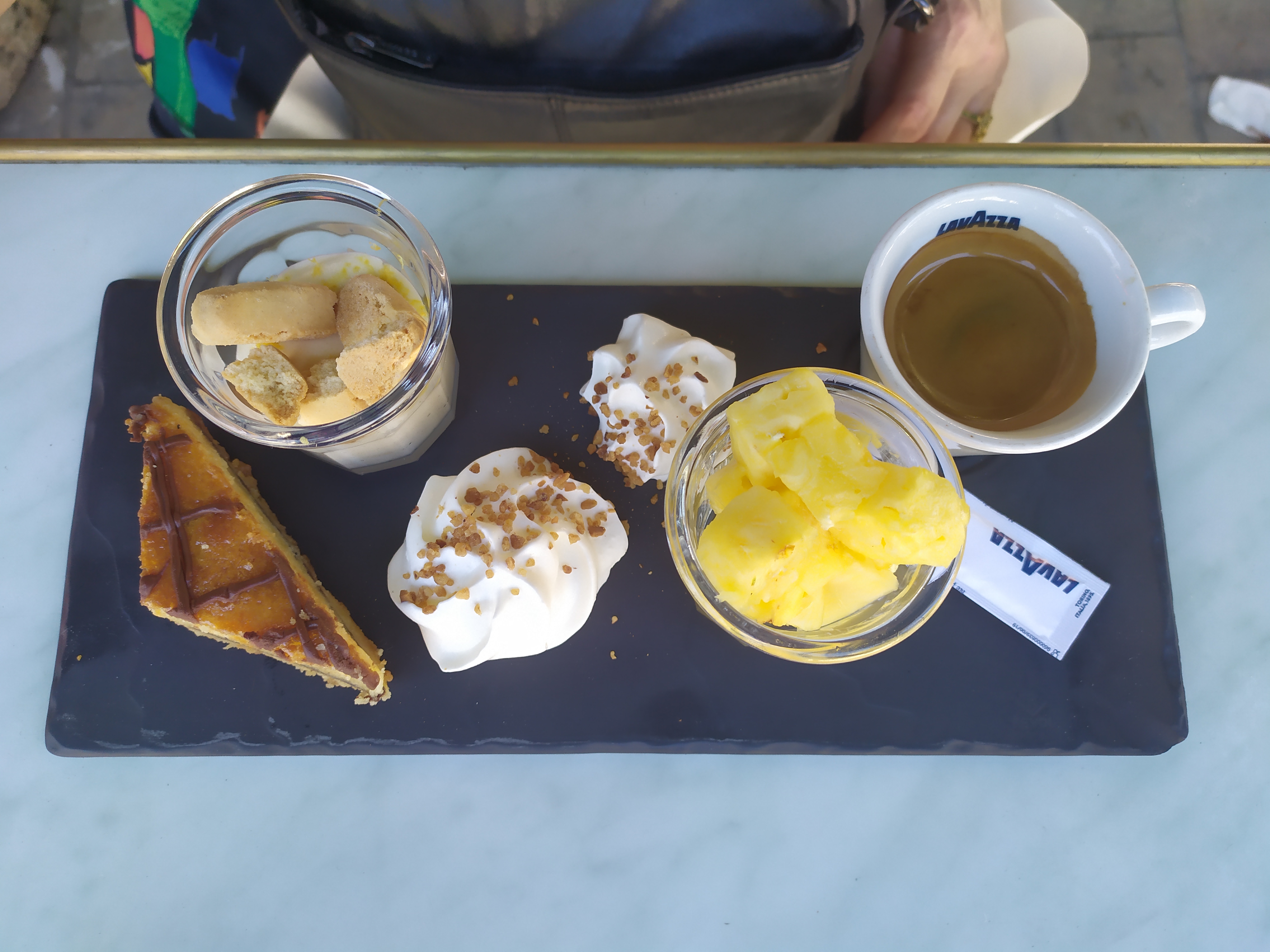 11h, la salle est complètement vide, mais on nous demande de nous asseoir à une table précise, à l'intérieur et près de la porte. Ici commence ce qui ne peut être décrit que comme une torture psychologique : les serveurs sont complètement fous, probablement en train de se dynamiser après les frivolités de la nuit précédente, faisant exploser à plein volume le bavardage russe le plus agressif jamais connu. Difficile de déguster un expresso sur ce bruit, agrémenté par nos amis paquets qui se crient « C’EST DU BON SON ÇA ». À moins que vous n’ayez envie de développer des acouphènes autour d’une tasse de café trop cher, évitez-le.