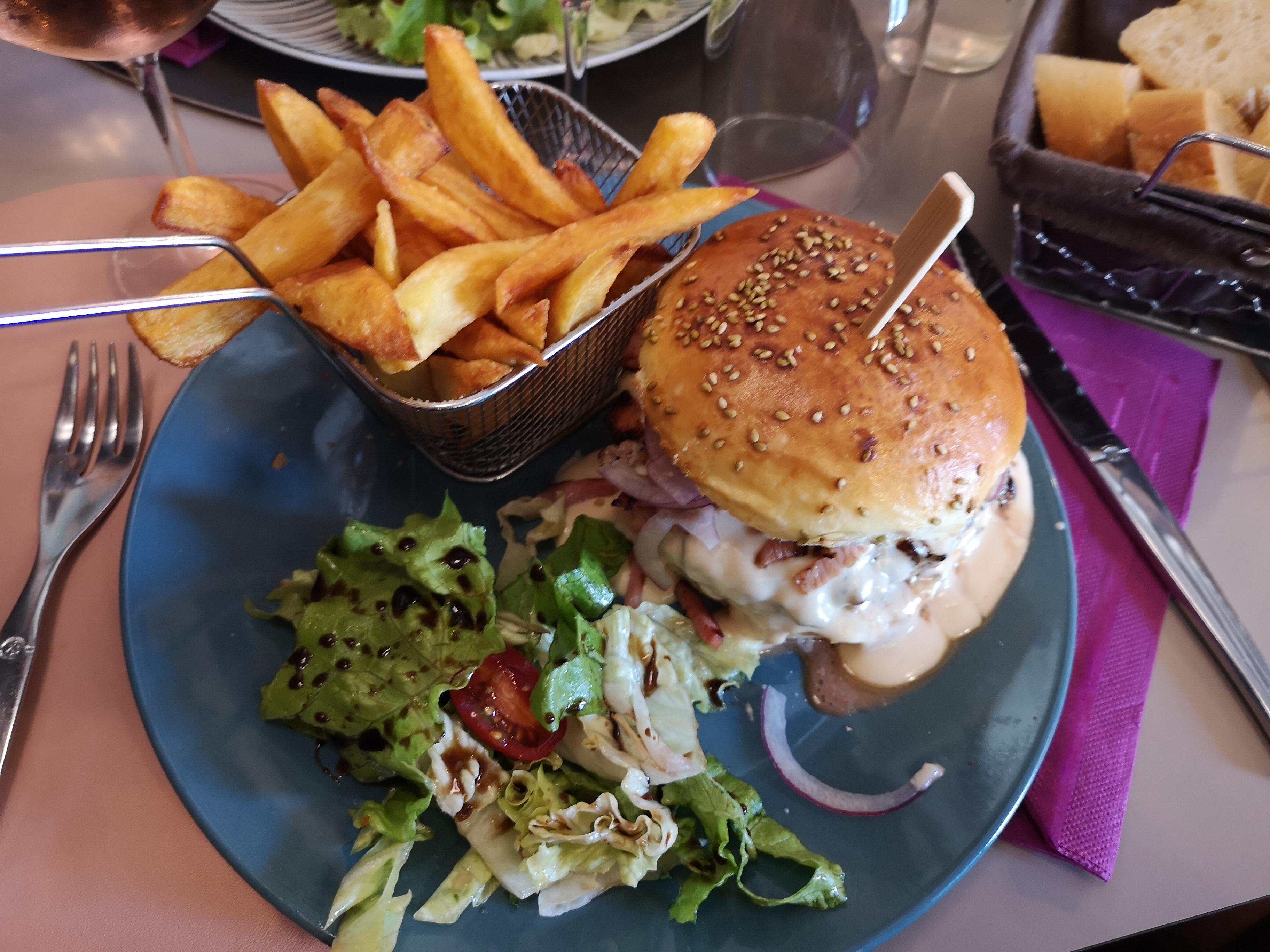 Plats commandés : hamburger camembert. Légumes frais, bon steak haché, frites maisons. Petit bémol sur la sauce au camembert un peu trop diluée à mon goût. J'ai apprécié les verres de rosé de provences Accueil : joviale et sympathique. Service rapide. Serveuse à l'écoute Très bonne expérience