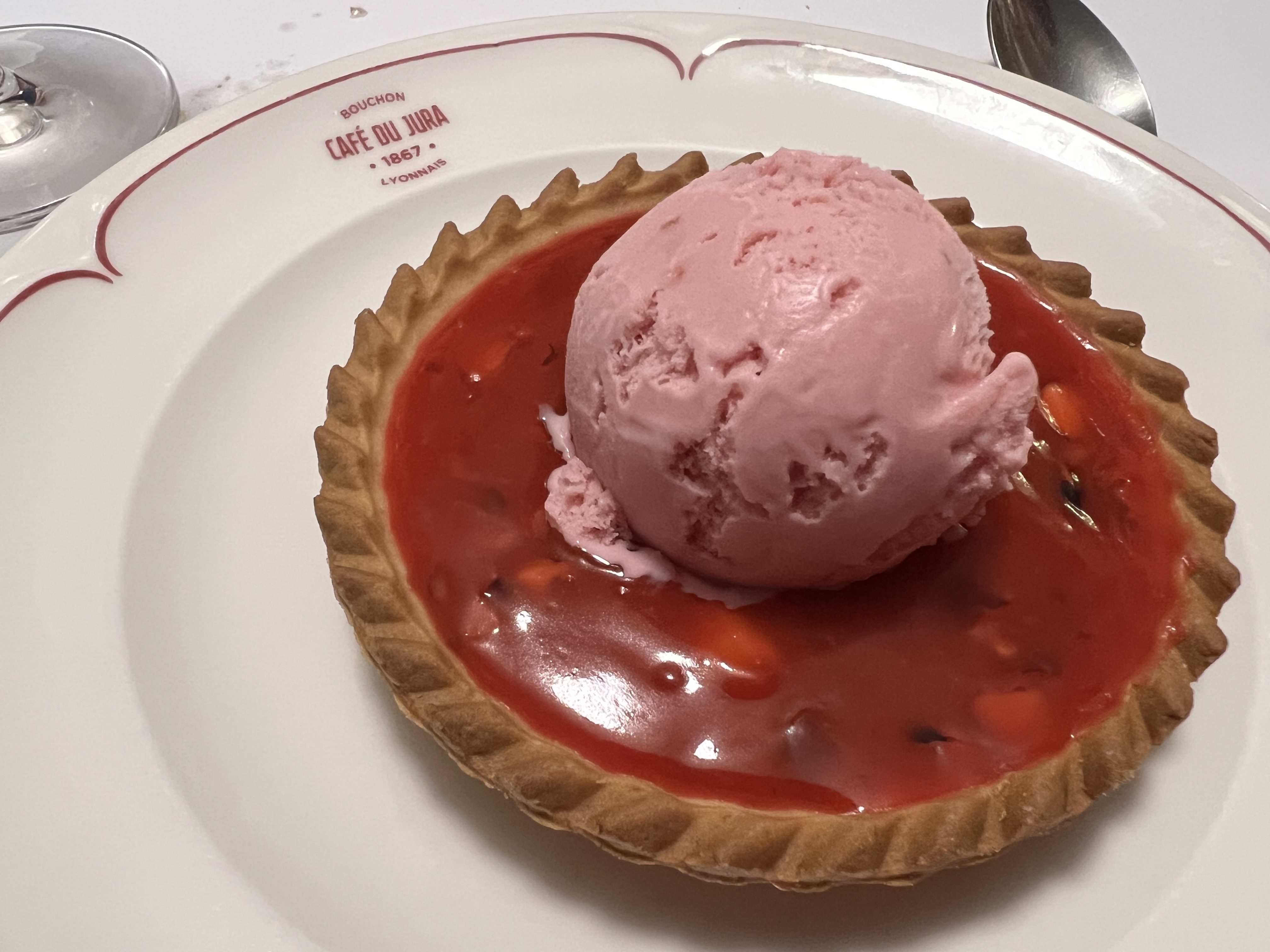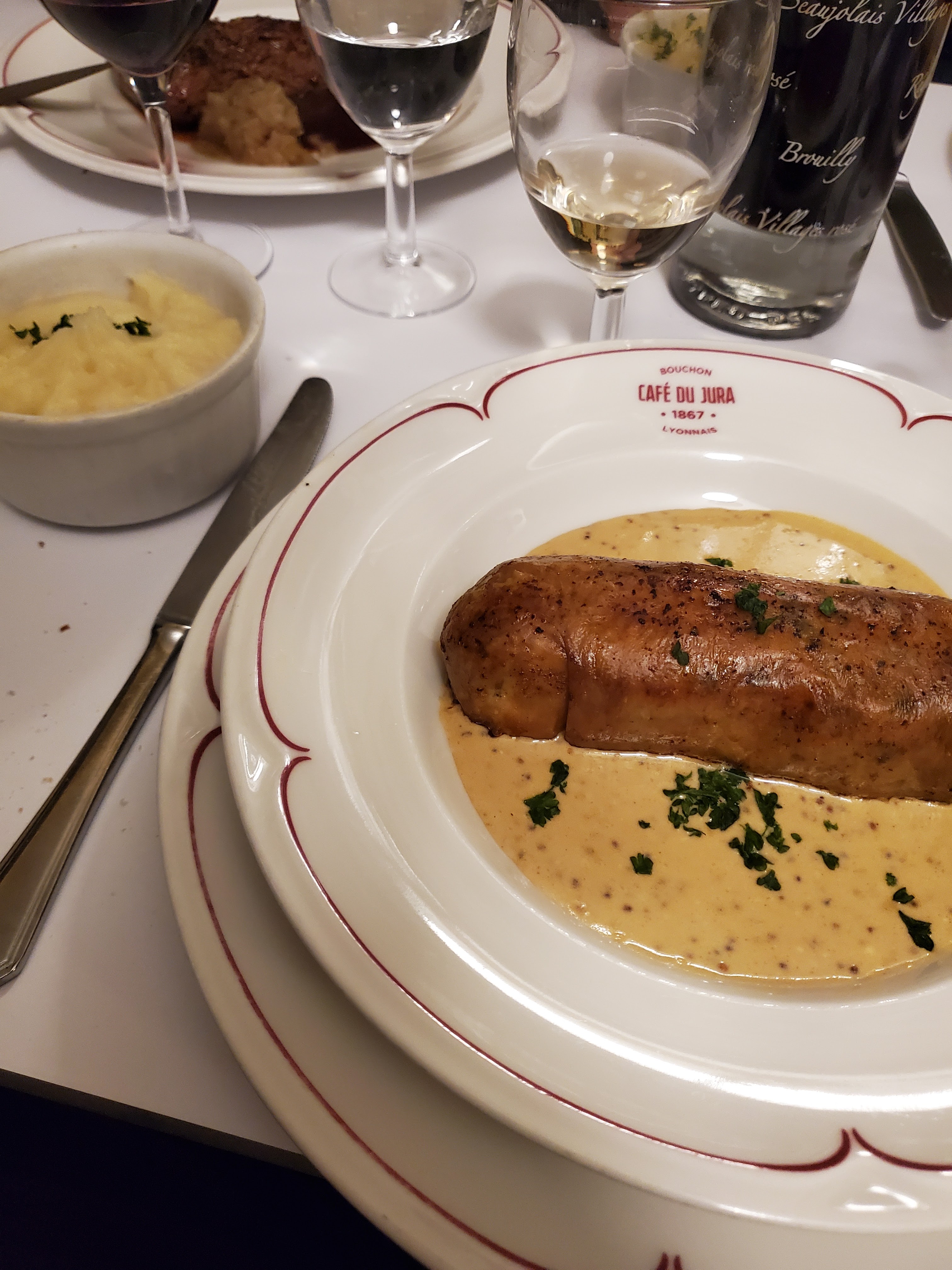 Délicieuse adresse parmi les plus anciennes de Lyon, remontant à 1867 ! Le service est fait dans la convivialité et la bonne humeur. Nous sommes tombés sur un chef de salle drôle et garantissant les sourires chez tout le monde. Il y a de quoi se régaler entre l'œuf meurette aux champignons, la frisée à la lyonnaise avec ses lardons, l'œuf poché et croûtons, le saucisson brioché au vin rouge et échalotes, l'andouillette à la fraise de veau, et le tablier de sapeur à la sauce Choron avec gratin dauphinois. La carte des vins est aussi celle de connaisseurs et on sait se faire plaisir car comme on dit à Lyon, il coule trois fleuves : le Rhône, la Saône et le beaujolais ! Je recommande hautement. À rentrer les yeux fermés en réservant à l'avance, le Café du Jura est connu des amateurs !