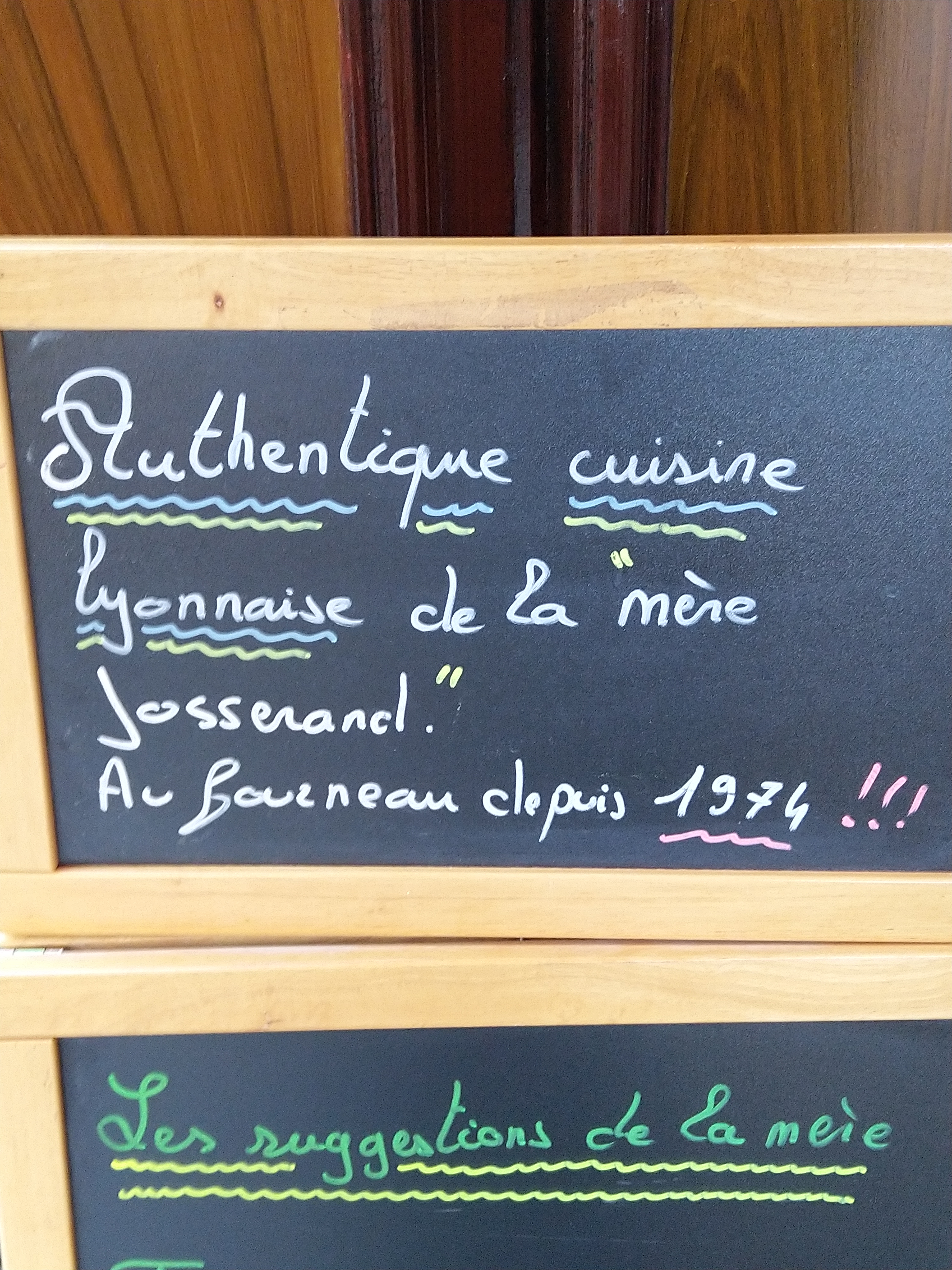 Un vrai bouchon avec de vrais gens Après s'être installé on découvre la salle en enfilade. On prend plaisir à lire les notes de la mère Josserand laissés ici et là. Puis on ouvre la carte et avec le nom des plats des souvenirs reviennent. Souvenirs de Lyon comme souvenirs de jeunesse 44ans que Mme Josserand est au fourneau : cuisine et goût viennent du cœur... Le repas se fait tandis qu'on fait connaissance avec ses voisins. On s'en va et déjà on a hâte de revenir.