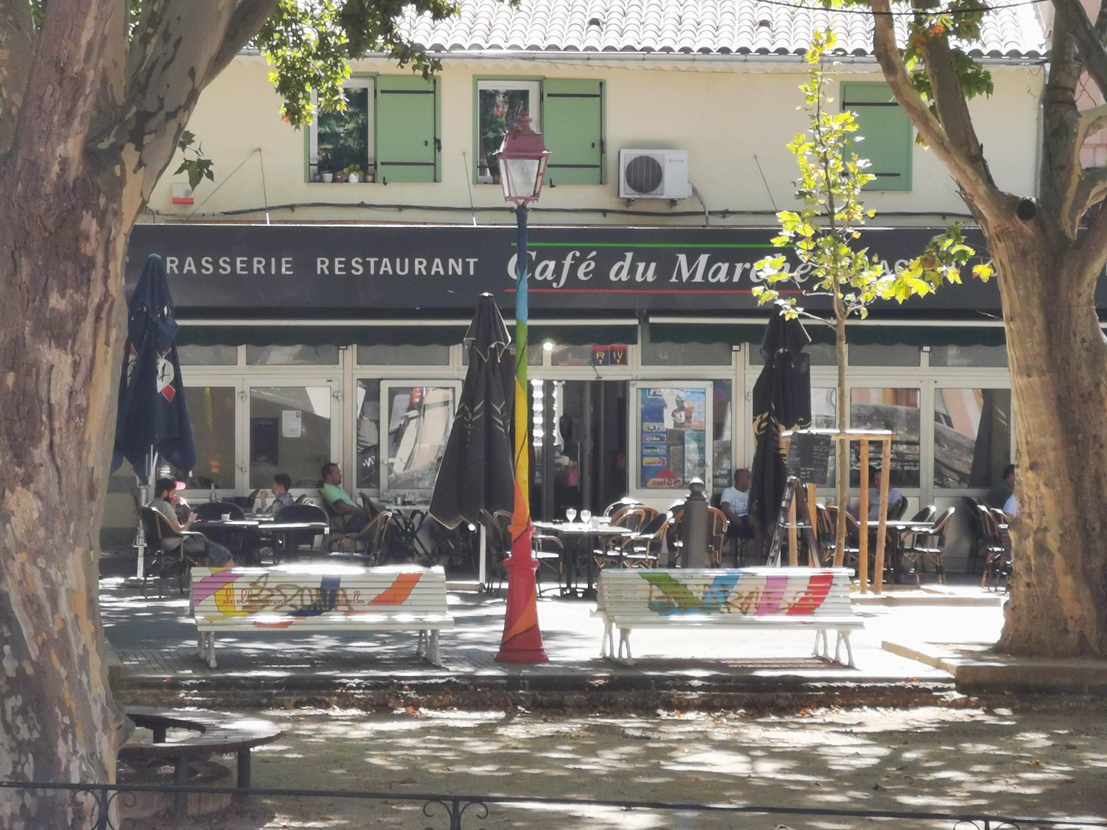 Toujours très animé , restauration le midi, pas trop bruyant au comptoir mais possibilité terrasse couverte ou sous les platanes dès que soleil.