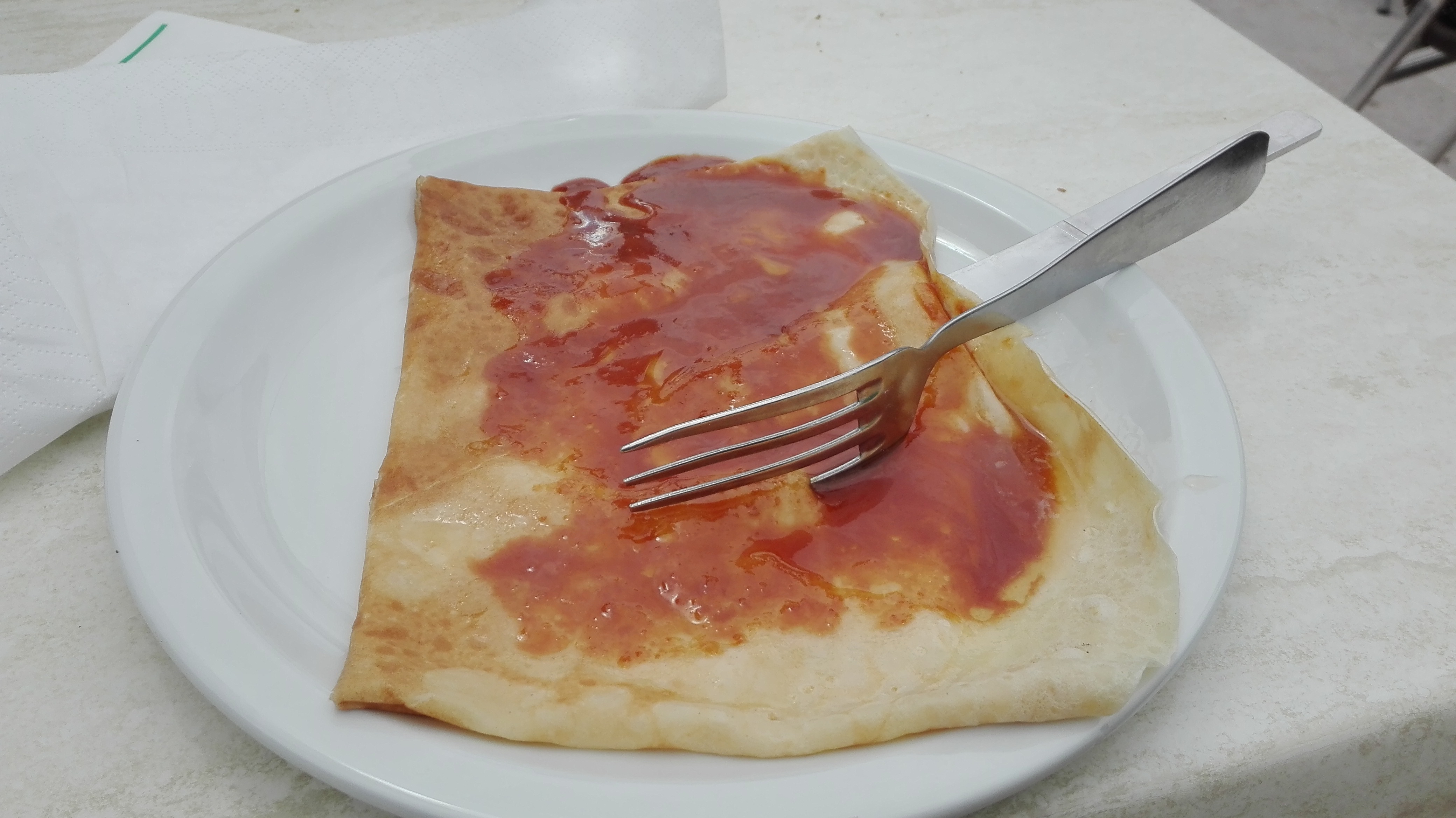 Expérience très décevante. Nous sommes 4 et arrivons à 17h40 pour prendre des crêpes en période de vacances scolaires. On nous explique qu'on pourra nous préparer seulement 2 crêpes mais que pour les boissons ça le fera. Ouf, on décide quand même de tenter l'expérience et de s'asseoir. La serveuse, très gentille au demeurant, se recoiffe les cheveux au moment de prendre notre commande. Elle nous informe qu'elle pourra finalement nous faire les 4 crêpes. Les boissons chaudes arrivent. D'une qualité lamentable. Les chocolats chauds n'ont aucun goût, on a l'impression de boire de l'eau. Heureusement que les tasses n'étaient remplies qu'à moitié. Le Capuccino était moyen. Passons aux crêpes. Elles arrivent l'une après l'autre avec un temps d'environ 5/10 minutes entre chaque. Donc impossible de manger les crêpes chaudes tous ensemble pour un goûter de vacances alors que la salle est quasiment vide. Elles nous sont servies avec des couverts en bois... qui cassent à la première utilisation. On n'avait jamais vu ça. Sommes donc dans l'obligation de demander des couverts en inox, dans un restaurant ! Les crêpes ne sont pas bonnes, dures au point qu'elles cassent comme du carton. Beaucoup trop de sucre, elles sont noyées dessous. La qualité est encore une fois catastrophique pour un restaurant qui propose pourtant ces produits à la carte. Aucune serviette servie. La carafe d'eau nous sera proposée seulement à la fin, lorsque les crêpes étaient toutes terminées. Toilettes propres. Par ailleurs, les horaires de Google ne sont pas à jour. Nous ne reviendrons pas.