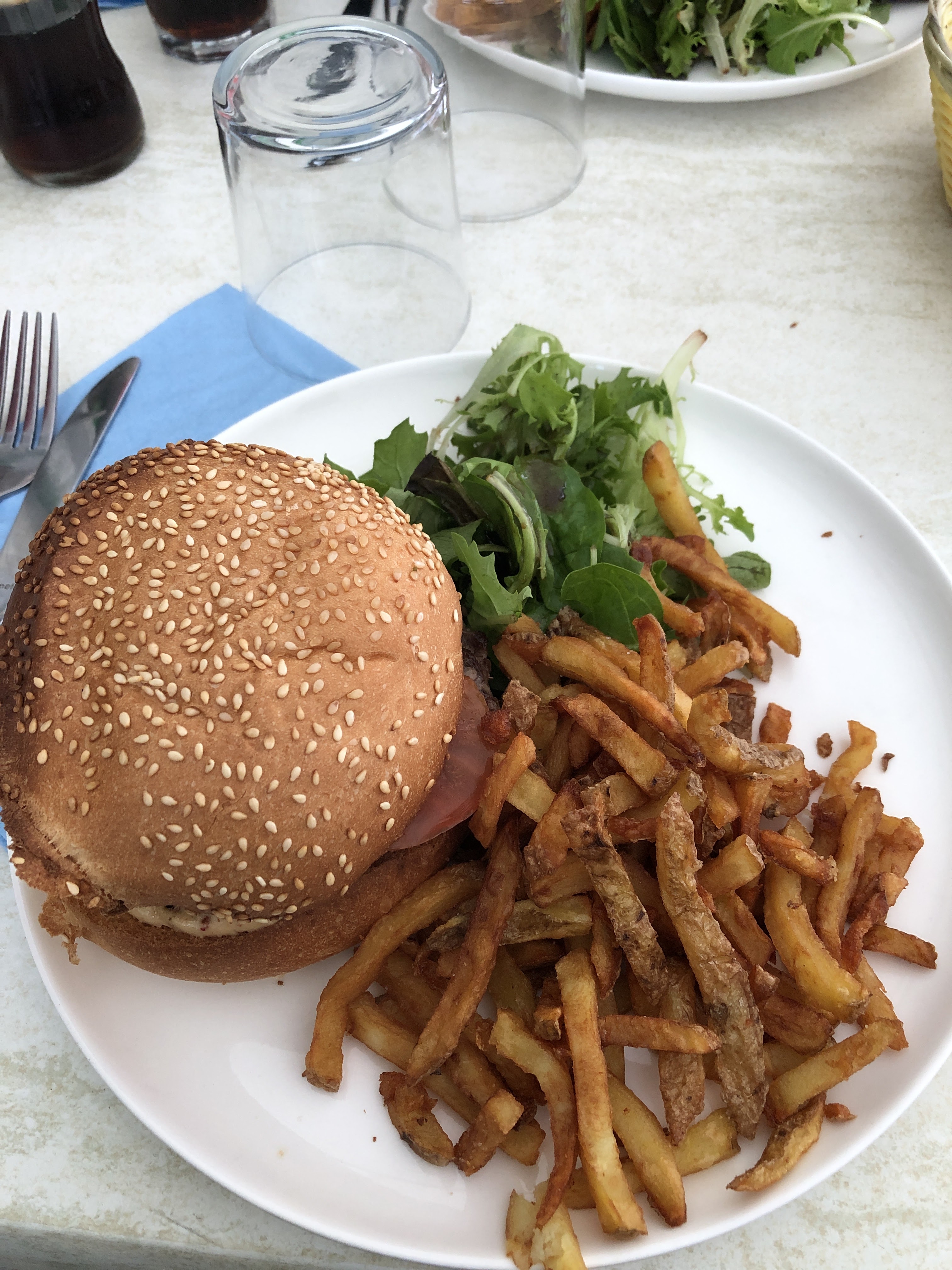 Restaurant collé au phare des baleines. Nous avons mangé des moules frites ainsi qu’un burger, copieux et bons !